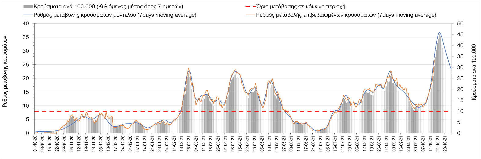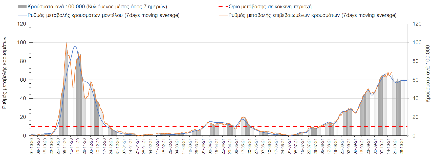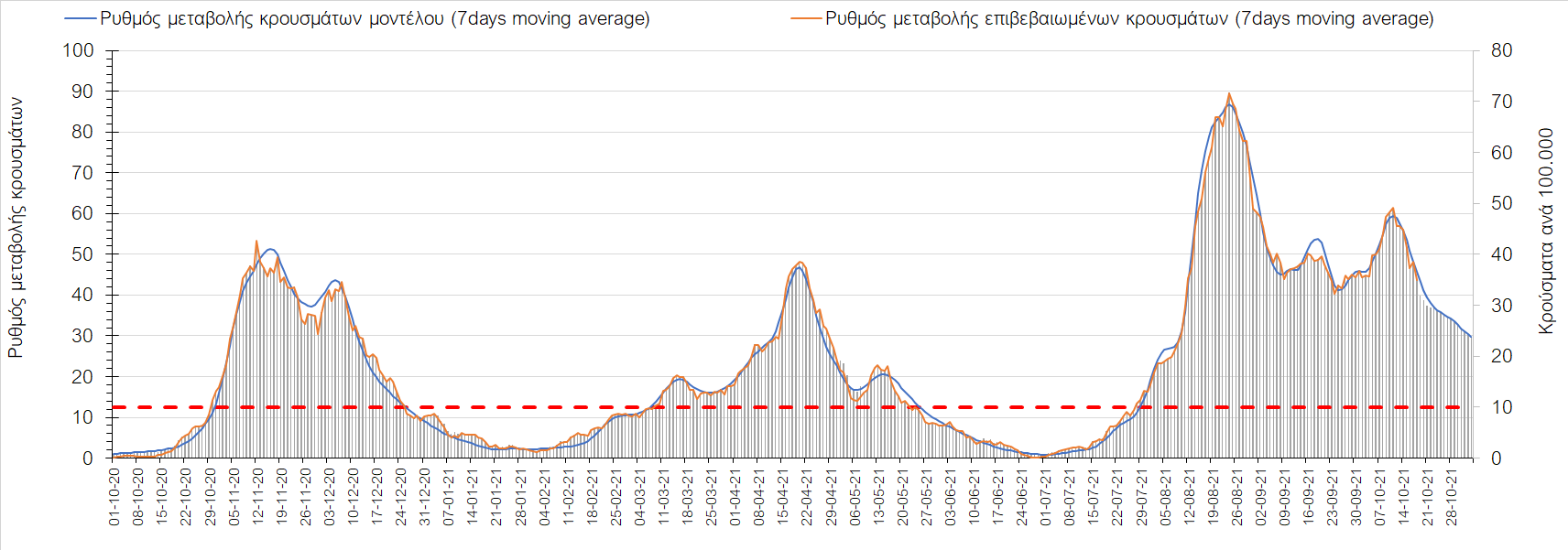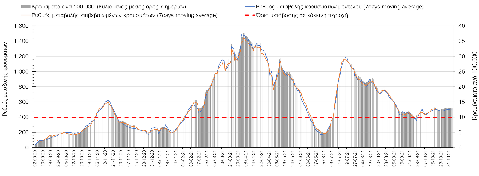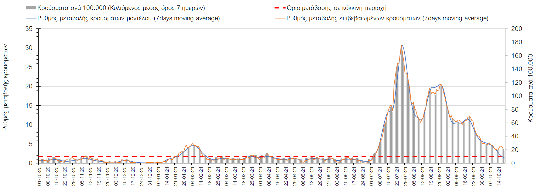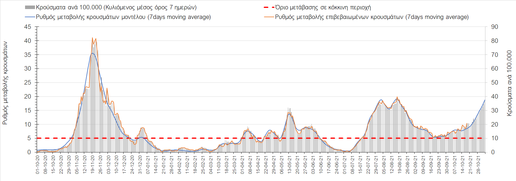 Συμπεράσματα: Με βάση τα σημερινά αποτελέσματα, σε σχέση με την Κυριακή, έχουμε μείωση του αριθμού των ασθενών σε κρίσιμη κατάσταση (διασωληνωμένοι σε ΜΕΘ), και σημαντική αύξηση των θανάτων. Σε πανελλαδικό επίπεδο ο κυλιόμενος εβδομαδιαίος μέσος όρος του δείκτη θετικότητας διαμορφώθηκε στο 1,7% (η ημερήσια τιμή είναι 4,2 %) ενώ ο κυλιόμενος εβδομαδιαίος μέσος όρος του πραγματικού αριθμού αναπαραγωγής Rt (δηλαδή ο αριθμός των ατόμων που ένας φορέας μπορεί να επιμολύνει) αυξήθηκε σημαντικά στο 1,12 (Rt πάνω από τη μονάδα υποδηλώνει καθαρή αύξηση της διασποράς του ιού στην κοινότητα). Συνολικά η κυμαινόμενη τάση των τελευταίων ημερών αντικατοπτρίζεται και από τον ημερήσιο αριθμό των κρουσμάτων (κυλιόμενος μέσος όρος 7 ημερών), ο οποίος ξεπέρασε τα 2500 (2551). Γενικά την τελευταία εβδομάδα η ήπια αύξηση του αριθμού κρουσμάτων (κυλιόμενος μέσος όρος 7 ημερών) φαίνεται να μεταβαίνει σε λίγο εντονότερο ρυθμό ανόδου, τον οποίο αναμέναμε μετά τα μέσα Οκτώβρη.
