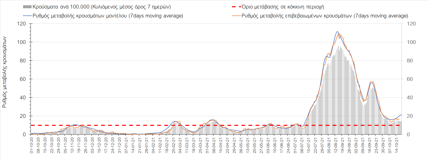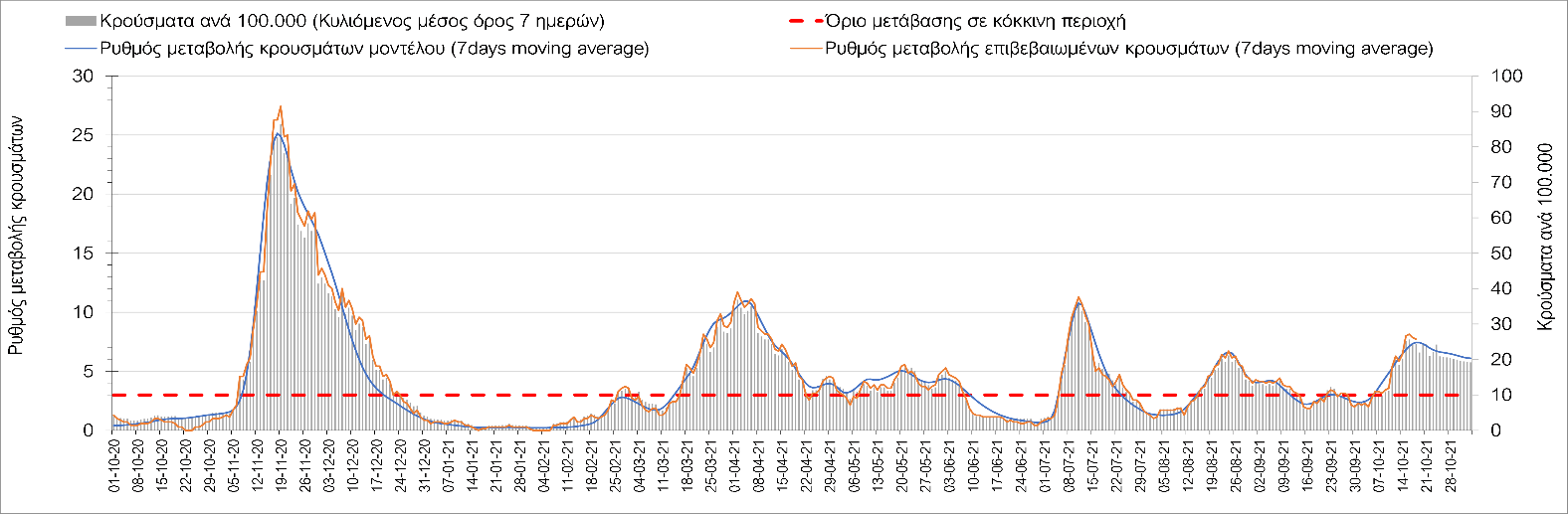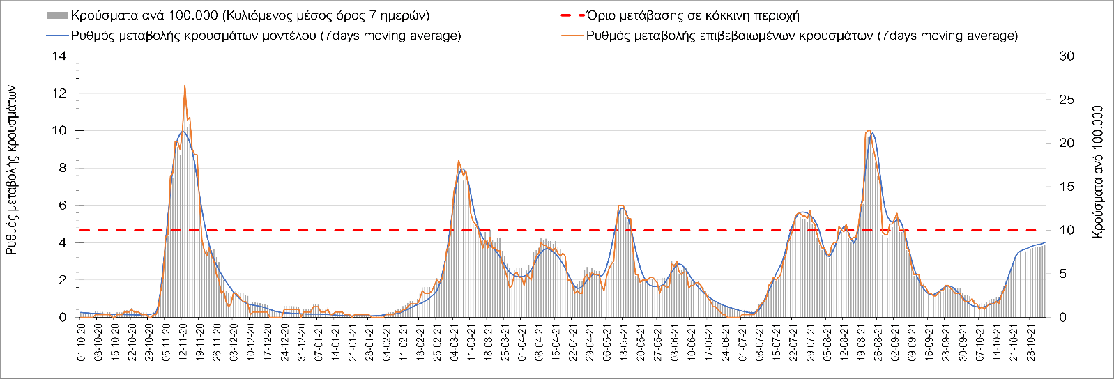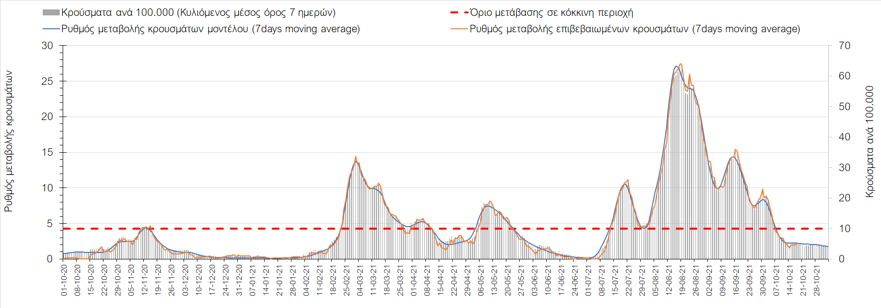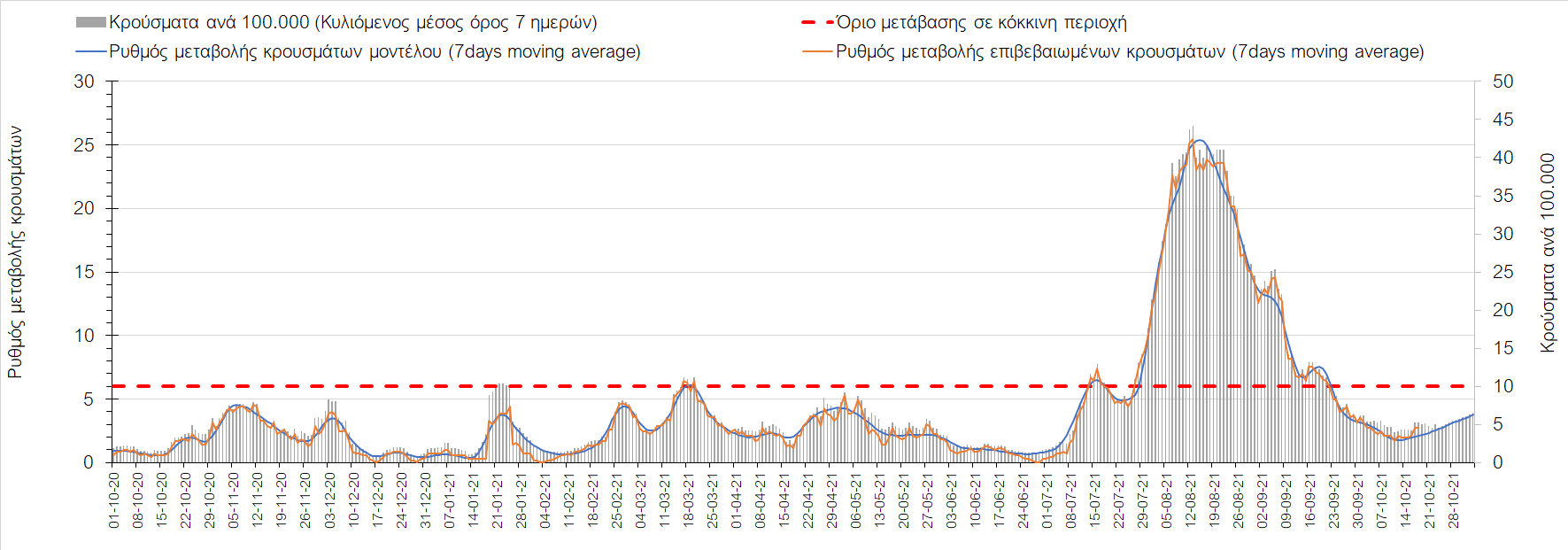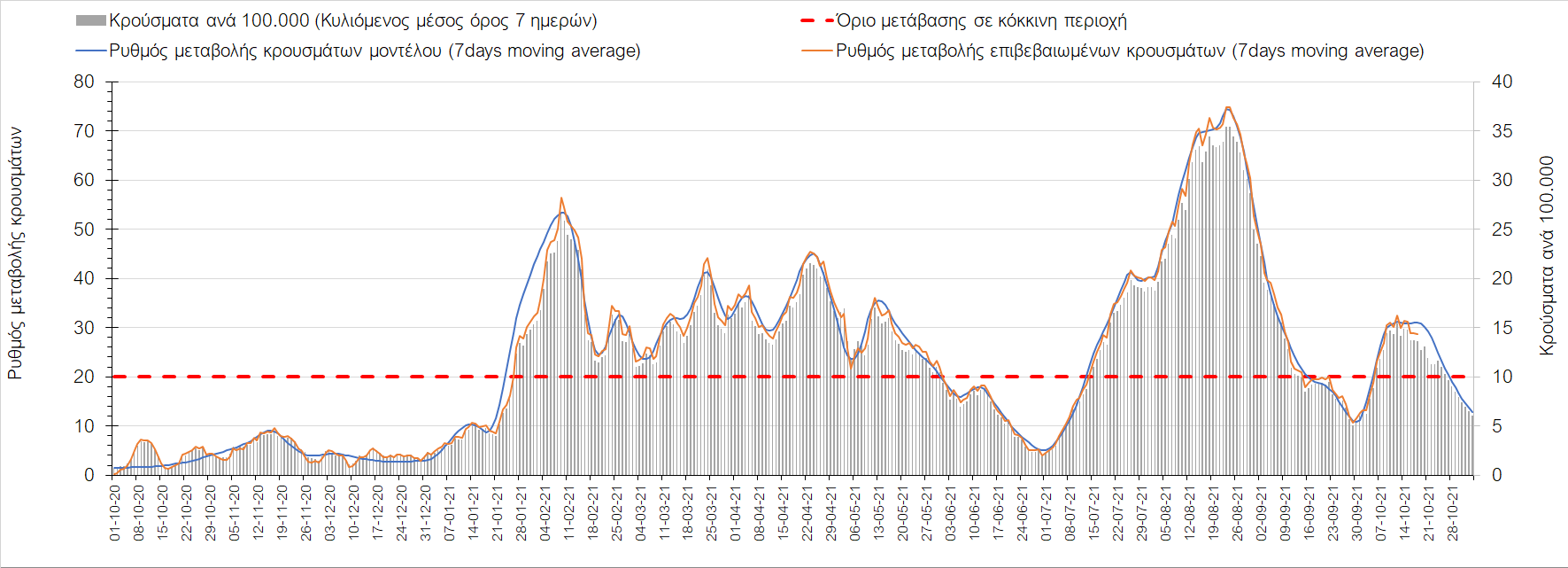 Συμπεράσματα: Με βάση τα σημερινά αποτελέσματα, σε σχέση με την Κυριακή, έχουμε μείωση του αριθμού των ασθενών σε κρίσιμη κατάσταση (διασωληνωμένοι σε ΜΕΘ), και σημαντική αύξηση των θανάτων. Σε πανελλαδικό επίπεδο ο κυλιόμενος εβδομαδιαίος μέσος όρος του δείκτη θετικότητας διαμορφώθηκε στο 1,7% (η ημερήσια τιμή είναι 4,2 %) ενώ ο κυλιόμενος εβδομαδιαίος μέσος όρος του πραγματικού αριθμού αναπαραγωγής Rt (δηλαδή ο αριθμός των ατόμων που ένας φορέας μπορεί να επιμολύνει) αυξήθηκε σημαντικά στο 1,12 (Rt πάνω από τη μονάδα υποδηλώνει καθαρή αύξηση της διασποράς του ιού στην κοινότητα). Συνολικά η κυμαινόμενη τάση των τελευταίων ημερών αντικατοπτρίζεται και από τον ημερήσιο αριθμό των κρουσμάτων (κυλιόμενος μέσος όρος 7 ημερών), ο οποίος ξεπέρασε τα 2500 (2551). Γενικά την τελευταία εβδομάδα η ήπια αύξηση του αριθμού κρουσμάτων (κυλιόμενος μέσος όρος 7 ημερών) φαίνεται να μεταβαίνει σε λίγο εντονότερο ρυθμό ανόδου, τον οποίο αναμέναμε μετά τα μέσα Οκτώβρη.