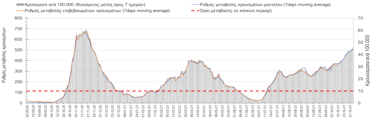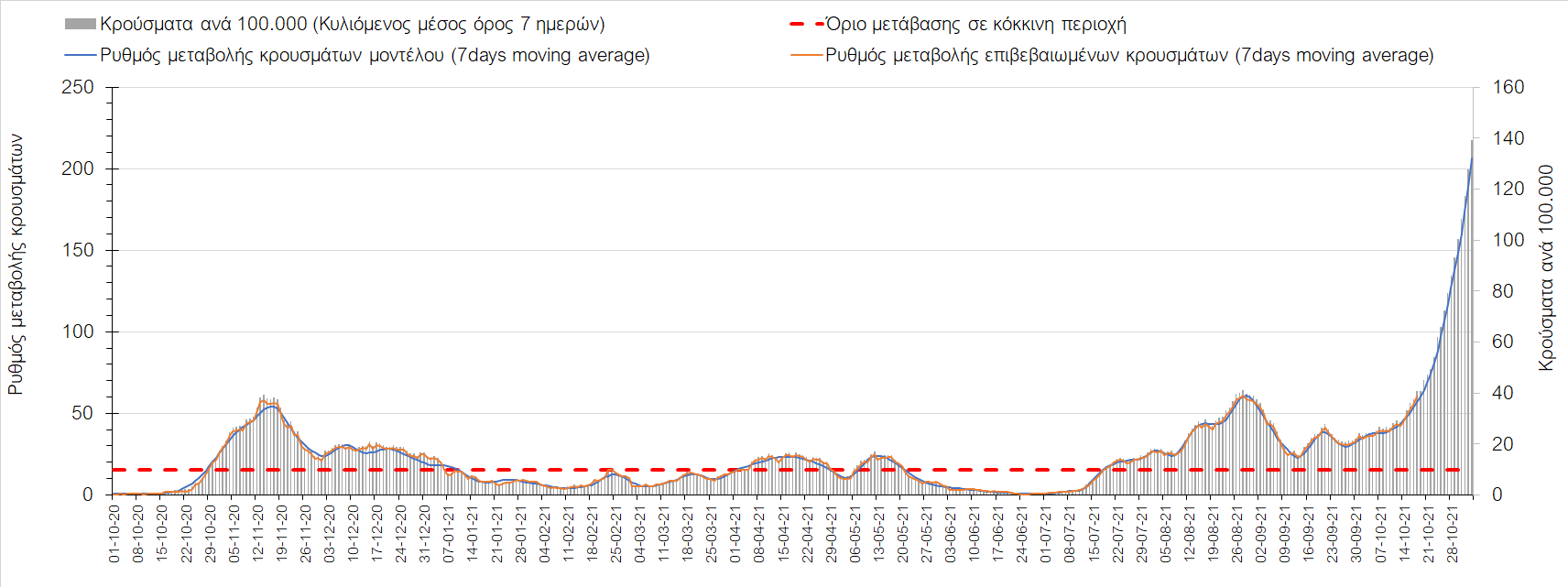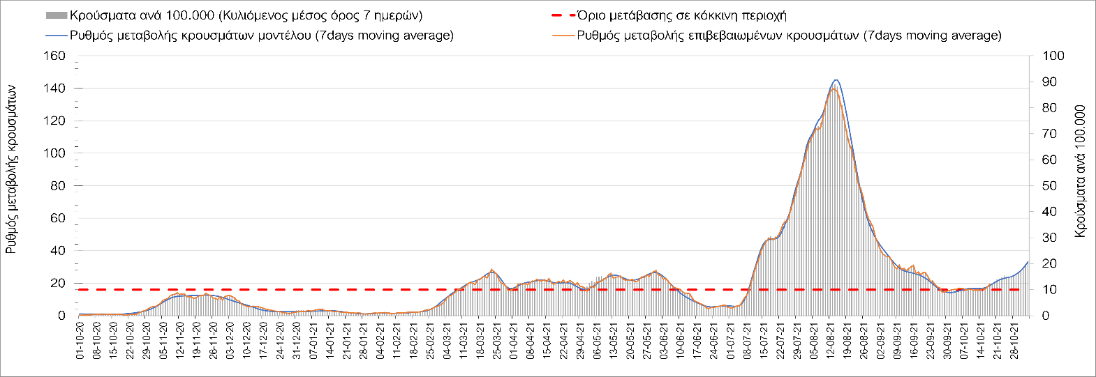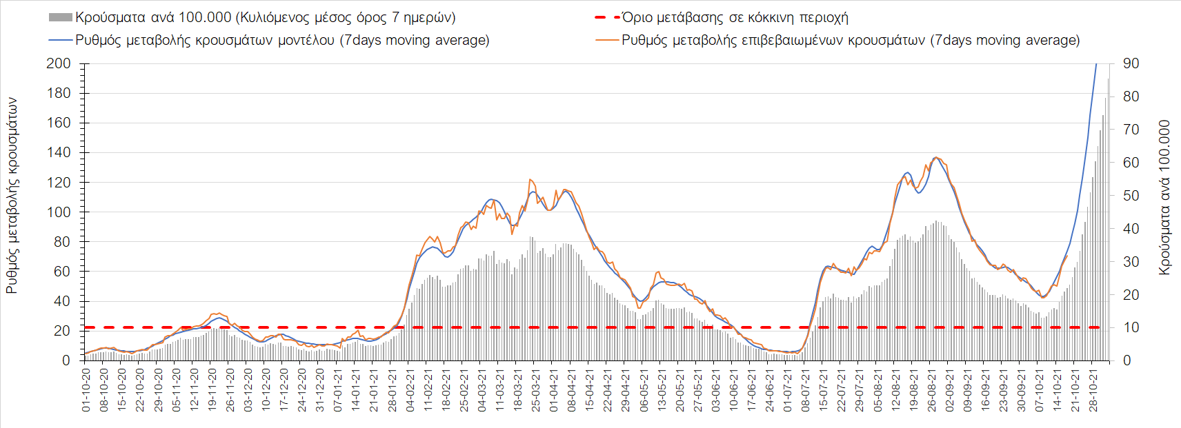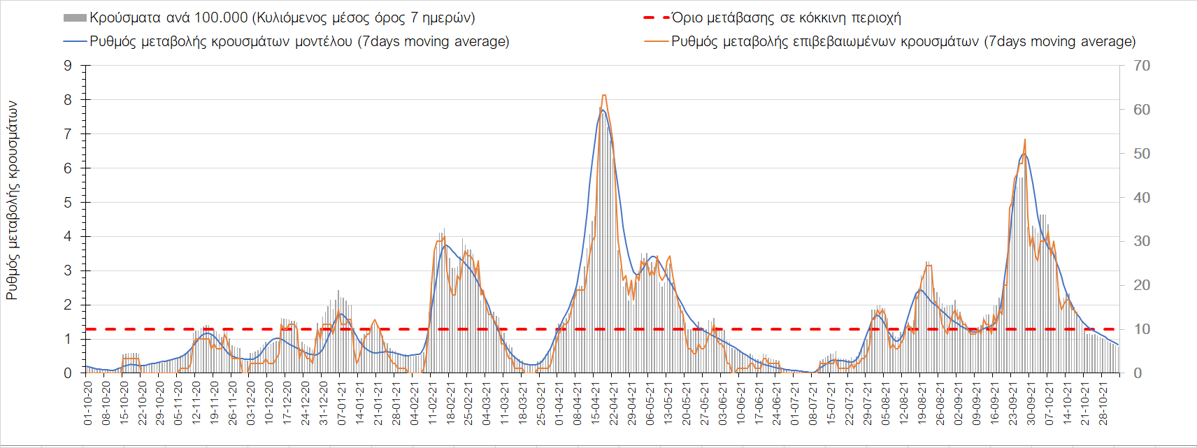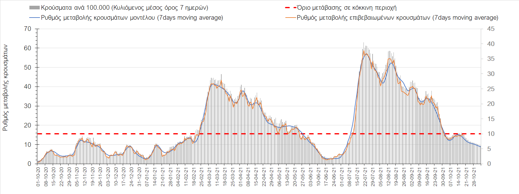Συμπεράσματα: Με βάση τα σημερινά αποτελέσματα, σε σχέση με την Κυριακή, έχουμε μείωση του αριθμού των ασθενών σε κρίσιμη κατάσταση (διασωληνωμένοι σε ΜΕΘ), και σημαντική αύξηση των θανάτων. Σε πανελλαδικό επίπεδο ο κυλιόμενος εβδομαδιαίος μέσος όρος του δείκτη θετικότητας διαμορφώθηκε στο 1,7% (η ημερήσια τιμή είναι 4,2 %) ενώ ο κυλιόμενος εβδομαδιαίος μέσος όρος του πραγματικού αριθμού αναπαραγωγής Rt (δηλαδή ο αριθμός των ατόμων που ένας φορέας μπορεί να επιμολύνει) αυξήθηκε σημαντικά στο 1,12 (Rt πάνω από τη μονάδα υποδηλώνει καθαρή αύξηση της διασποράς του ιού στην κοινότητα). Συνολικά η κυμαινόμενη τάση των τελευταίων ημερών αντικατοπτρίζεται και από τον ημερήσιο αριθμό των κρουσμάτων (κυλιόμενος μέσος όρος 7 ημερών), ο οποίος ξεπέρασε τα 2500 (2551). Γενικά την τελευταία εβδομάδα η ήπια αύξηση του αριθμού κρουσμάτων (κυλιόμενος μέσος όρος 7 ημερών) φαίνεται να μεταβαίνει σε λίγο εντονότερο ρυθμό ανόδου, τον οποίο αναμέναμε μετά τα μέσα Οκτώβρη.
