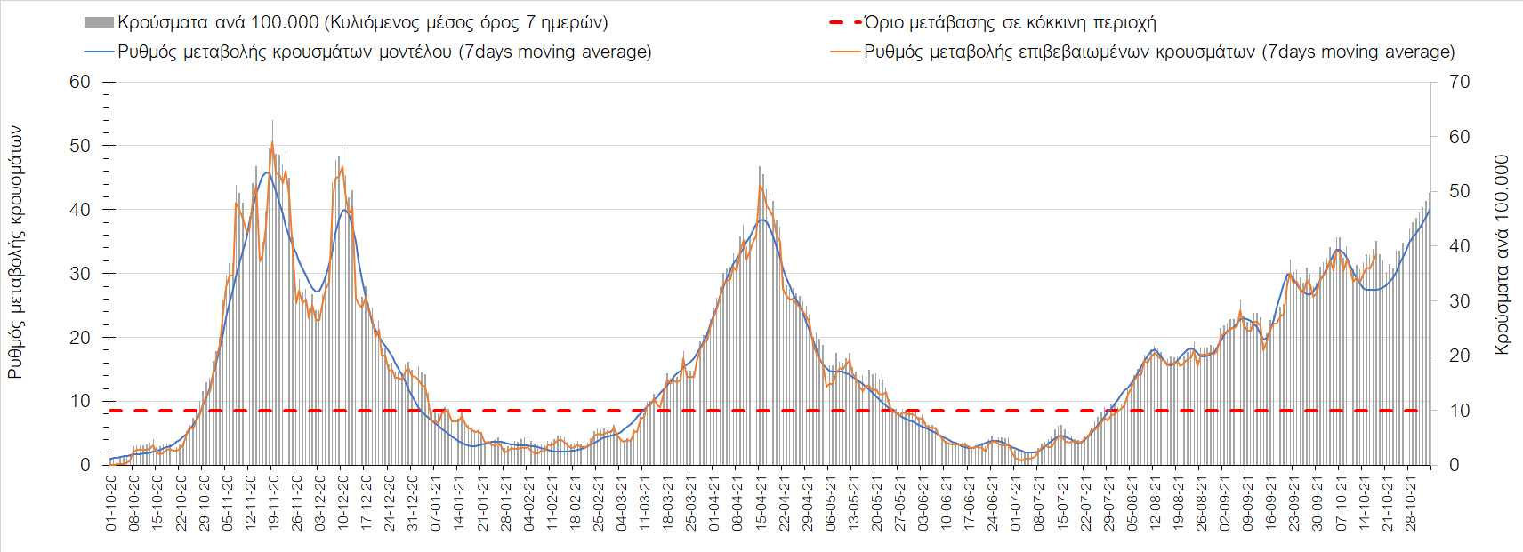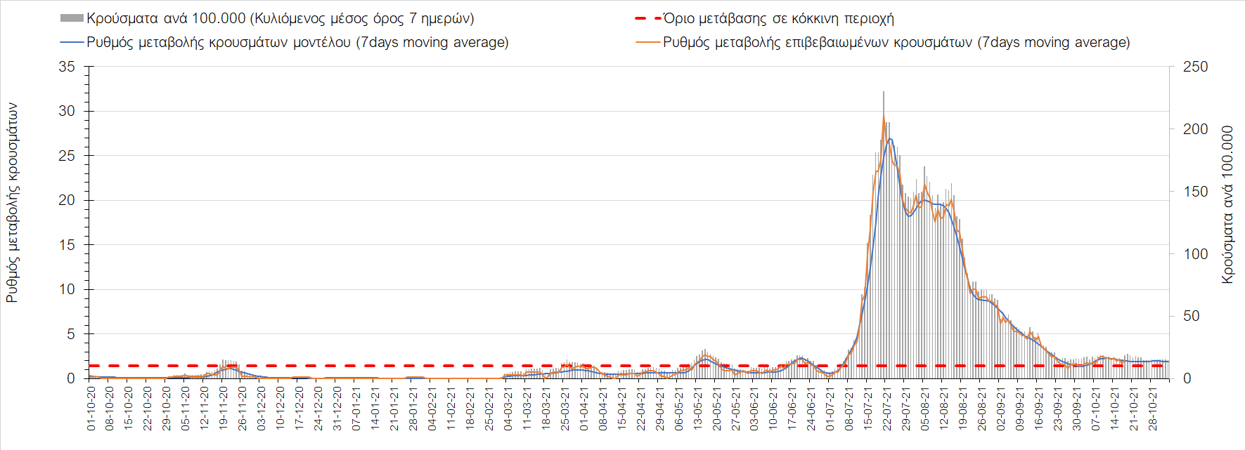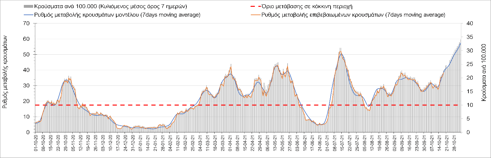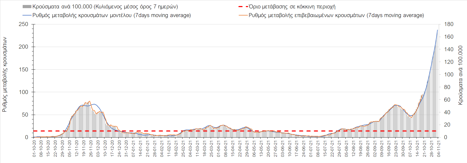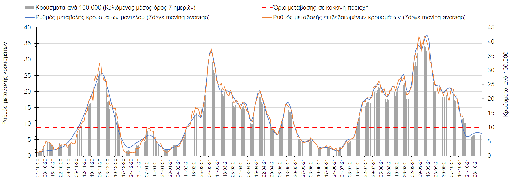 Συμπεράσματα: Με βάση τα σημερινά αποτελέσματα, σε σχέση με την Κυριακή, έχουμε μείωση του αριθμού των ασθενών σε κρίσιμη κατάσταση (διασωληνωμένοι σε ΜΕΘ), και σημαντική αύξηση των θανάτων. Σε πανελλαδικό επίπεδο ο κυλιόμενος εβδομαδιαίος μέσος όρος του δείκτη θετικότητας διαμορφώθηκε στο 1,7% (η ημερήσια τιμή είναι 4,2 %) ενώ ο κυλιόμενος εβδομαδιαίος μέσος όρος του πραγματικού αριθμού αναπαραγωγής Rt (δηλαδή ο αριθμός των ατόμων που ένας φορέας μπορεί να επιμολύνει) αυξήθηκε σημαντικά στο 1,12 (Rt πάνω από τη μονάδα υποδηλώνει καθαρή αύξηση της διασποράς του ιού στην κοινότητα). Συνολικά η κυμαινόμενη τάση των τελευταίων ημερών αντικατοπτρίζεται και από τον ημερήσιο αριθμό των κρουσμάτων (κυλιόμενος μέσος όρος 7 ημερών), ο οποίος ξεπέρασε τα 2500 (2551). Γενικά την τελευταία εβδομάδα η ήπια αύξηση του αριθμού κρουσμάτων (κυλιόμενος μέσος όρος 7 ημερών) φαίνεται να μεταβαίνει σε λίγο εντονότερο ρυθμό ανόδου, τον οποίο αναμέναμε μετά τα μέσα Οκτώβρη.
