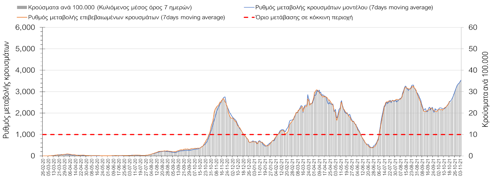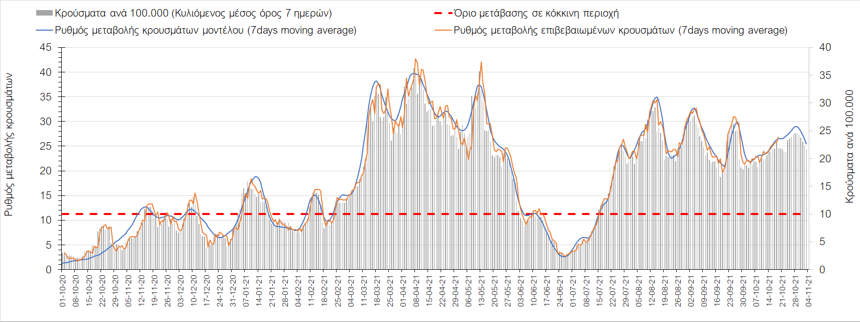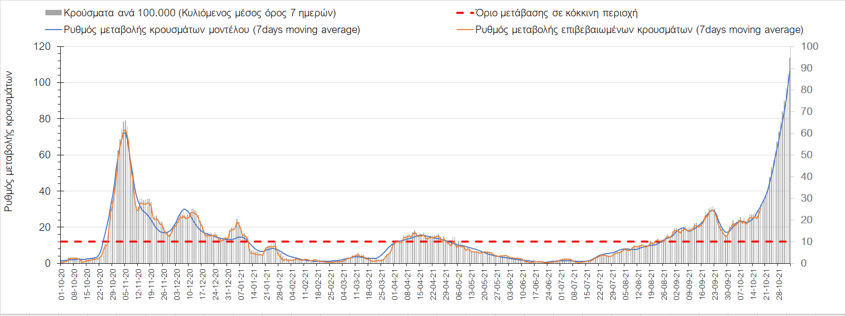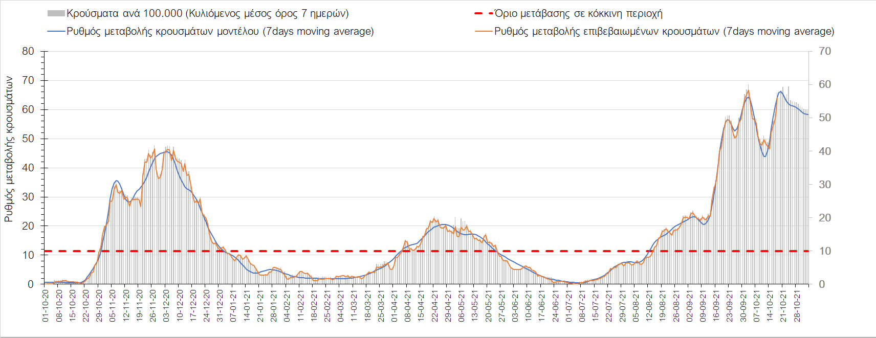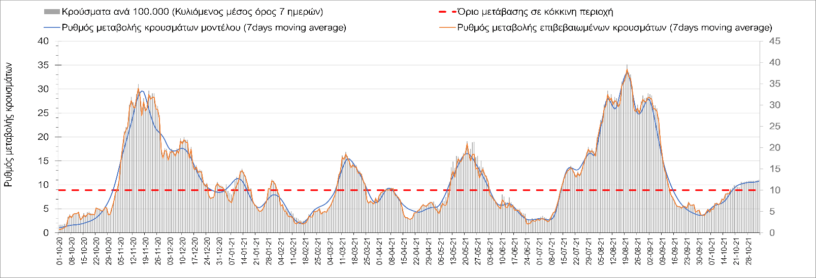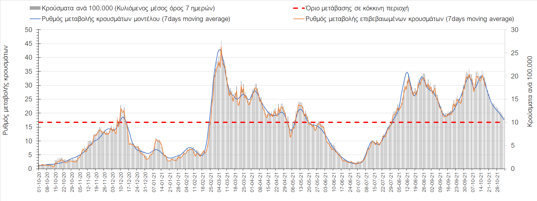 Συμπεράσματα: Με βάση τα σημερινά αποτελέσματα, σε σχέση με την Κυριακή, έχουμε μείωση του αριθμού των ασθενών σε κρίσιμη κατάσταση (διασωληνωμένοι σε ΜΕΘ), και σημαντική αύξηση των θανάτων. Σε πανελλαδικό επίπεδο ο κυλιόμενος εβδομαδιαίος μέσος όρος του δείκτη θετικότητας διαμορφώθηκε στο 1,7% (η ημερήσια τιμή είναι 4,2 %) ενώ ο κυλιόμενος εβδομαδιαίος μέσος όρος του πραγματικού αριθμού αναπαραγωγής Rt (δηλαδή ο αριθμός των ατόμων που ένας φορέας μπορεί να επιμολύνει) αυξήθηκε σημαντικά στο 1,12 (Rt πάνω από τη μονάδα υποδηλώνει καθαρή αύξηση της διασποράς του ιού στην κοινότητα). Συνολικά η κυμαινόμενη τάση των τελευταίων ημερών αντικατοπτρίζεται και από τον ημερήσιο αριθμό των κρουσμάτων (κυλιόμενος μέσος όρος 7 ημερών), ο οποίος ξεπέρασε τα 2500 (2551). Γενικά την τελευταία εβδομάδα η ήπια αύξηση του αριθμού κρουσμάτων (κυλιόμενος μέσος όρος 7 ημερών) φαίνεται να μεταβαίνει σε λίγο εντονότερο ρυθμό ανόδου, τον οποίο αναμέναμε μετά τα μέσα Οκτώβρη.