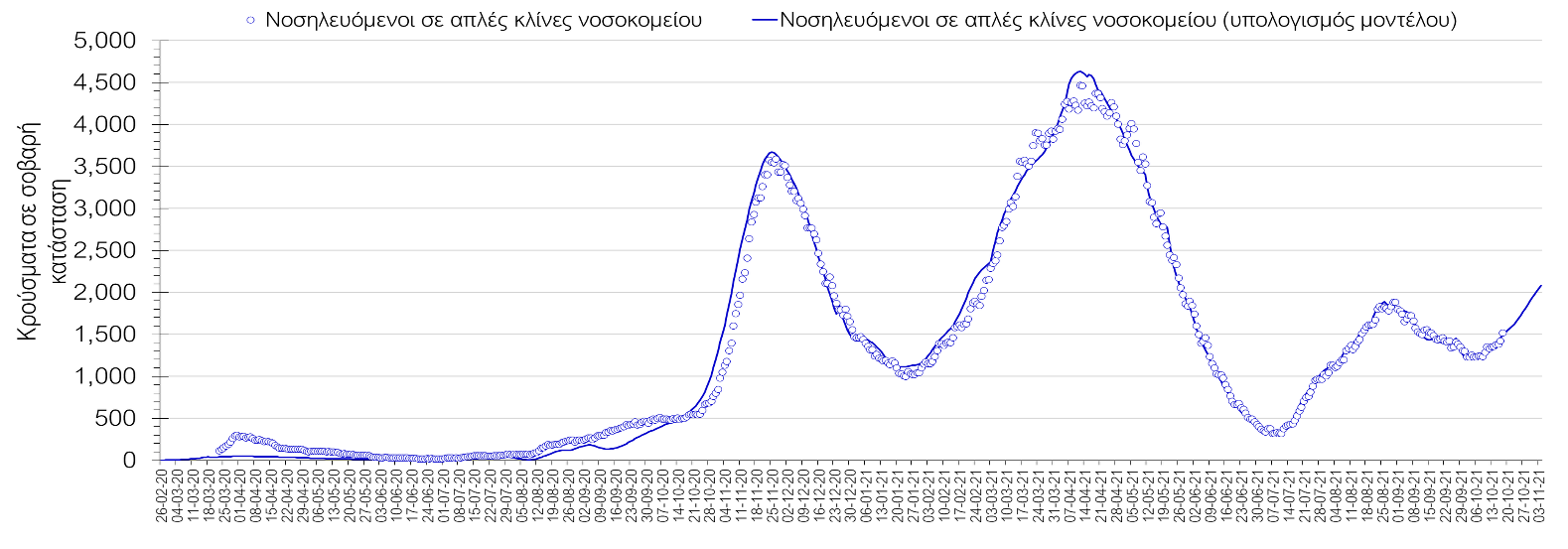 Σχήμα 2. Αριθμός κρουσμάτων σε σοβαρή κατάσταση (νοσηλευόμενοι σε απλές κλίνες) σύμφωνα με τα στοιχεία του ΕΟΔΥ και τις προβλέψεις της υπολογιστικής πλατφόρμας CORE.