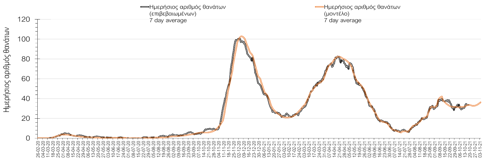 Ο αριθμός ημερήσιων θανάτων (43) που καταγράφηκε είναι σημαντικά αυξημένος σε σχέση με την Κυριακή (27). Όπως είχαμε προβλέψει ο κυλιόμενος εβδομαδιαίος μέσος όρος που είναι 33,9 ακολουθεί πλέον την πορεία του αριθμού των ασθενών σε κρίσιμη κατάσταση.