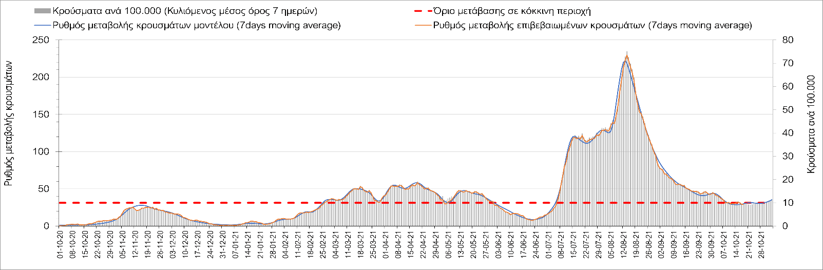 Η πορεία της μέσης εβδομαδιαίας τιμής των κρουσμάτων, καθώς και του κυλιόμενου μέσου όρου 7 ημερών του αριθμού των κρουσμάτων ανά 100.000 πληθυσμού, όπως έχουν καταγραφεί από τον ΕΟΔΥ και η αναμενόμενη πορεία τους όπως προδιαγράφεται από την υπολογιστική πλατφόρμα CORE για την Ελληνική επικράτεια μέχρι τις 20 Οκτωβρίου, αποτυπώνονται στο Σχήμα 4.
