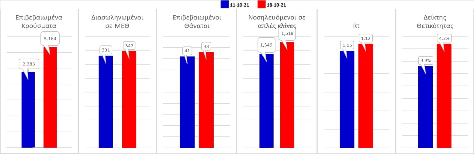 Σχήμα 58. Συγκριτικά αποτελέσματα της επιδημιολογικής εικόνας της σημερινής Δευτέρας (18/10/2021) σε σχέση με την προηγούμενη (11/10/2021)