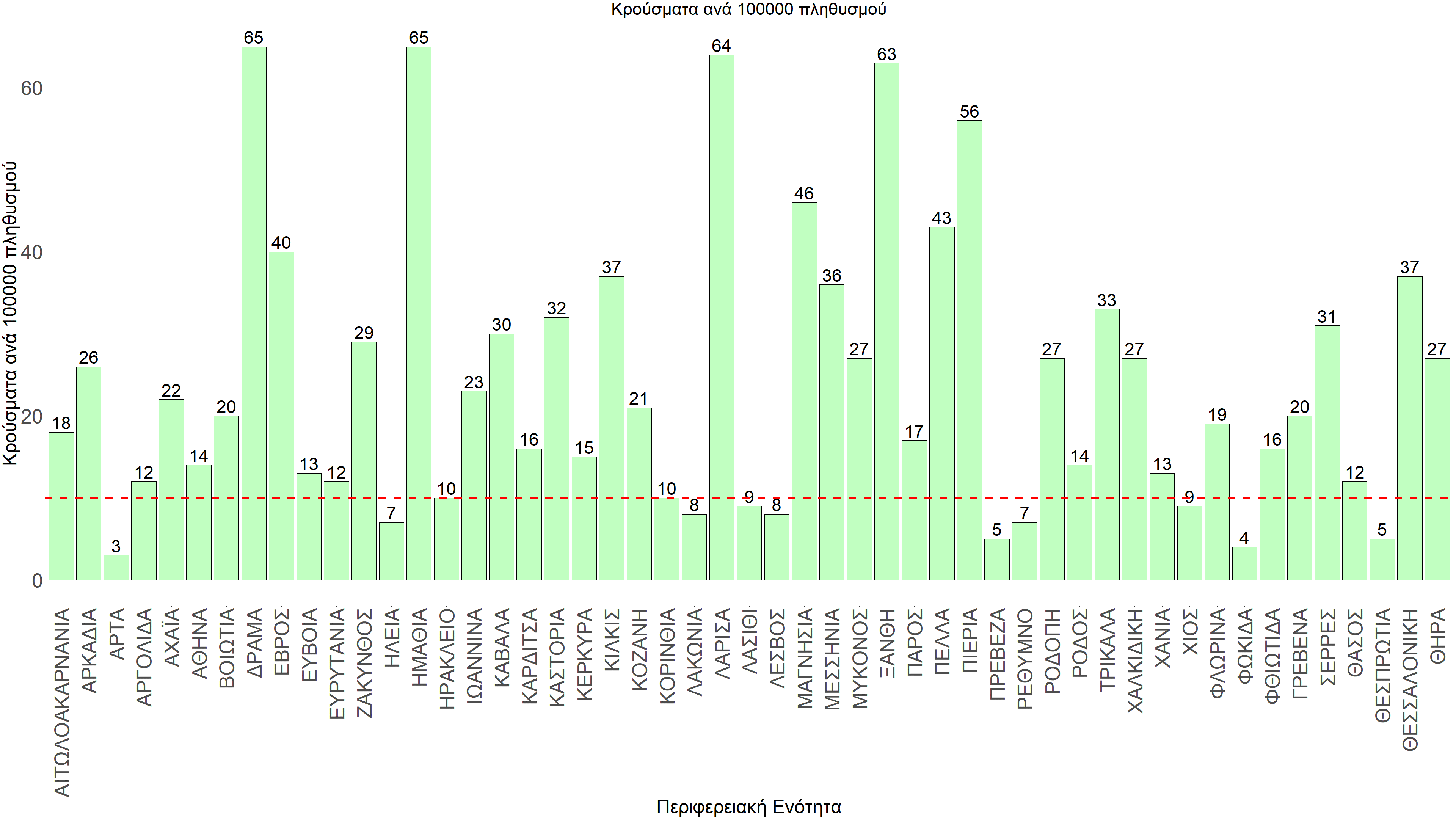 Όσον αφορά επιμέρους περιοχές, παραμένουν ακόμα πάνω από το όριο χαρακτηρισμού ως περιοχές ανησυχίας, η Αττική, η Θεσσαλονίκη η Λάρισα, η Καρδίτσα, τα Τρίκαλα, η Αχαΐα, η Αργολίδα, η Μεσσηνία, η Ευρυτανία, η Αιτωλοακαρνανία, η Βοιωτία, η Εύβοια, η Φθιώτιδα, τα Ιωάννινα, η Κοζάνη, η Ημαθία, η Πέλλα, το Κιλκίς, η Καβάλα, η Καστοριά, η Φλώρινα, η Πέλλα, τα Γρεβενά, η Δράμα, οι Σέρρες, η Χαλκιδική, η Πιερία, η Ροδόπη, η Ξάνθη, ο Έβρος, το Ηράκλειο, τα Χανιά, η Κέρκυρα, η Θάσος, η Ζάκυνθος, η Μύκονος, η Πάρος, η Σαντορίνη, και η Ρόδος. Η συγκεντρωτική εικόνα των επιμέρους περιοχών παρουσιάζεται στο Σχήμα 59.