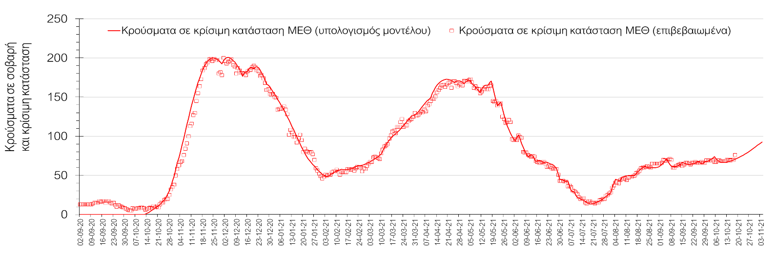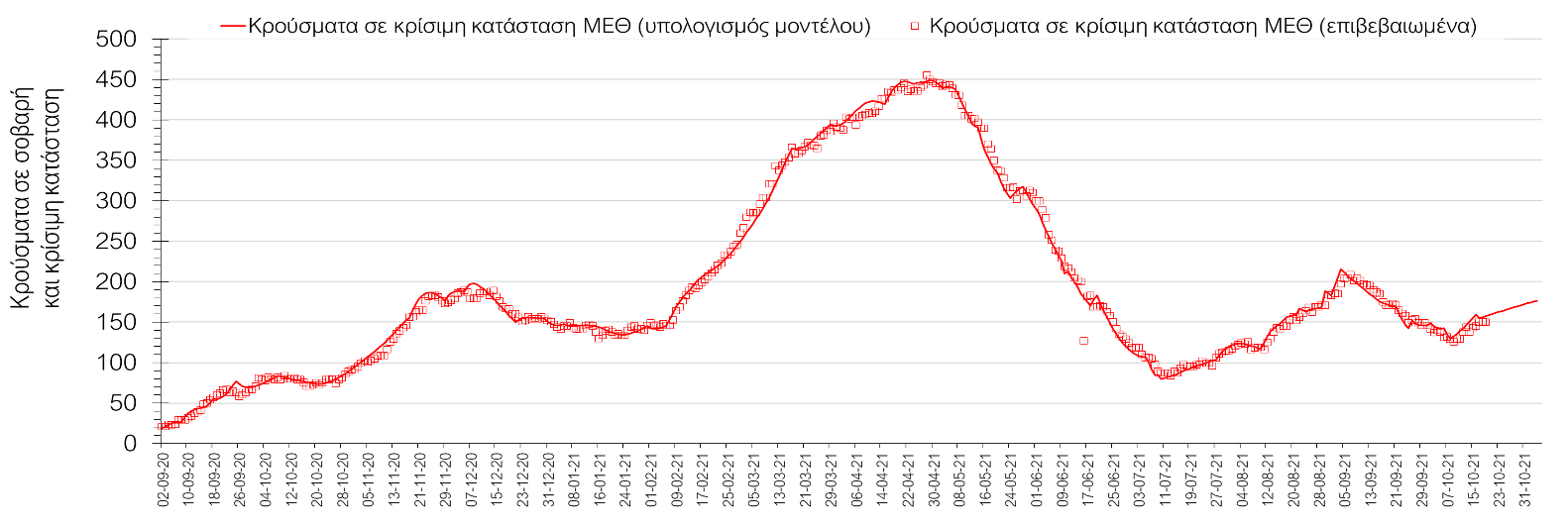 Σχήμα 1. Αριθμός κρουσμάτων σε κρίσιμη κατάσταση (ΜΕΘ) σύμφωνα με τα στοιχεία του ΕΟΔΥ και τις προβλέψεις της υπολογιστικής πλατφόρμας CORE.