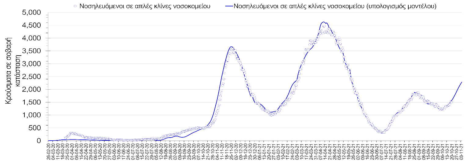 Σχήμα 2. Αριθμός κρουσμάτων σε σοβαρή κατάσταση (νοσηλευόμενοι σε απλές κλίνες) σύμφωνα με τα στοιχεία του ΕΟΔΥ και τις προβλέψεις της υπολογιστικής πλατφόρμας CORE.