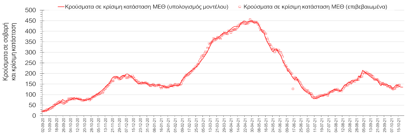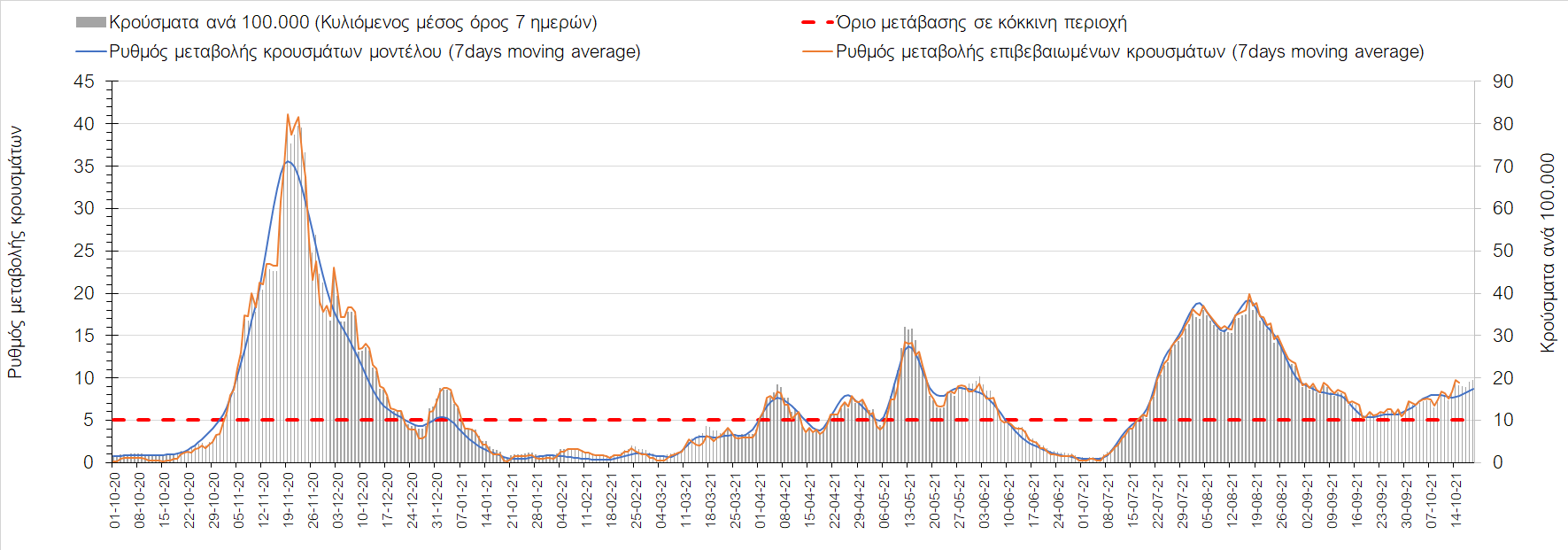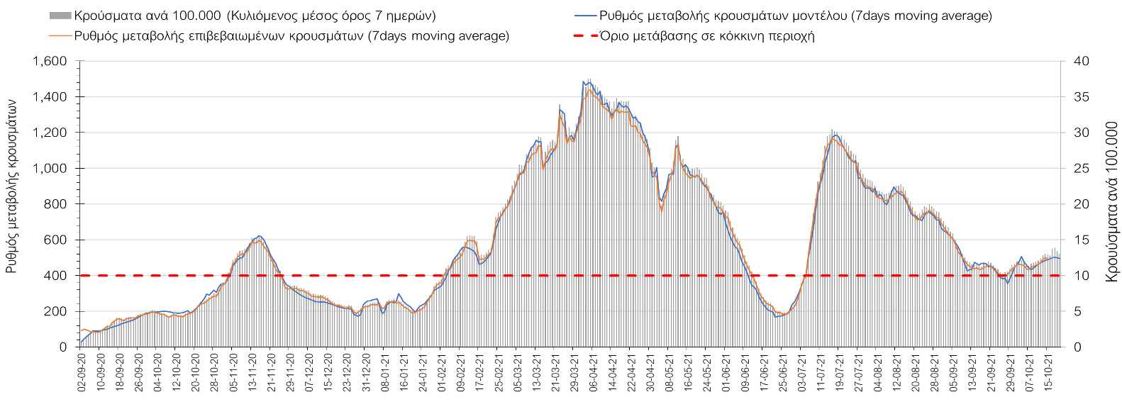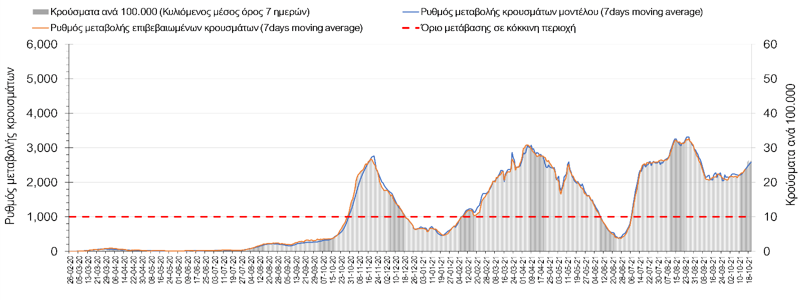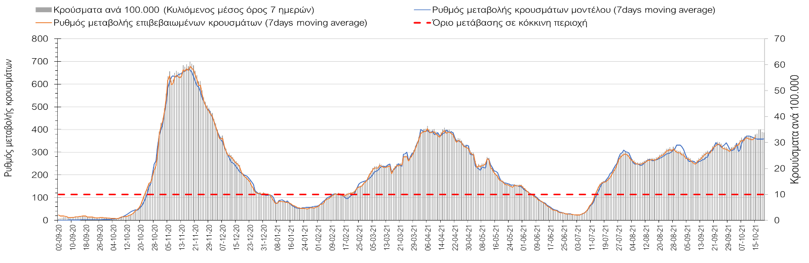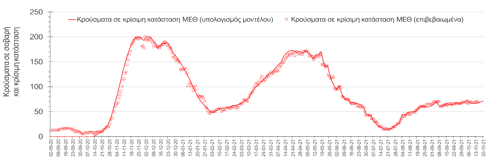 Η πορεία της μέσης εβδομαδιαίας τιμής των κρουσμάτων, καθώς και του κυλιόμενου μέσου όρου 7 ημερών του αριθμού των κρουσμάτων ανά 100.000 πληθυσμού, όπως έχουν καταγραφεί από τον ΕΟΔΥ και η αναμενόμενη πορεία τους όπως προδιαγράφεται από την υπολογιστική πλατφόρμα CORE για την Ελληνική επικράτεια μέχρι τις 20 Οκτωβρίου, αποτυπώνονται στο Σχήμα 4. Αυτή η προβλεπόμενη πορεία, που αφορά τα κρούσματα, τους νοσηλευόμενους σε απλές κλίνες, όσο και σε ΜΕΘ, καθώς επίσης και τους θανάτους, βασίζεται στις ακόλουθες παραδοχές: