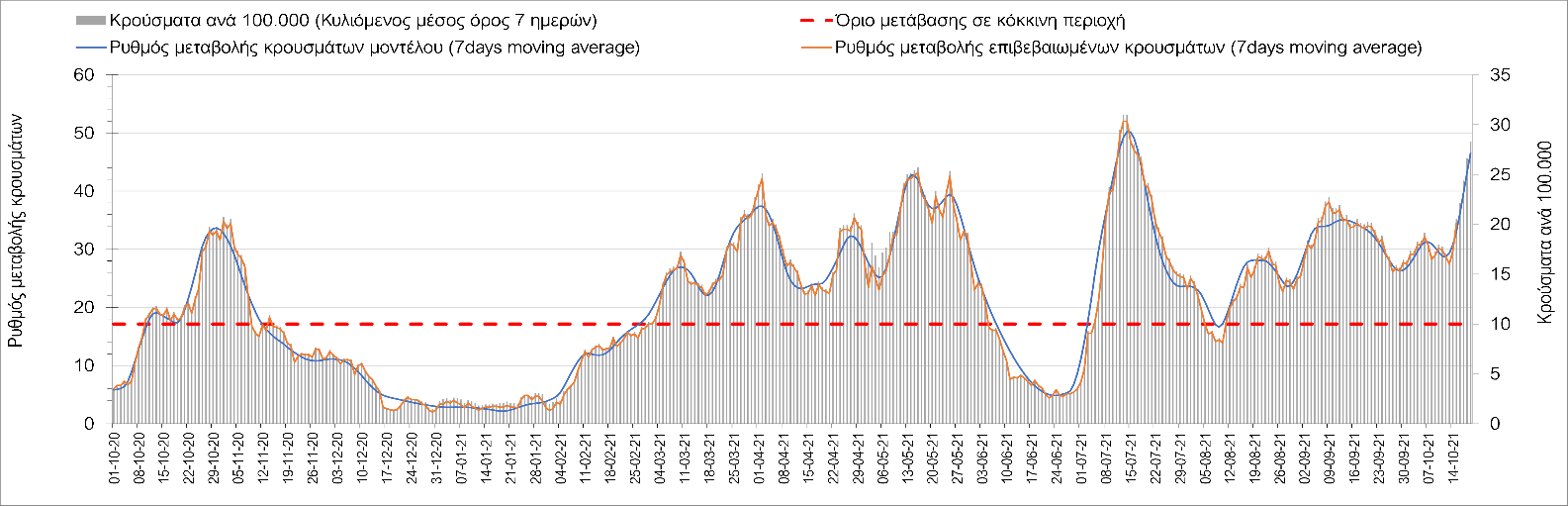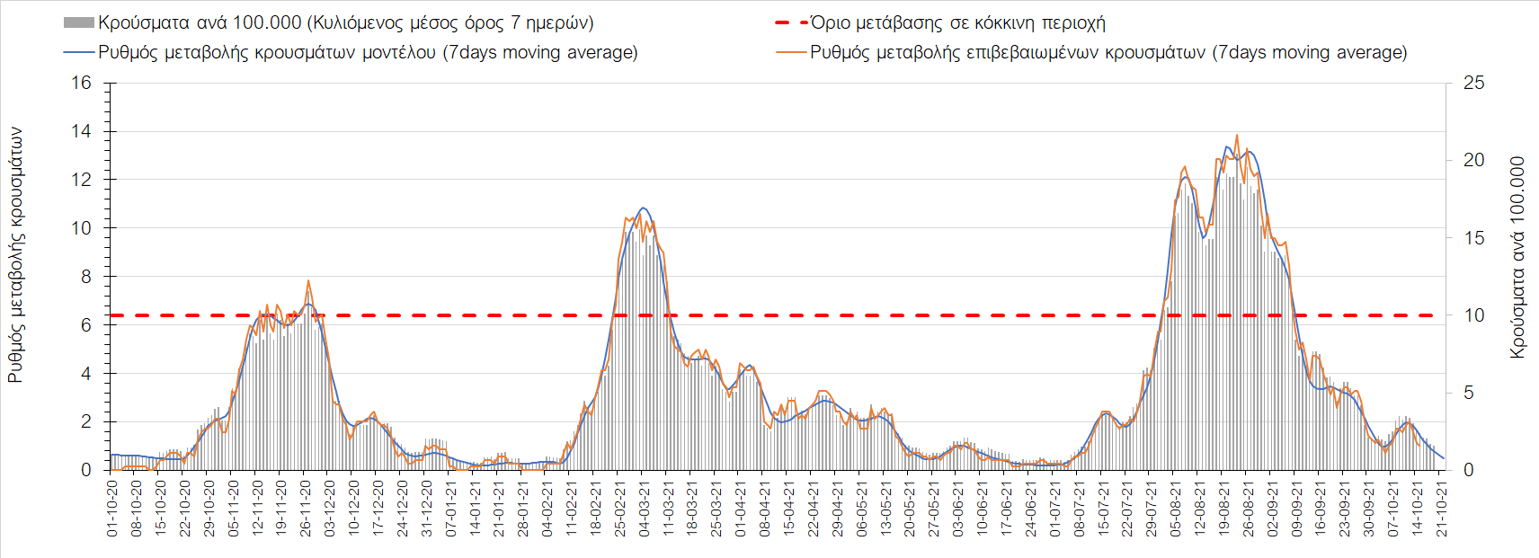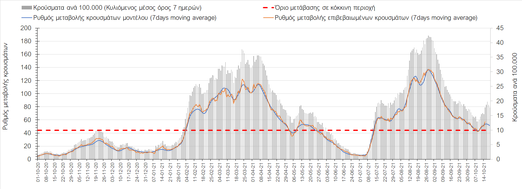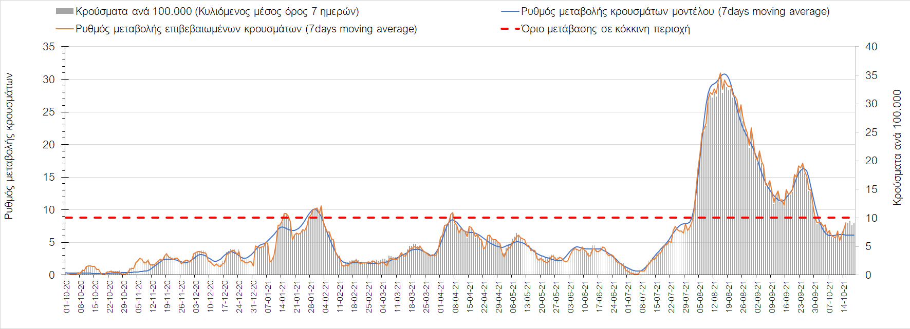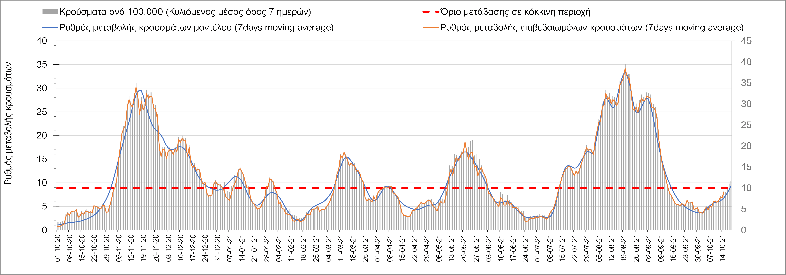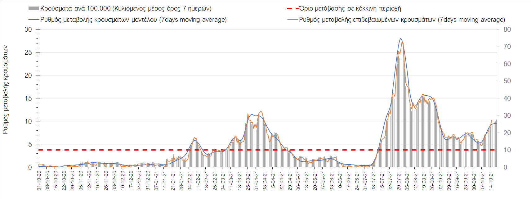 Η πορεία της μέσης εβδομαδιαίας τιμής των κρουσμάτων, καθώς και του κυλιόμενου μέσου όρου 7 ημερών του αριθμού των κρουσμάτων ανά 100.000 πληθυσμού, όπως έχουν καταγραφεί από τον ΕΟΔΥ και η αναμενόμενη πορεία τους όπως προδιαγράφεται από την υπολογιστική πλατφόρμα CORE για την Ελληνική επικράτεια μέχρι τις 20 Οκτωβρίου, αποτυπώνονται στο Σχήμα 4. Αυτή η προβλεπόμενη πορεία, που αφορά τα κρούσματα, τους νοσηλευόμενους σε απλές κλίνες, όσο και σε ΜΕΘ, καθώς επίσης και τους θανάτους, βασίζεται στις ακόλουθες παραδοχές: