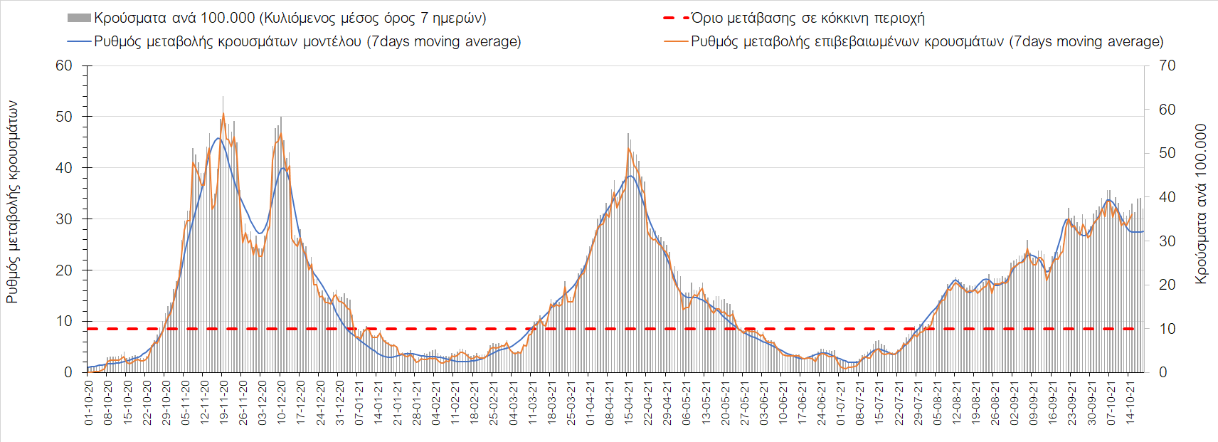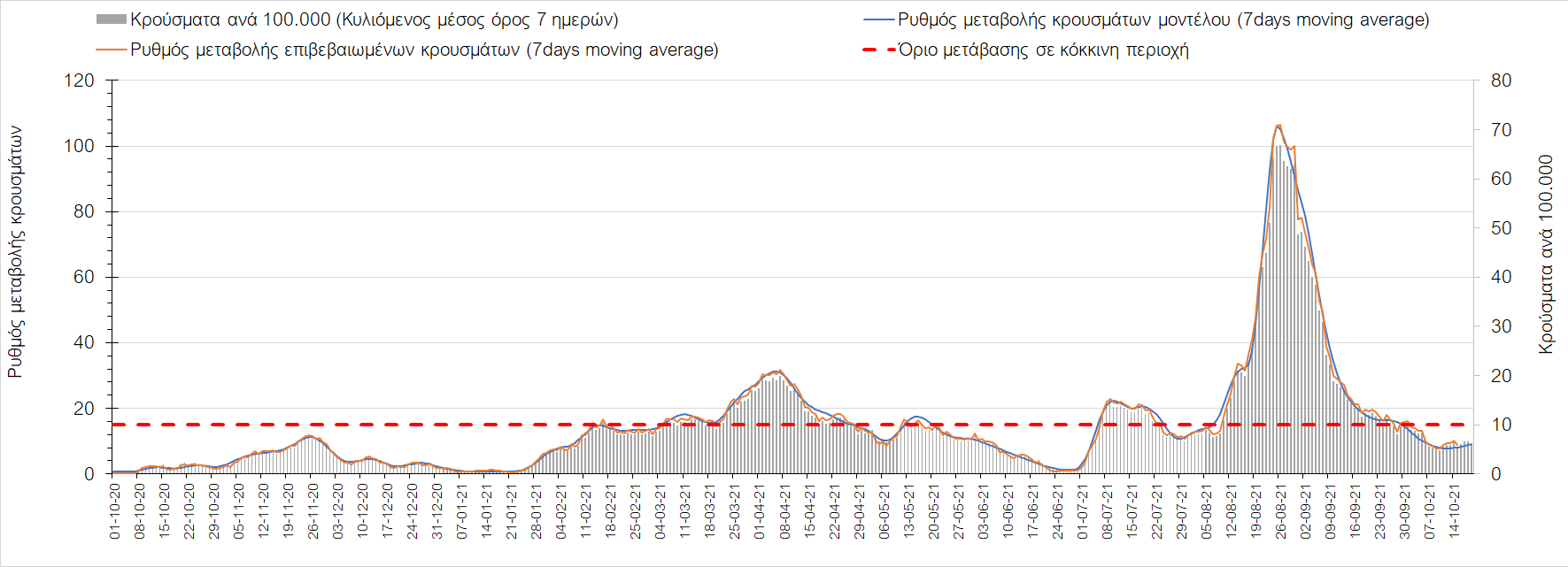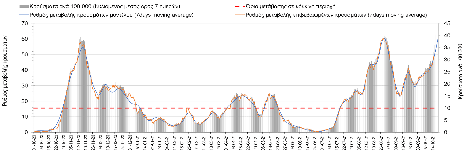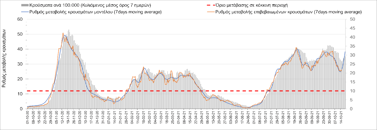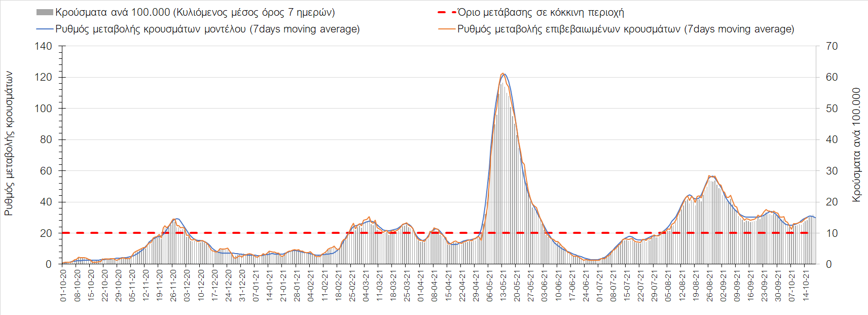Η πορεία της μέσης εβδομαδιαίας τιμής των κρουσμάτων, καθώς και του κυλιόμενου μέσου όρου 7 ημερών του αριθμού των κρουσμάτων ανά 100.000 πληθυσμού, όπως έχουν καταγραφεί από τον ΕΟΔΥ και η αναμενόμενη πορεία τους όπως προδιαγράφεται από την υπολογιστική πλατφόρμα CORE για την Ελληνική επικράτεια μέχρι τις 20 Οκτωβρίου, αποτυπώνονται στο Σχήμα 4. Αυτή η προβλεπόμενη πορεία, που αφορά τα κρούσματα, τους νοσηλευόμενους σε απλές κλίνες, όσο και σε ΜΕΘ, καθώς επίσης και τους θανάτους, βασίζεται στις ακόλουθες παραδοχές: