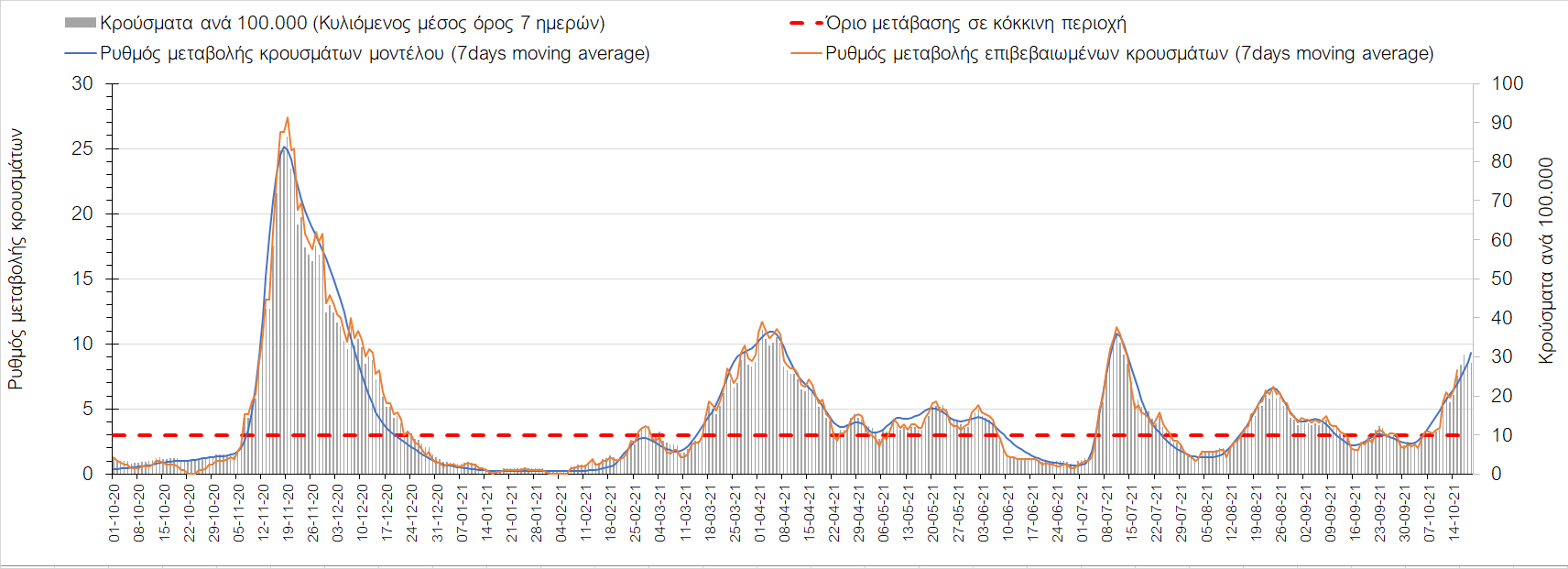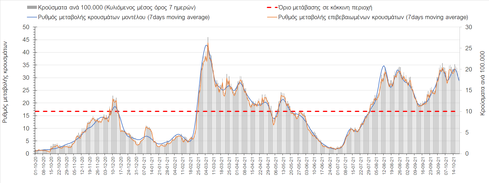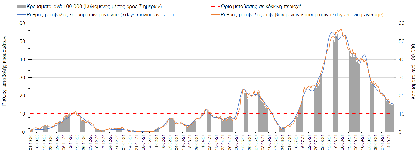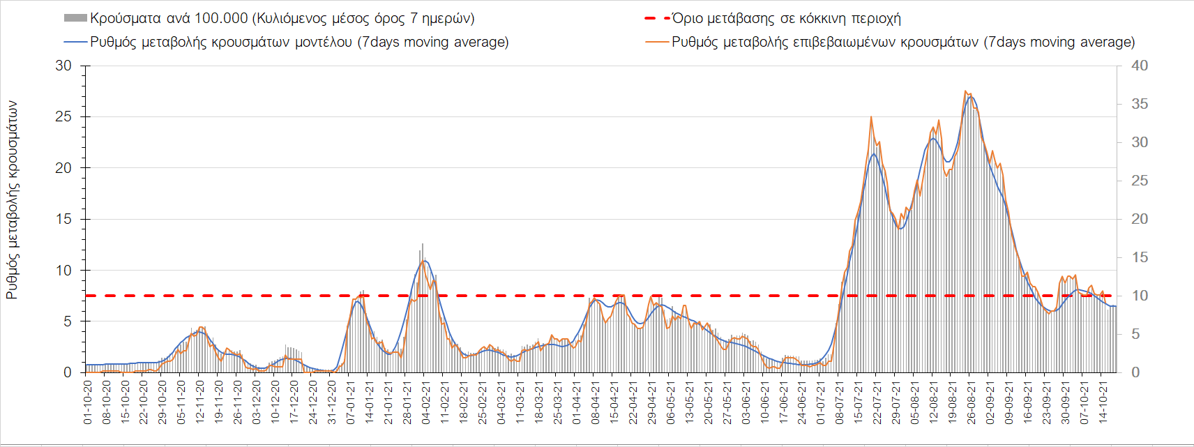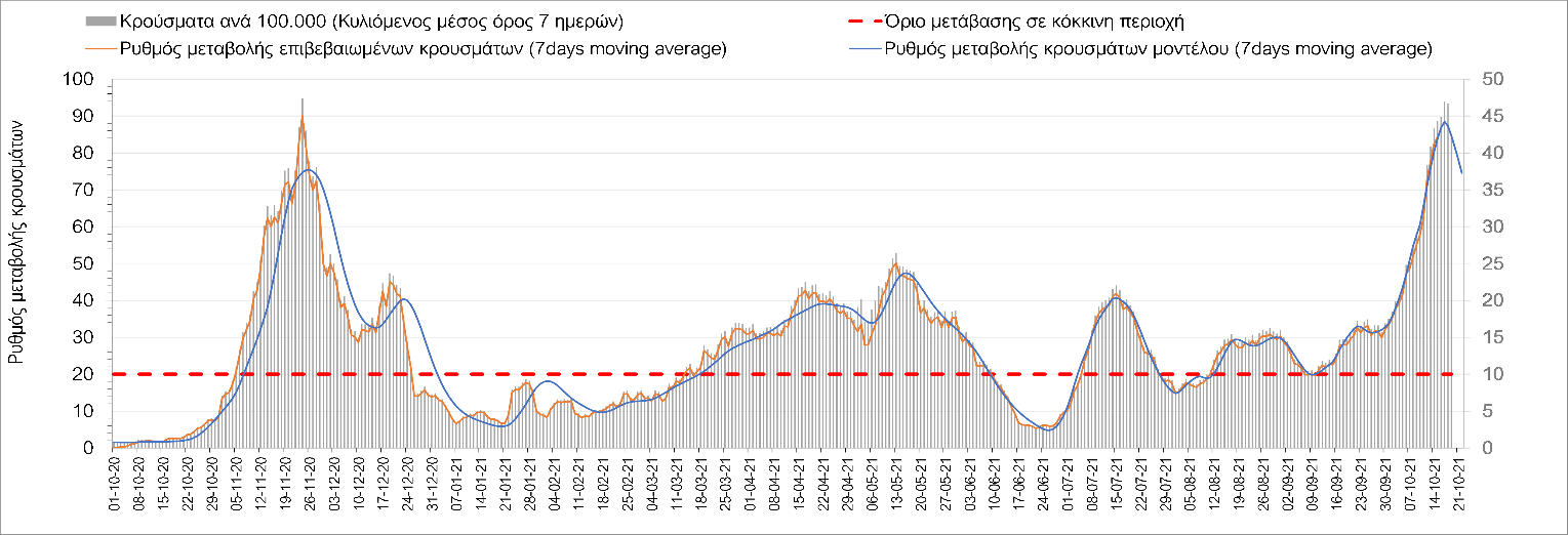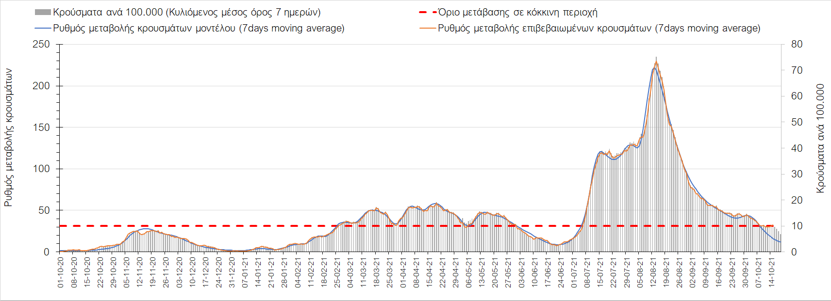 Η πορεία της μέσης εβδομαδιαίας τιμής των κρουσμάτων, καθώς και του κυλιόμενου μέσου όρου 7 ημερών του αριθμού των κρουσμάτων ανά 100.000 πληθυσμού, όπως έχουν καταγραφεί από τον ΕΟΔΥ και η αναμενόμενη πορεία τους όπως προδιαγράφεται από την υπολογιστική πλατφόρμα CORE για την Ελληνική επικράτεια μέχρι τις 20 Οκτωβρίου, αποτυπώνονται στο Σχήμα 4. Αυτή η προβλεπόμενη πορεία, που αφορά τα κρούσματα, τους νοσηλευόμενους σε απλές κλίνες, όσο και σε ΜΕΘ, καθώς επίσης και τους θανάτους, βασίζεται στις ακόλουθες παραδοχές: