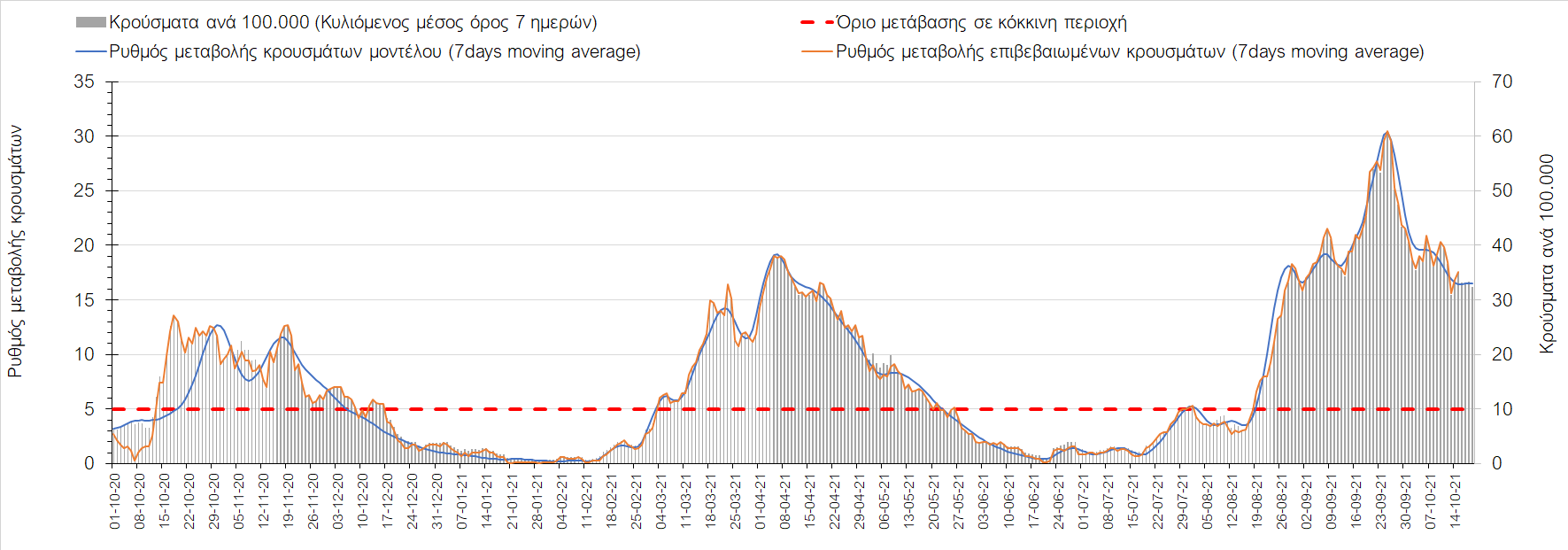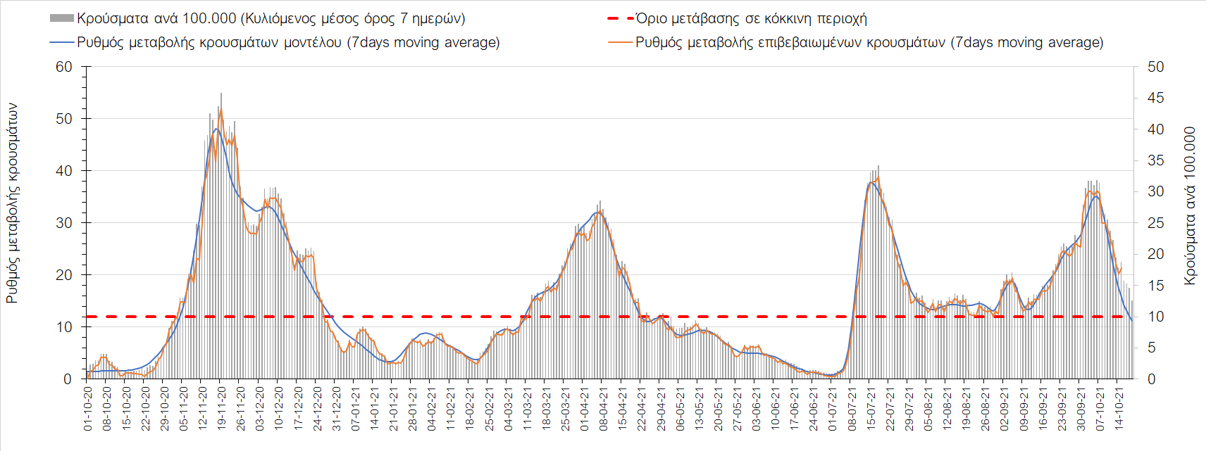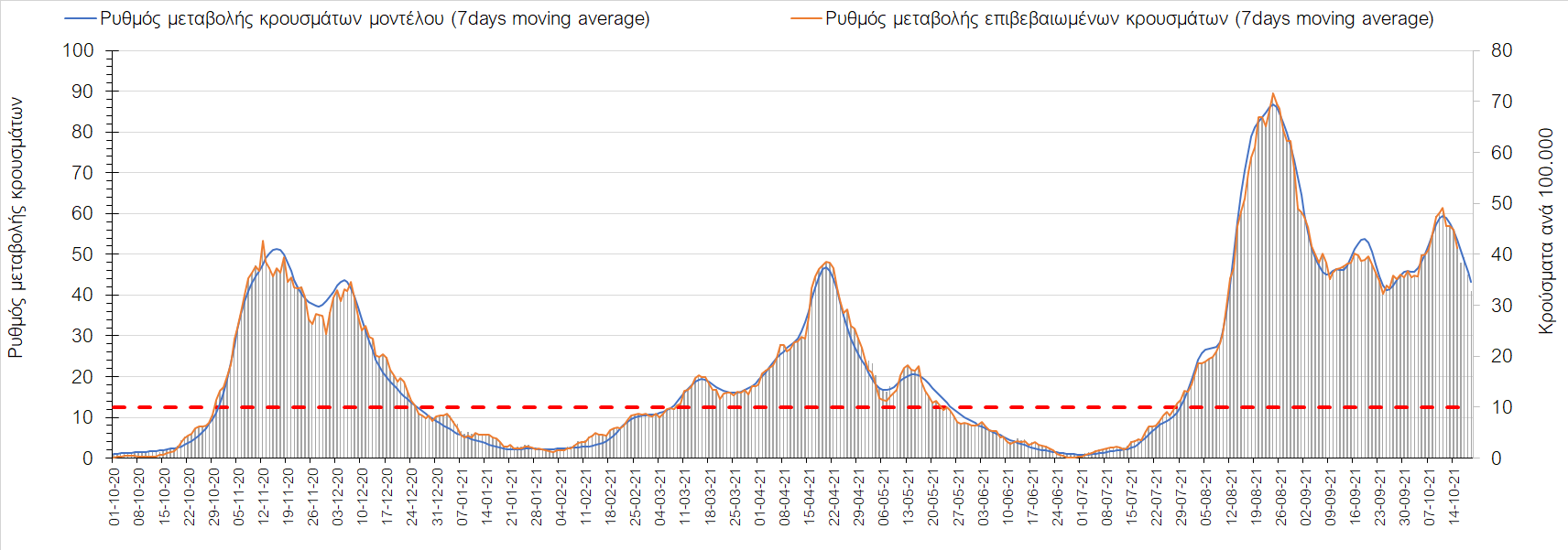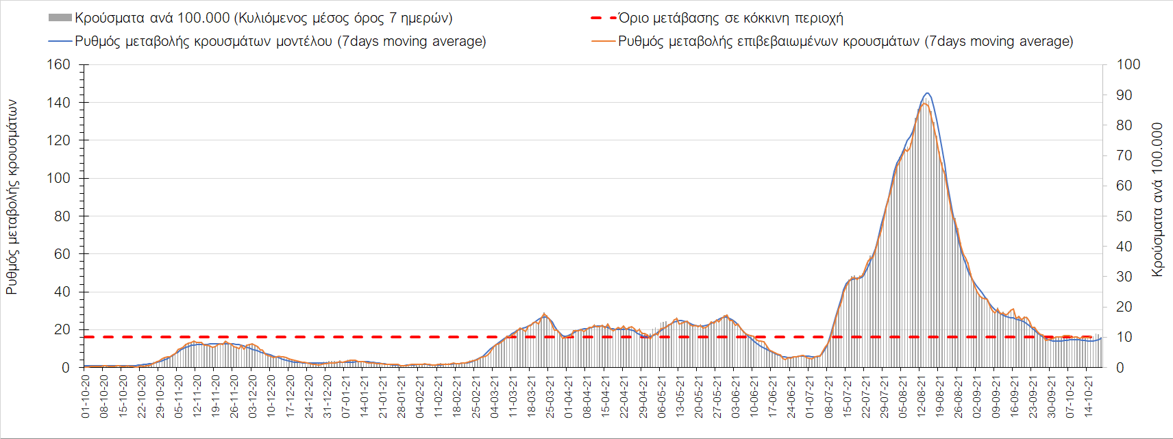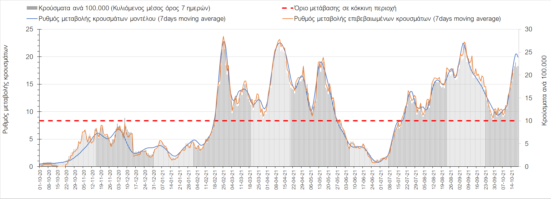 Η πορεία της μέσης εβδομαδιαίας τιμής των κρουσμάτων, καθώς και του κυλιόμενου μέσου όρου 7 ημερών του αριθμού των κρουσμάτων ανά 100.000 πληθυσμού, όπως έχουν καταγραφεί από τον ΕΟΔΥ και η αναμενόμενη πορεία τους όπως προδιαγράφεται από την υπολογιστική πλατφόρμα CORE για την Ελληνική επικράτεια μέχρι τις 20 Οκτωβρίου, αποτυπώνονται στο Σχήμα 4. Αυτή η προβλεπόμενη πορεία, που αφορά τα κρούσματα, τους νοσηλευόμενους σε απλές κλίνες, όσο και σε ΜΕΘ, καθώς επίσης και τους θανάτους, βασίζεται στις ακόλουθες παραδοχές: