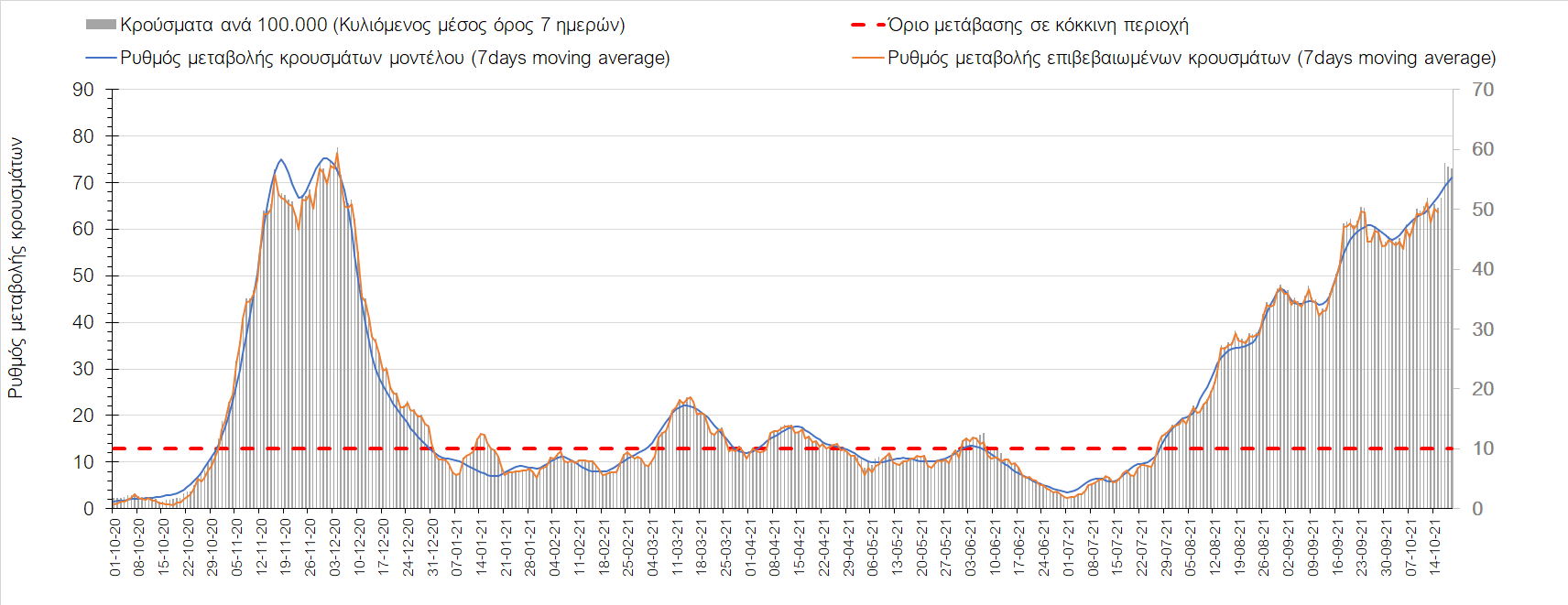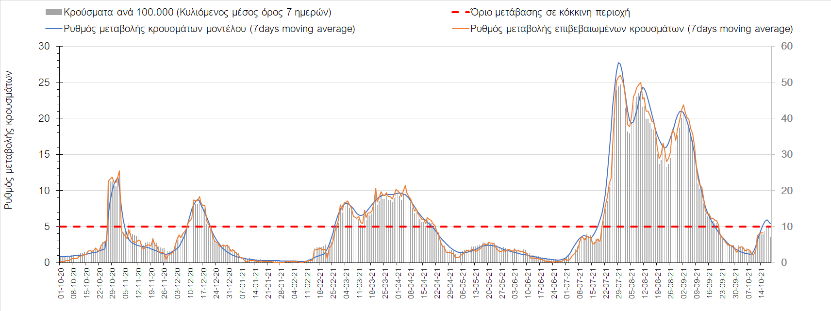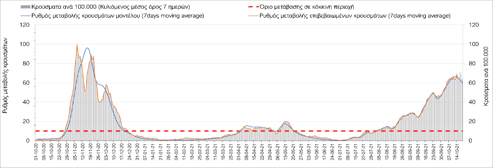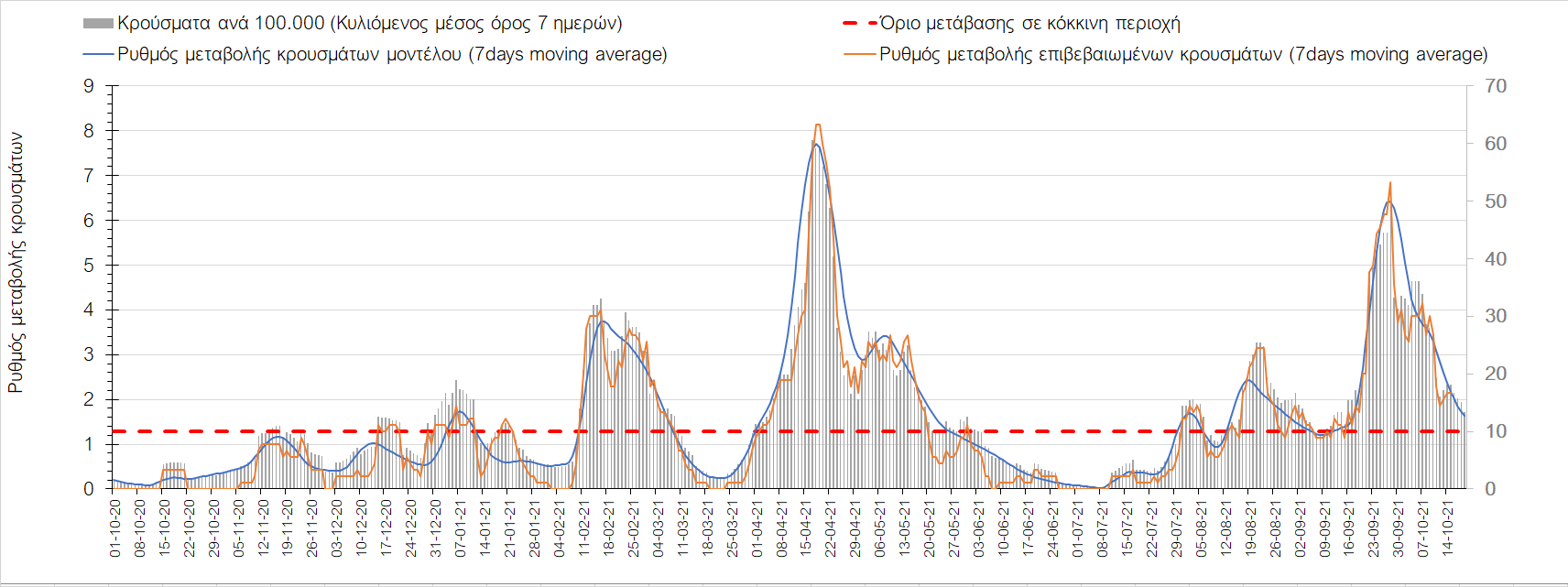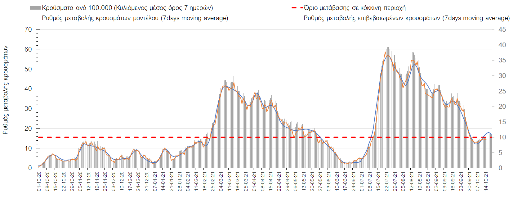 Η πορεία της μέσης εβδομαδιαίας τιμής των κρουσμάτων, καθώς και του κυλιόμενου μέσου όρου 7 ημερών του αριθμού των κρουσμάτων ανά 100.000 πληθυσμού, όπως έχουν καταγραφεί από τον ΕΟΔΥ και η αναμενόμενη πορεία τους όπως προδιαγράφεται από την υπολογιστική πλατφόρμα CORE για την Ελληνική επικράτεια μέχρι τις 20 Οκτωβρίου, αποτυπώνονται στο Σχήμα 4. Αυτή η προβλεπόμενη πορεία, που αφορά τα κρούσματα, τους νοσηλευόμενους σε απλές κλίνες, όσο και σε ΜΕΘ, καθώς επίσης και τους θανάτους, βασίζεται στις ακόλουθες παραδοχές: