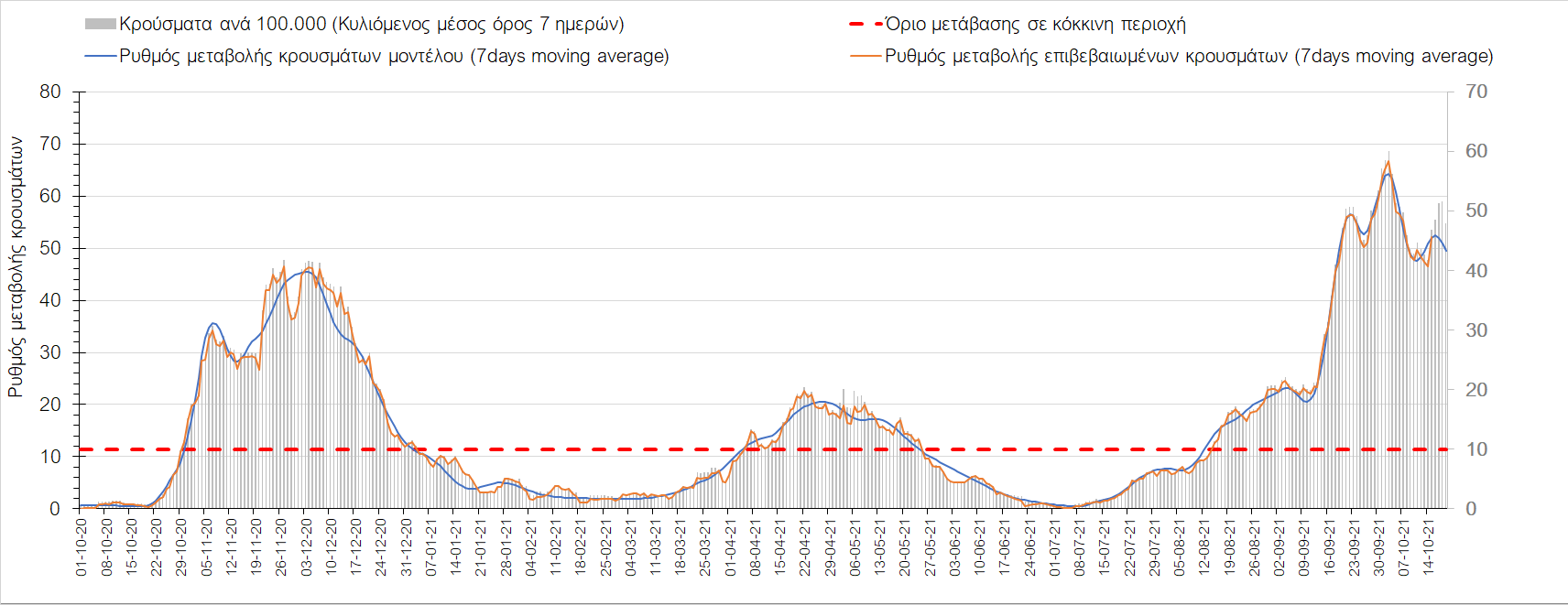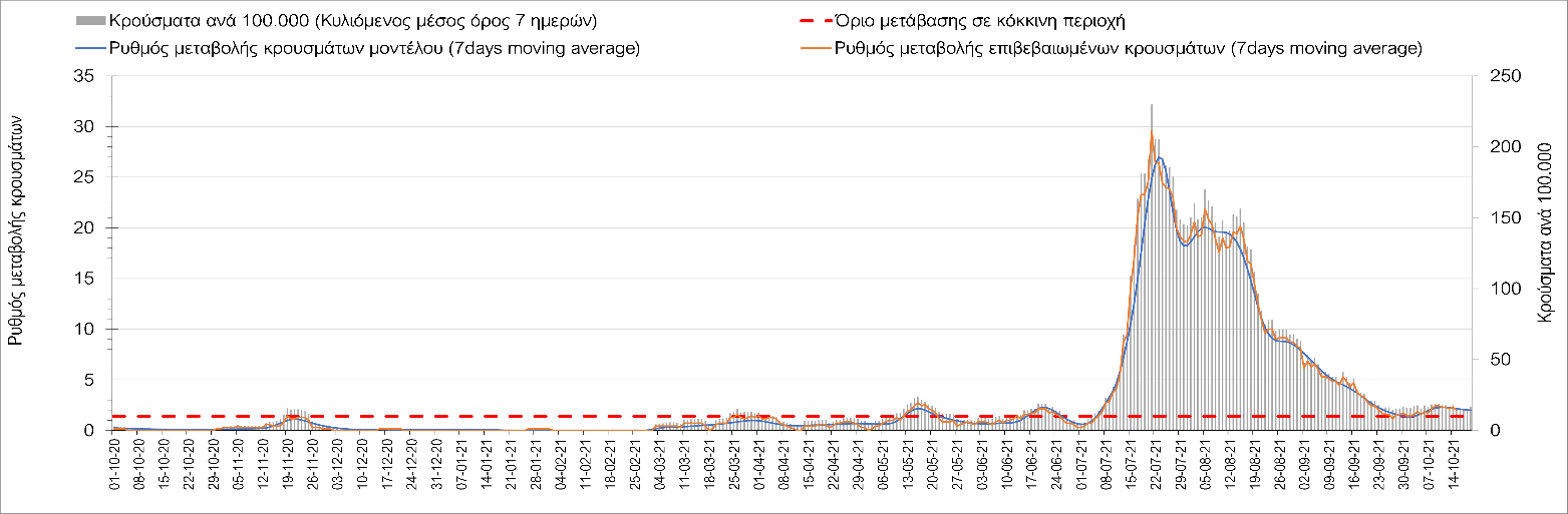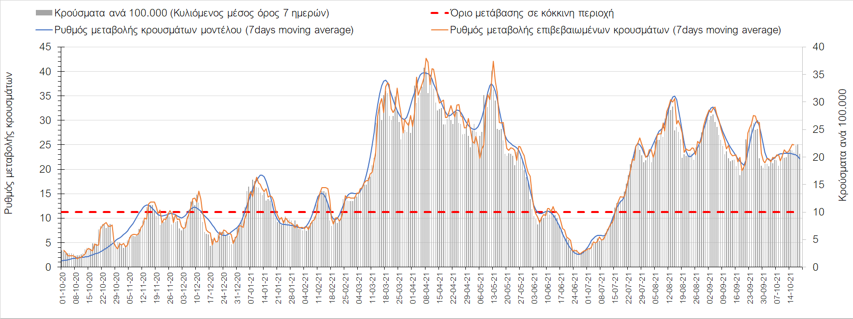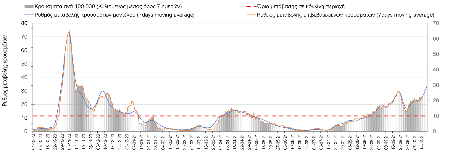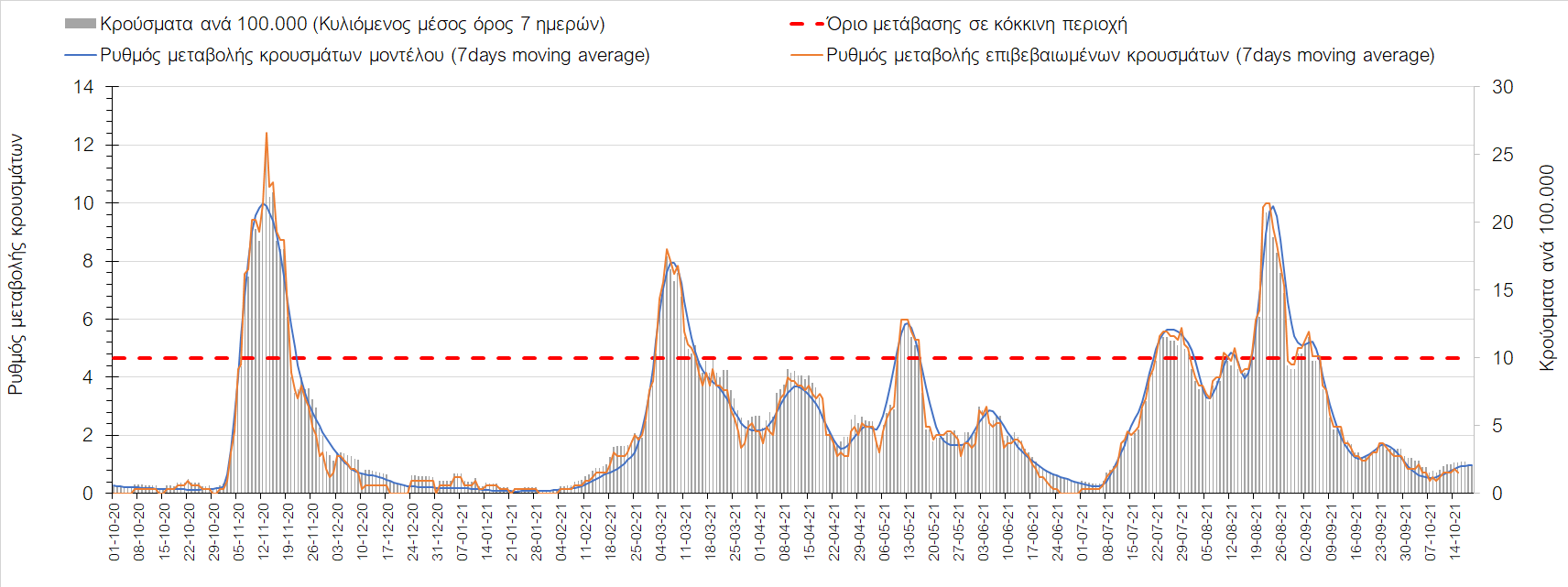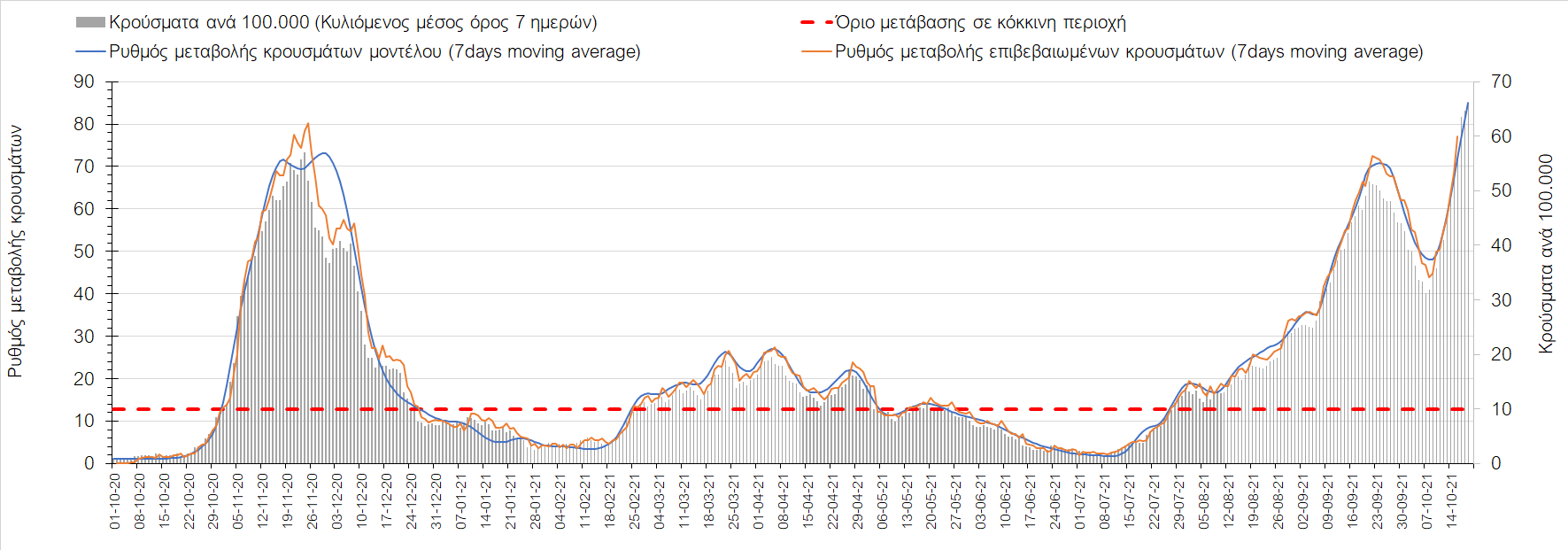 Η πορεία της μέσης εβδομαδιαίας τιμής των κρουσμάτων, καθώς και του κυλιόμενου μέσου όρου 7 ημερών του αριθμού των κρουσμάτων ανά 100.000 πληθυσμού, όπως έχουν καταγραφεί από τον ΕΟΔΥ και η αναμενόμενη πορεία τους όπως προδιαγράφεται από την υπολογιστική πλατφόρμα CORE για την Ελληνική επικράτεια μέχρι τις 20 Οκτωβρίου, αποτυπώνονται στο Σχήμα 4. Αυτή η προβλεπόμενη πορεία, που αφορά τα κρούσματα, τους νοσηλευόμενους σε απλές κλίνες, όσο και σε ΜΕΘ, καθώς επίσης και τους θανάτους, βασίζεται στις ακόλουθες παραδοχές: