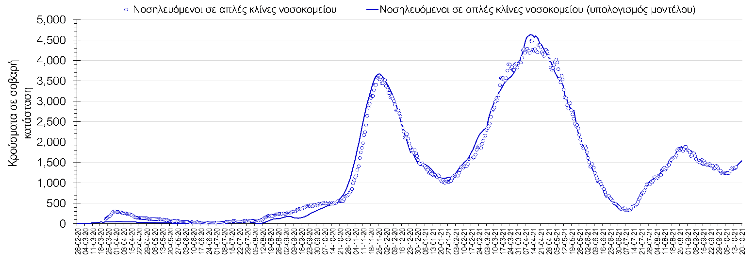 Σχήμα 2. Αριθμός κρουσμάτων σε σοβαρή κατάσταση (νοσηλευόμενοι σε απλές κλίνες) σύμφωνα με τα στοιχεία του ΕΟΔΥ και τις προβλέψεις της υπολογιστικής πλατφόρμας CORE.