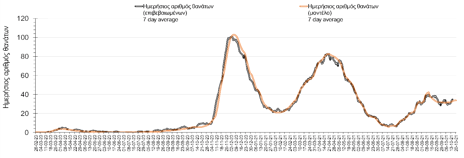 Ο αριθμός ημερήσιων θανάτων (27) που καταγράφηκε είναι σημαντικά μειωμένος σε σχέση με την Πέμπτη (46). Όπως είχαμε προβλέψει ο κυλιόμενος εβδομαδιαίος μέσος όρος που την Παρασκευή είναι 34,7 ακολουθεί πλέον την πορεία του αριθμού των ασθενών σε κρίσιμη κατάσταση.
