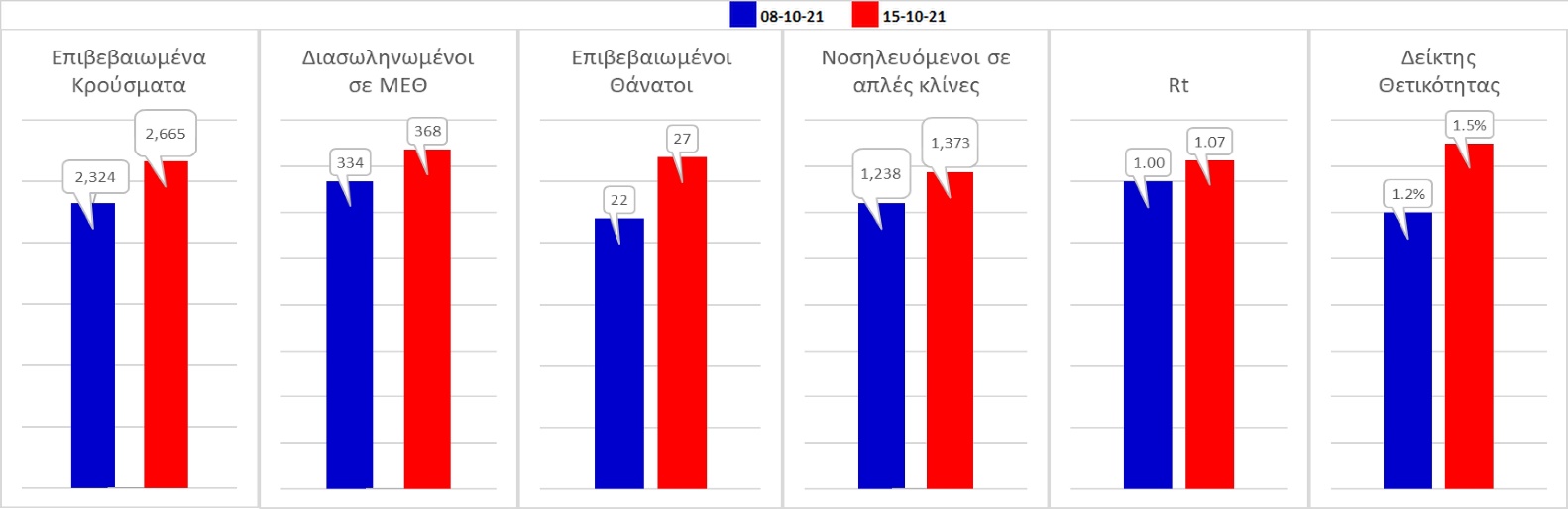 Σχήμα 58. Συγκριτικά αποτελέσματα της επιδημιολογικής εικόνας της σημερινής Παρασκευής (15/10/2021) σε σχέση με την προηγούμενη (08/10/2021)
