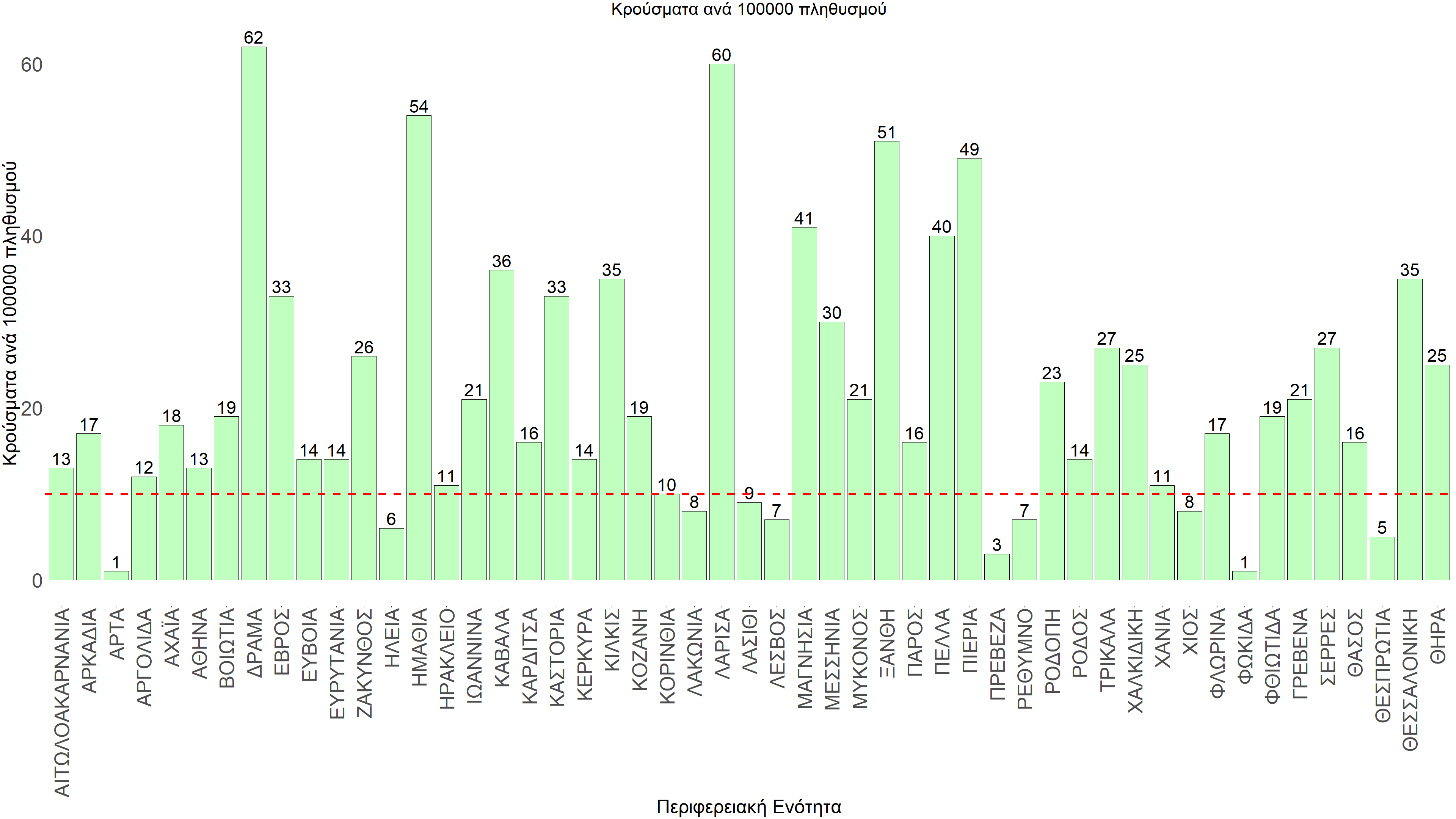 Σχήμα 59. Συγκεντρωτική εικόνα των νέων κρουσμάτων ανά 100.000 κατοίκους (κυλιόμενος μέσος όρος 7 ημερών) των επιμέρους περιοχών