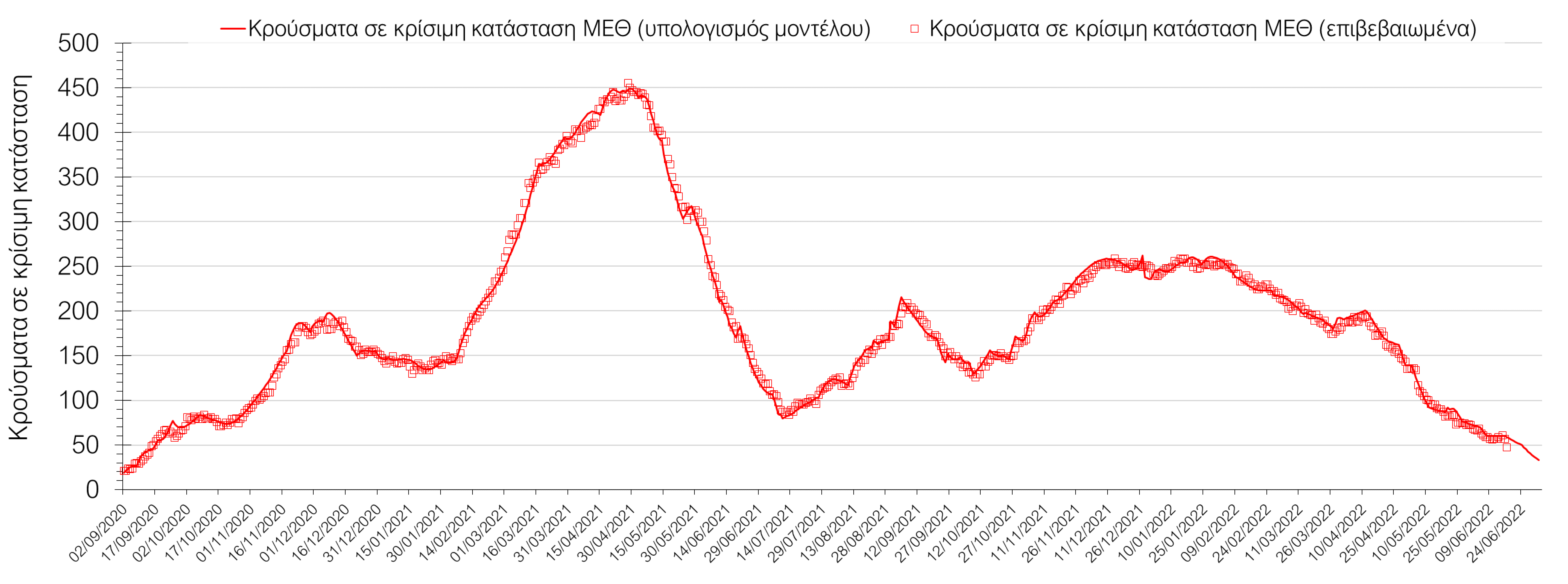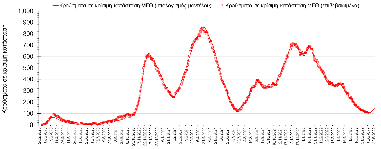 Όσον αφορά στους ασθενείς σε κρίσιμη κατάσταση (διασωληνωμένοι σε ΜΕΘ), ο αριθμός είναι οριακά χαμηλότερος σε σχέση με την Τετάρτη  (102 από 103). Η καμπύλη εξέλιξης του αριθμού των ασθενών που νοσηλεύονται σε κλίνες ΜΕΘ με βάση τις προσομοιώσεις της πλατφόρμας CORE, παρουσιάζεται στο Σχήμα 1, των ασθενών που νοσηλεύονται σε απλές κλίνες στο Σχήμα 2, όπου παρατηρείται σημαντική άνοδος τις τελευταίες ημέρες, παρόλο που παρατηρήθηκε πτώση, ενώ η εκτίμησή μας για την πορεία των θανάτων ανά ημέρα παρουσιάζεται στο Σχήμα 3.