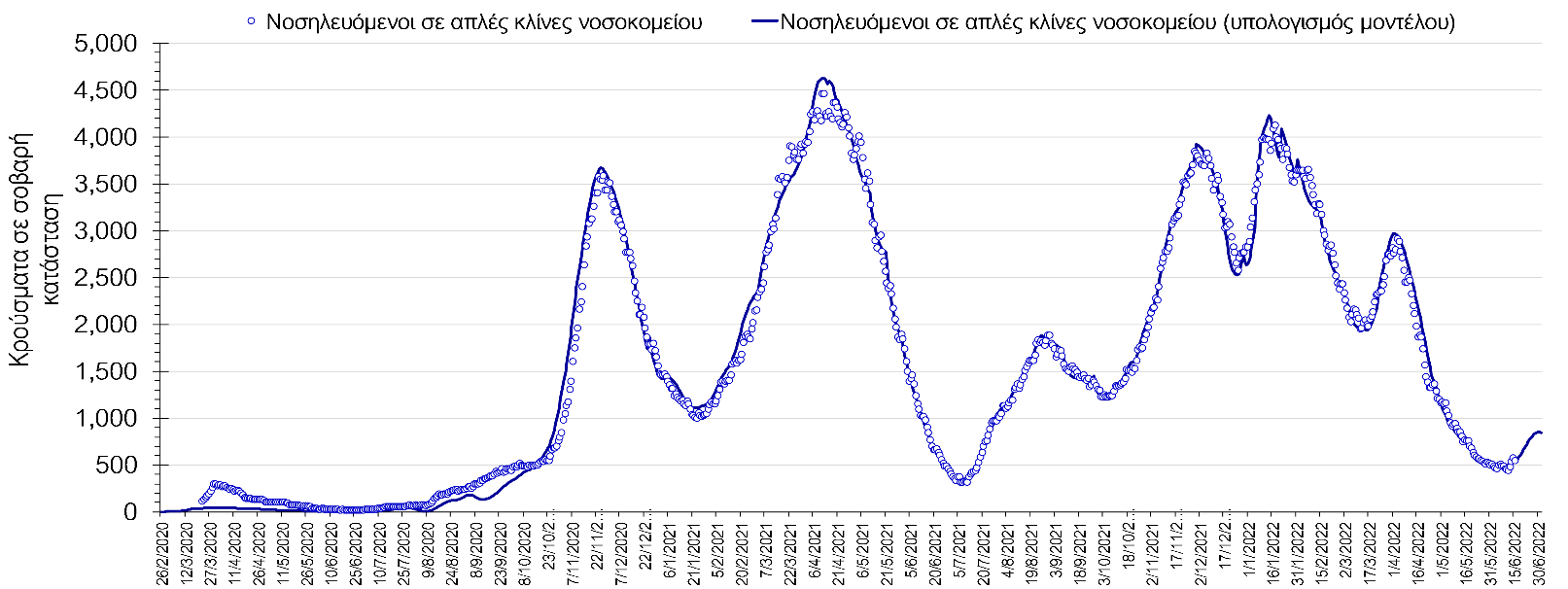 Σχήμα 2. Αριθμός κρουσμάτων σε σοβαρή κατάσταση (νοσηλευόμενοι σε απλές κλίνες) σύμφωνα με τα στοιχεία του ΕΟΔΥ και τις προβλέψεις της υπολογιστικής πλατφόρμας CORE.