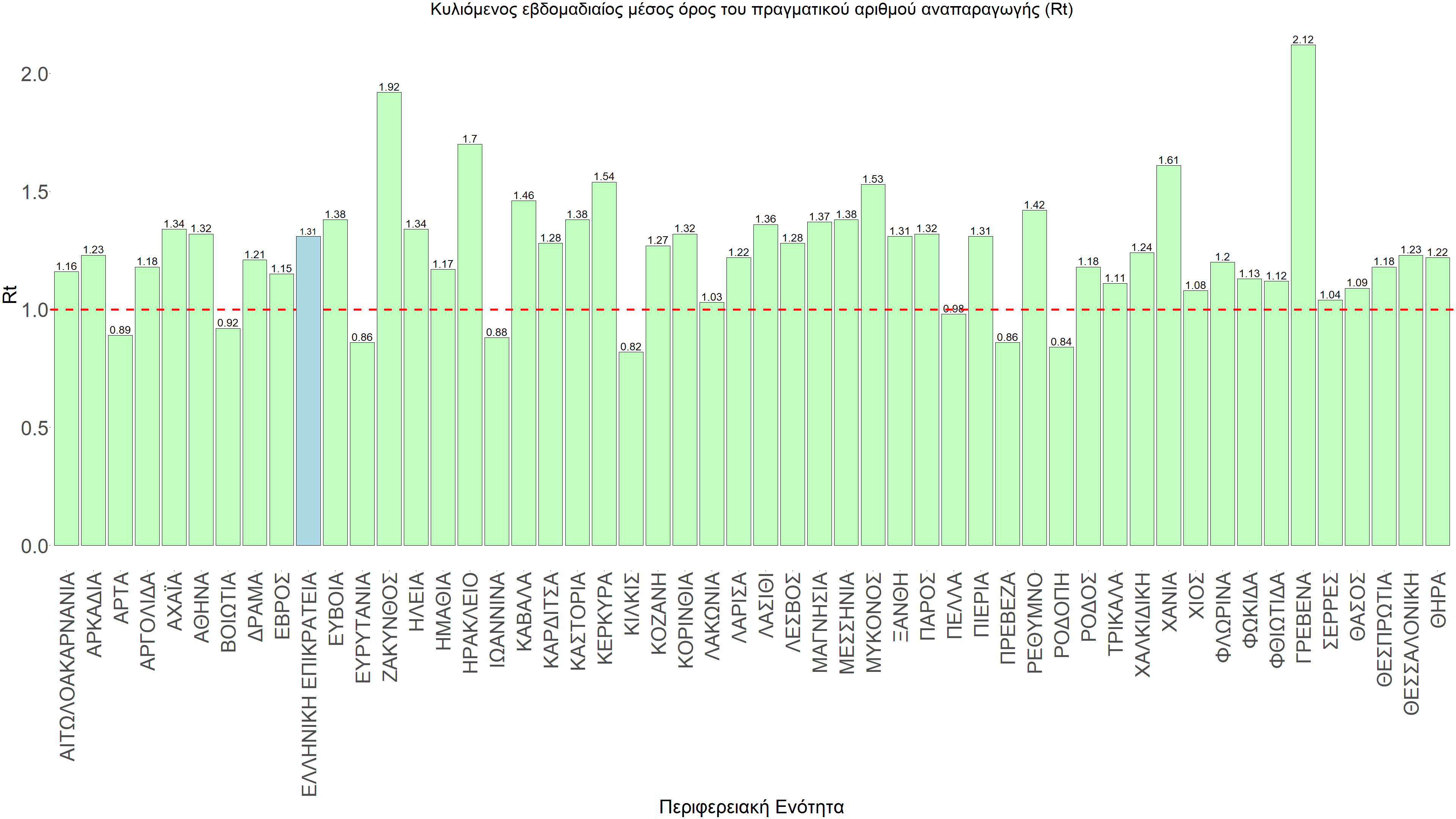 O πραγματικός αριθμός αναπαραγωγής Rt ανά περιφερειακή ενότητα της χώρας παρουσιάζεται στο Σχήμα 58.