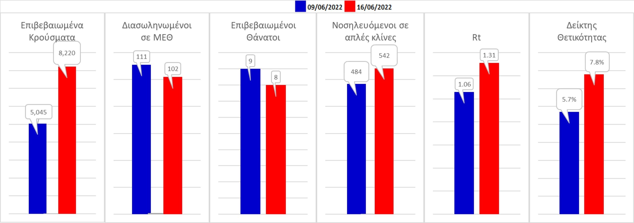 Σχήμα 59. Συγκριτικά αποτελέσματα της επιδημιολογικής εικόνας της σημερινής Πέμπτης (16/06/2022) σε σχέση με την προηγούμενη (09/06/2022)