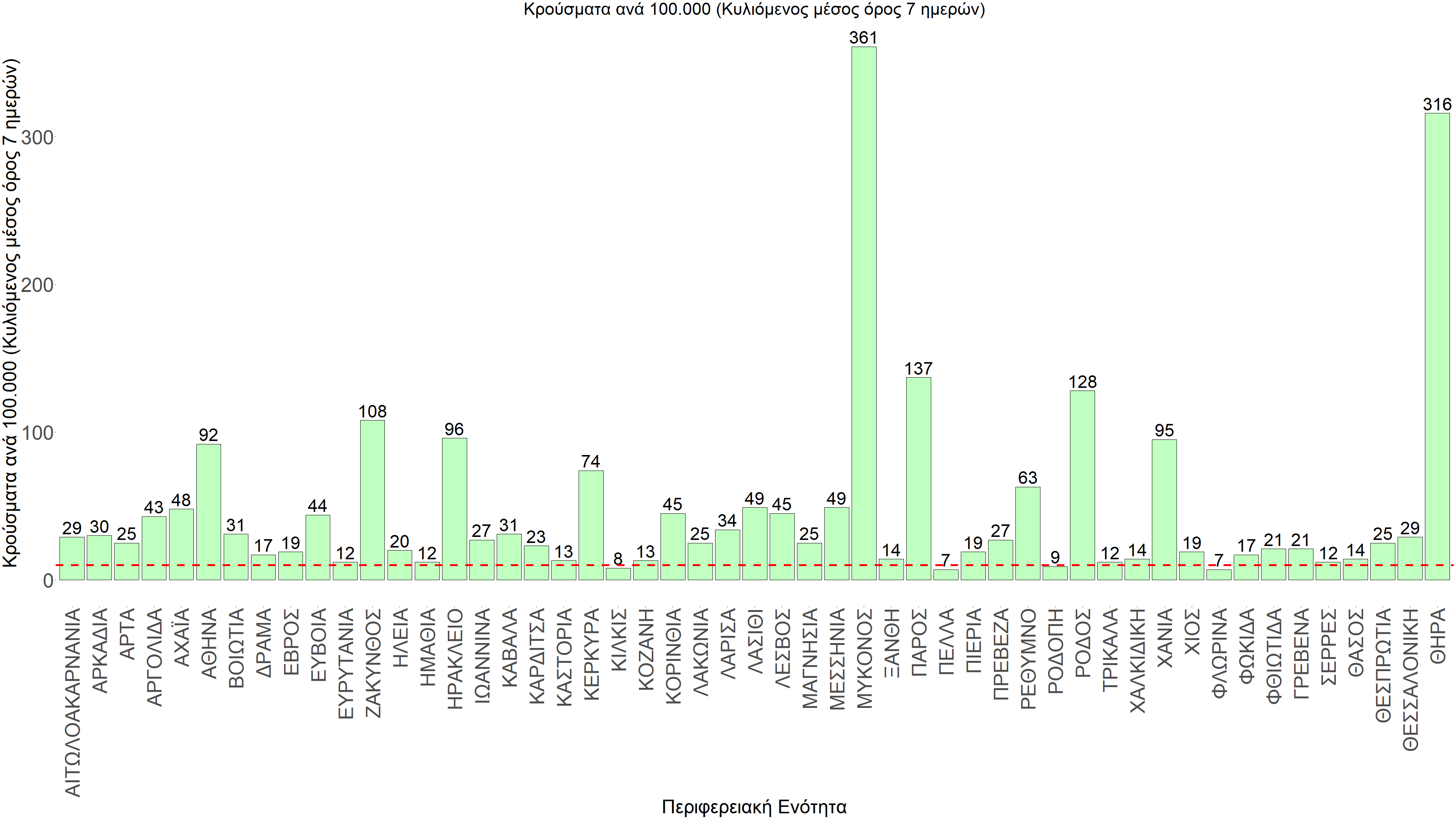Η συγκεντρωτική εικόνα των νέων κρουσμάτων ανά 100.000 κατοίκους (κυλιόμενος μέσος όρος 7 ημερών) των επιμέρους περιοχών παρουσιάζεται στο Σχήμα 60. Όλες οι περιοχές παραμένουν πάνω από το όριο ανησυχίας, με εξαίρεση το Κιλκίς, την Πέλλα, τη Ροδόπη και τη Φλώρινα.