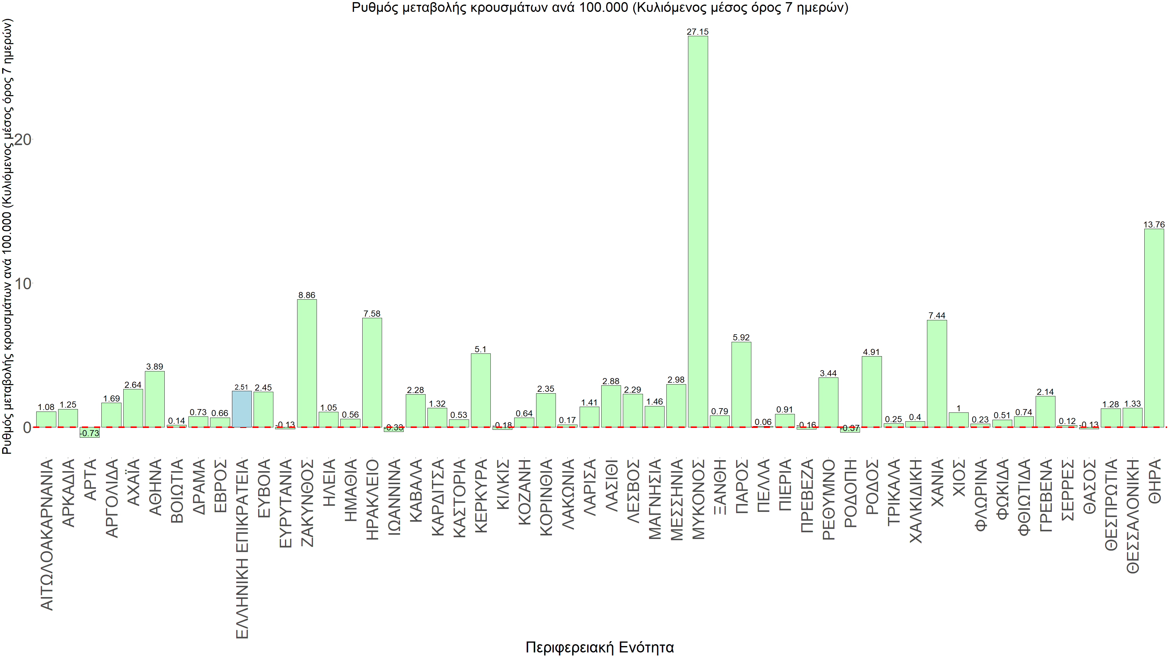 Η αποτύπωση των τάσεων στις επιμέρους περιοχές, παρουσιάζεται στο Σχήμα 61, όπου παρουσιάζεται ο ρυθμός μεταβολής των νέων κρουσμάτων ανά 100.000 κατοίκους (κυλιόμενος μέσος όρος 7 ημερών) των επιμέρους περιοχών. Θετικές τιμές του ρυθμού μεταβολής υποδηλώνουν άνοδο, ενώ αρνητικές τιμές υποδηλώνουν πτωτική πορεία.