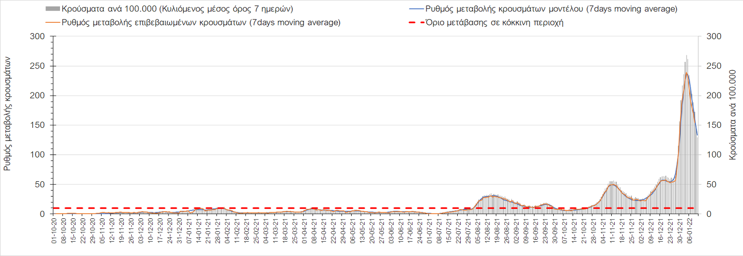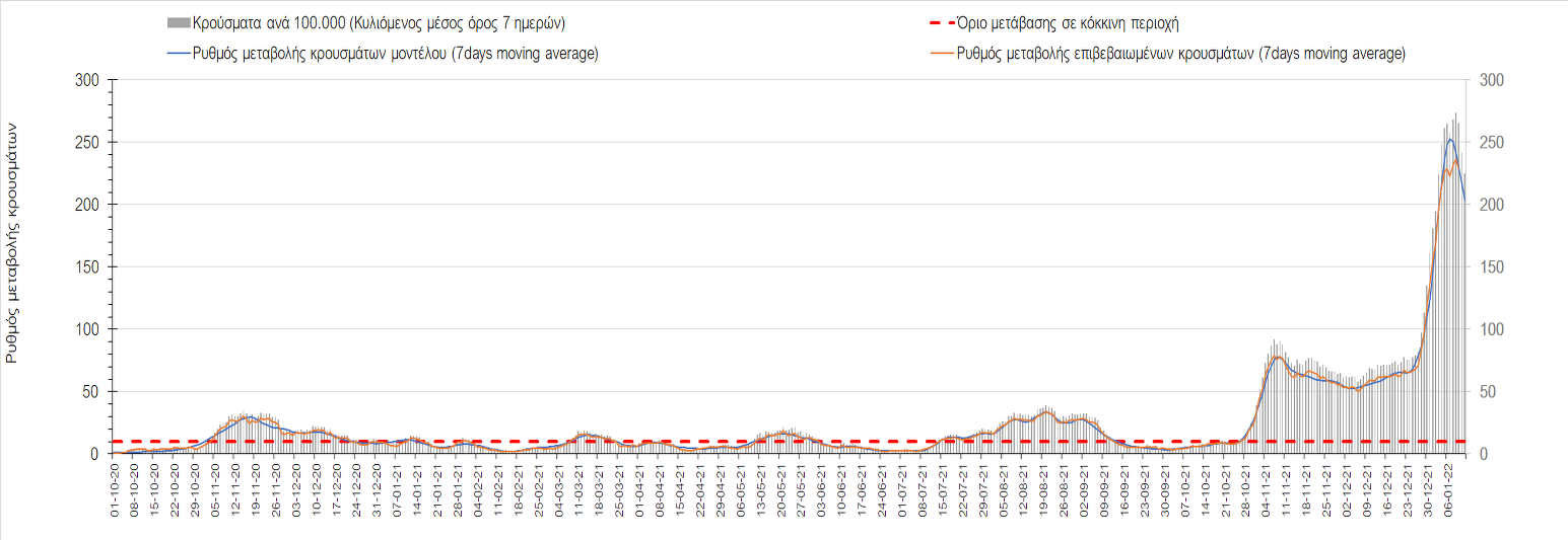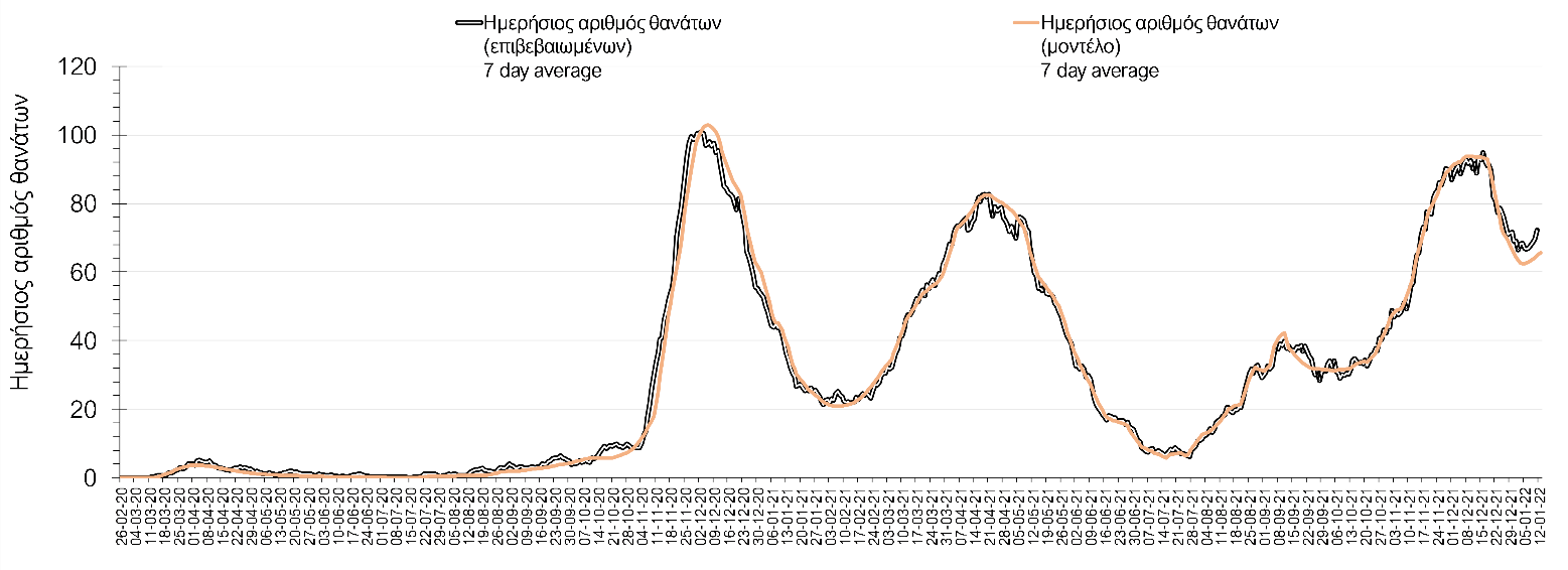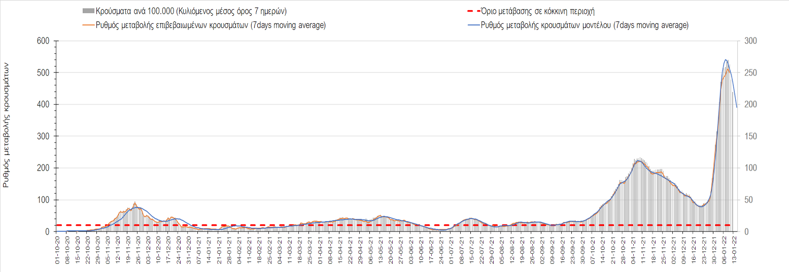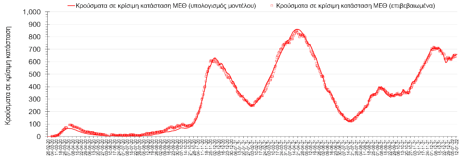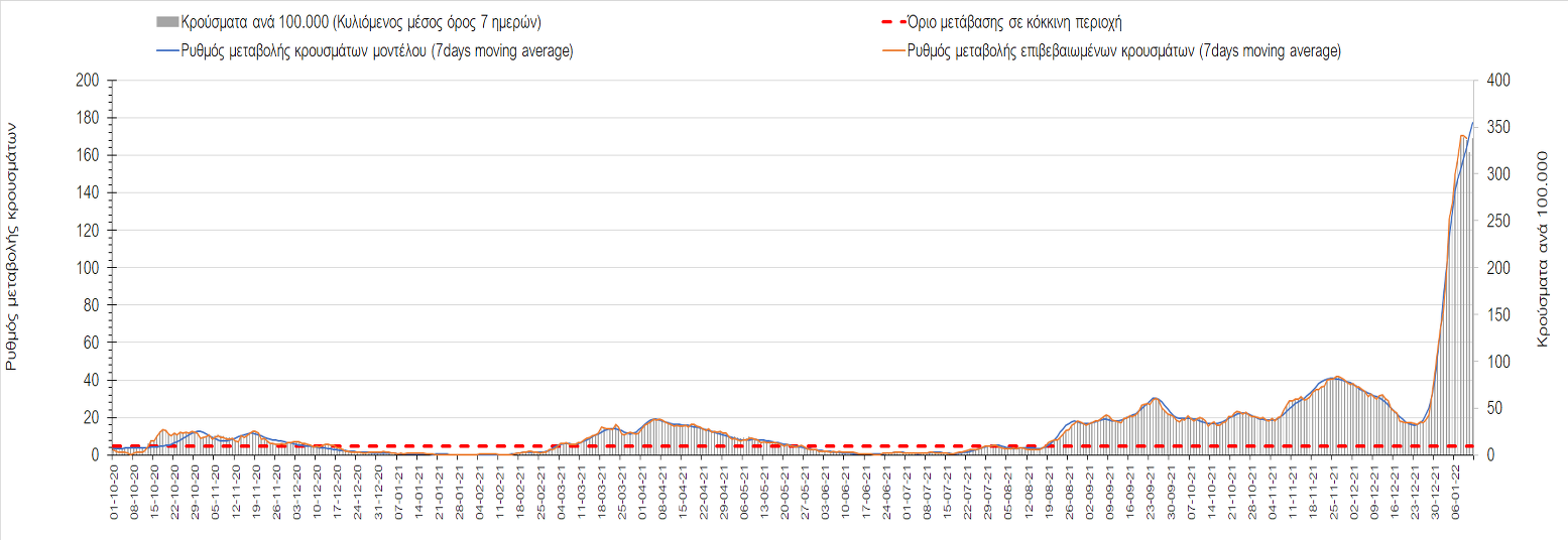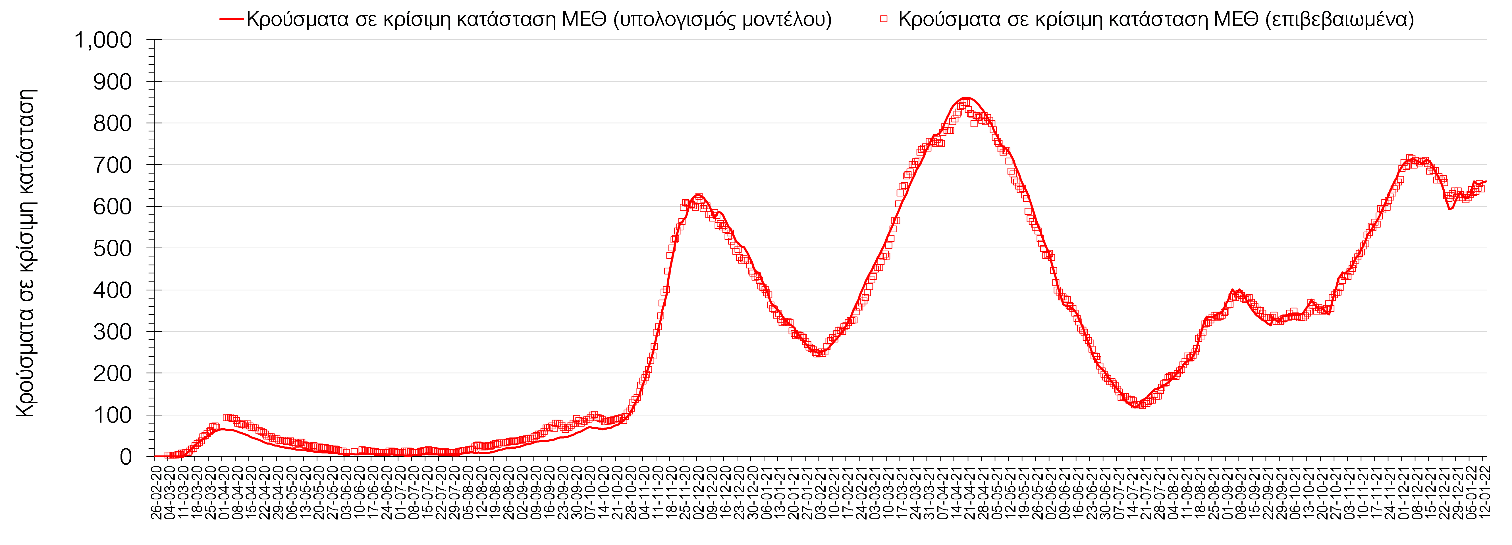 Αυτές τις ημέρες, παρατηρείται σημαντική επιβράδυνση του αριθμού των κρουσμάτων μετά από την πολύ έντονη άνοδο, η οποία πλέον είναι αποδεδειγμένο ότι οφείλεται στη διασπορά του στελέχους Ο στον πληθυσμό. Η εκτίμησή μας είναι ότι πάνω από το 95% των νέων κρουσμάτων στην ελληνική επικράτεια αφορά πια στο στέλεχος Ο. Δεδομένου ότι η αύξηση της διασποράς της παραλλαγής Ο στον ελληνικό πληθυσμό εξηγεί την παρατηρούμενη αύξηση της συνολικής διασποράς του ιού, πλέον το βάρος πέφτει στην εφαρμογή των μέτρων αντιμετώπισης της διασποράς του ιού, η οποία προβλέπεται να αναπτυχθεί περαιτέρω μέχρι τα μέσα Ιανουαρίου. Σήμερα παρατηρείται πτώση του αριθμού των κρουσμάτων (κυλιόμενος μέσος όρος 7 ημερών), και μένει να δούμε και τα αποτελέσματα των επομένων ημερών, για να διαπιστωθεί εάν όντως άρχισε νωρίτερα η κάμψη του 5ου κύματος ή αν θα υπάρξει ανάκαμψη της ανοδικής πορείας.
