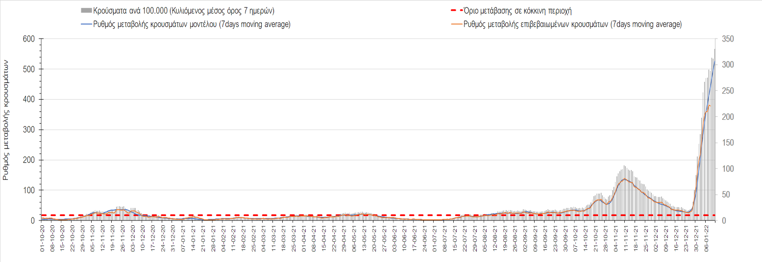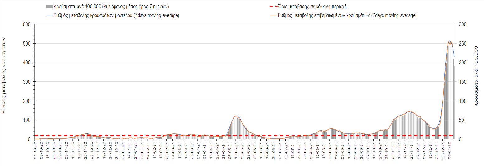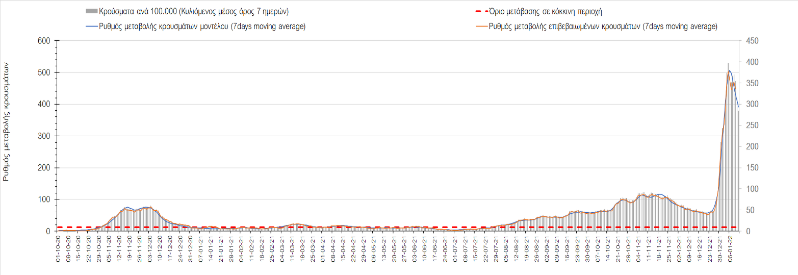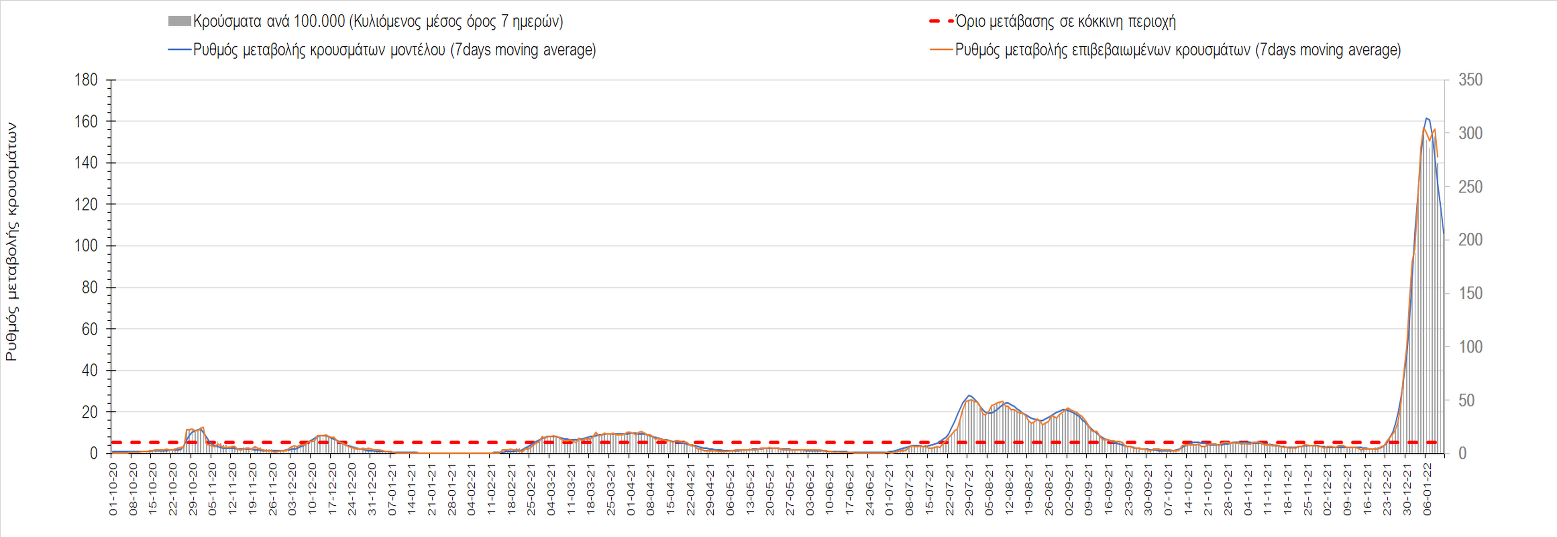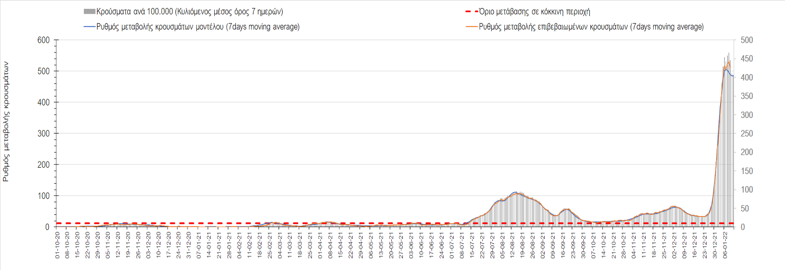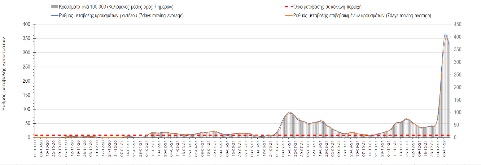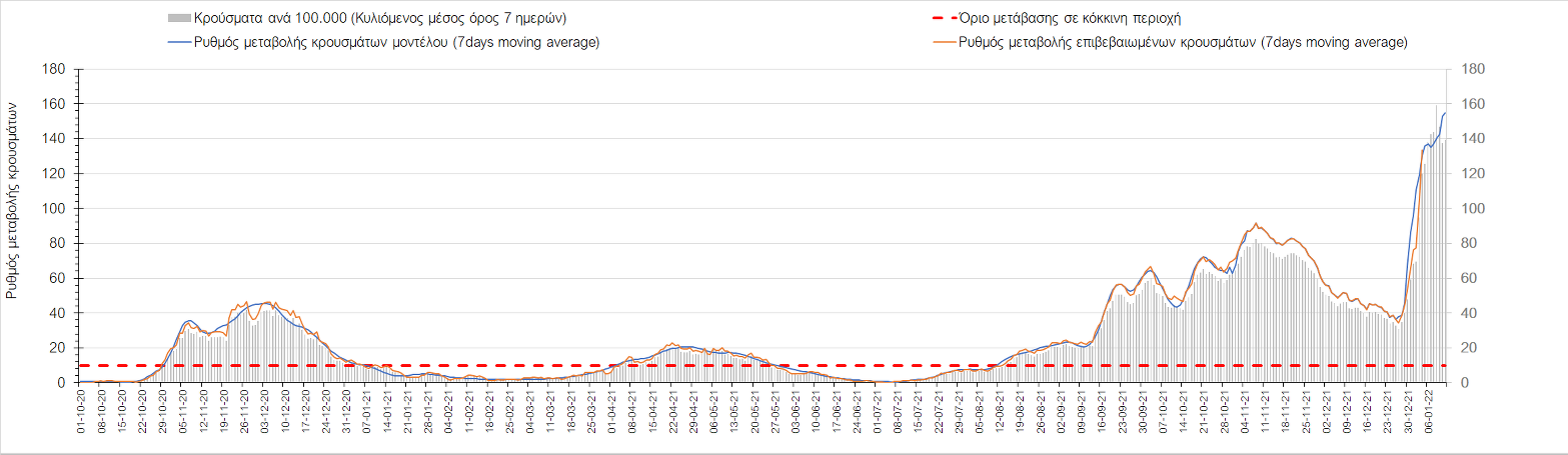 Αυτές τις ημέρες, παρατηρείται σημαντική επιβράδυνση του αριθμού των κρουσμάτων μετά από την πολύ έντονη άνοδο, η οποία πλέον είναι αποδεδειγμένο ότι οφείλεται στη διασπορά του στελέχους Ο στον πληθυσμό. Η εκτίμησή μας είναι ότι πάνω από το 95% των νέων κρουσμάτων στην ελληνική επικράτεια αφορά πια στο στέλεχος Ο. Δεδομένου ότι η αύξηση της διασποράς της παραλλαγής Ο στον ελληνικό πληθυσμό εξηγεί την παρατηρούμενη αύξηση της συνολικής διασποράς του ιού, πλέον το βάρος πέφτει στην εφαρμογή των μέτρων αντιμετώπισης της διασποράς του ιού, η οποία προβλέπεται να αναπτυχθεί περαιτέρω μέχρι τα μέσα Ιανουαρίου. Σήμερα παρατηρείται πτώση του αριθμού των κρουσμάτων (κυλιόμενος μέσος όρος 7 ημερών), και μένει να δούμε και τα αποτελέσματα των επομένων ημερών, για να διαπιστωθεί εάν όντως άρχισε νωρίτερα η κάμψη του 5ου κύματος ή αν θα υπάρξει ανάκαμψη της ανοδικής πορείας.