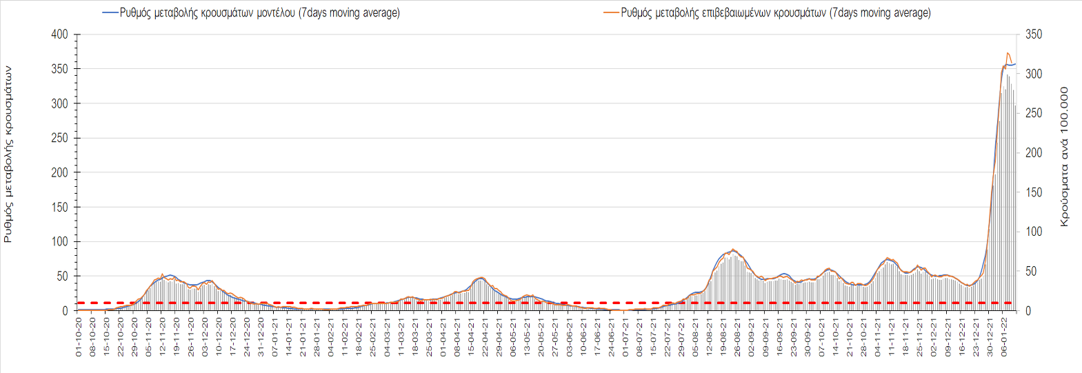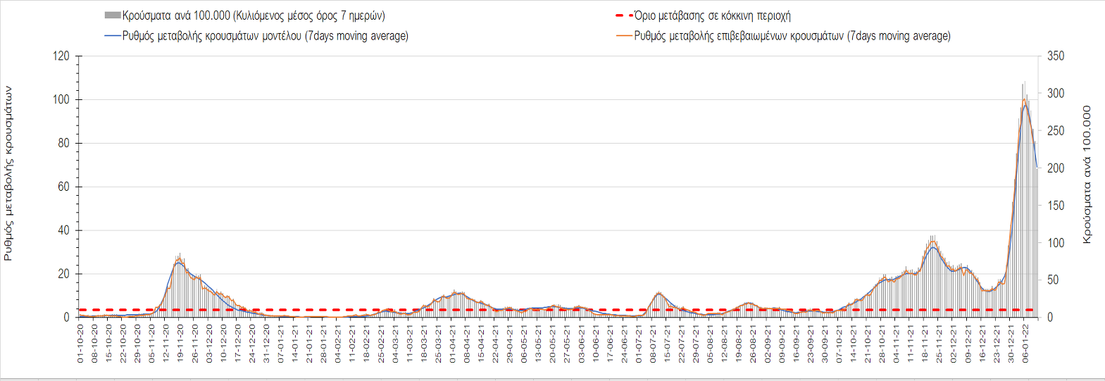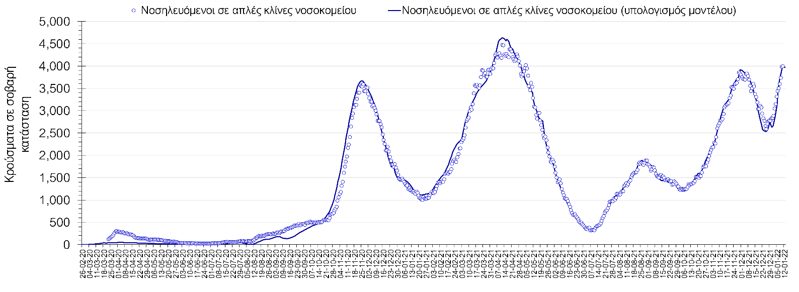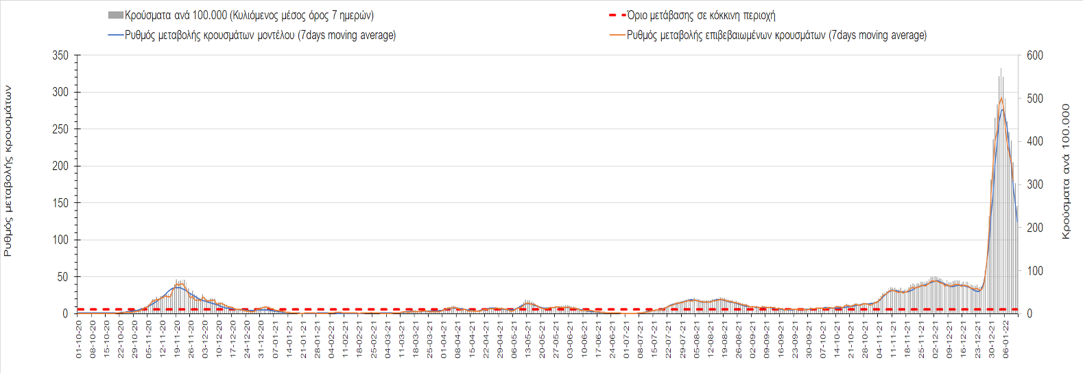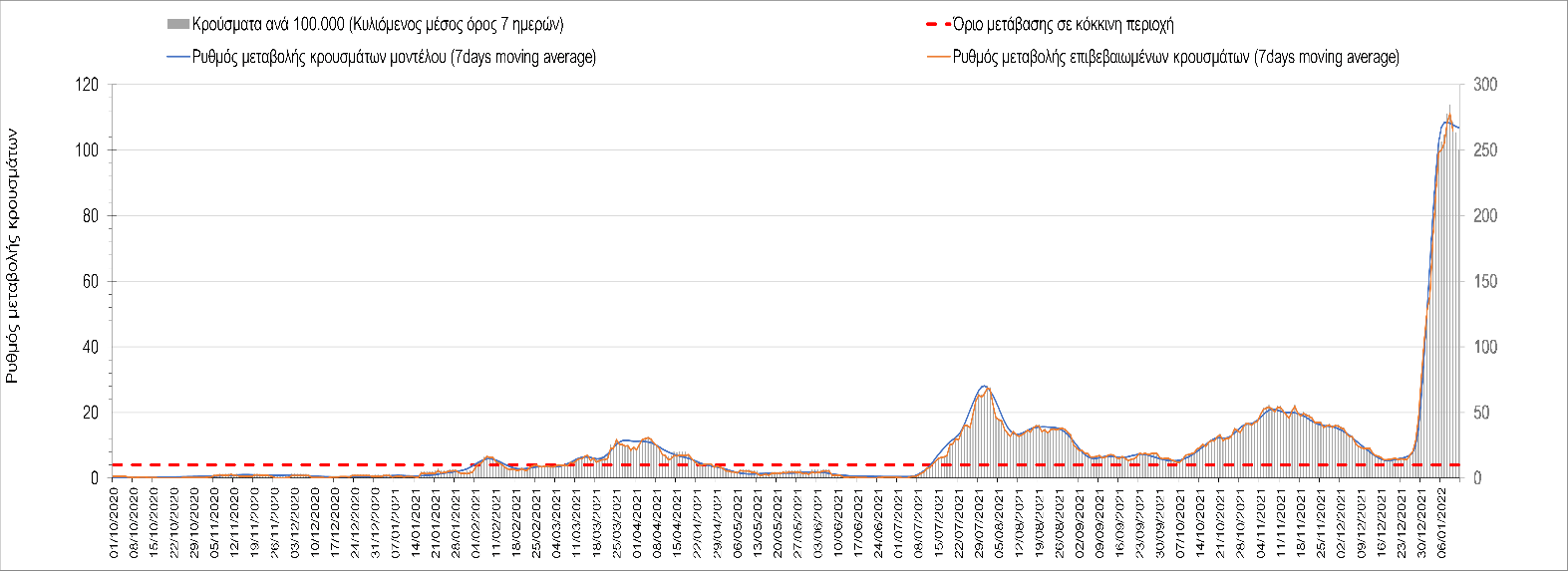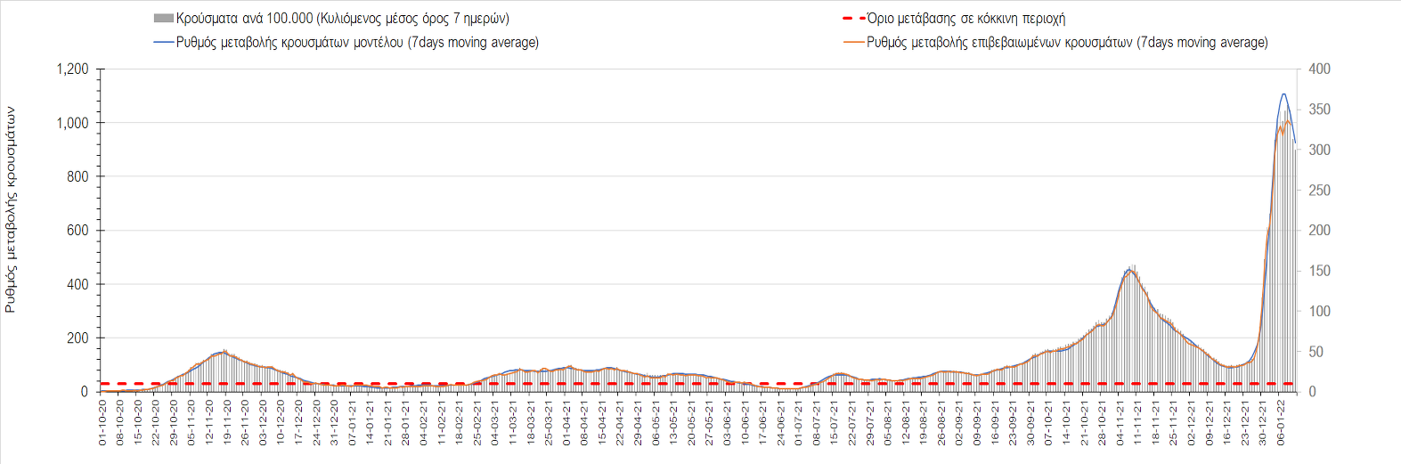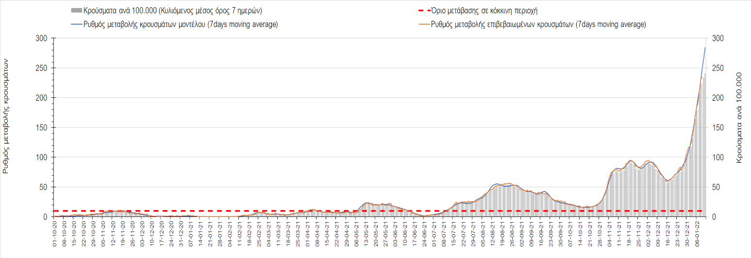 Αυτές τις ημέρες, παρατηρείται σημαντική επιβράδυνση του αριθμού των κρουσμάτων μετά από την πολύ έντονη άνοδο, η οποία πλέον είναι αποδεδειγμένο ότι οφείλεται στη διασπορά του στελέχους Ο στον πληθυσμό. Η εκτίμησή μας είναι ότι πάνω από το 95% των νέων κρουσμάτων στην ελληνική επικράτεια αφορά πια στο στέλεχος Ο. Δεδομένου ότι η αύξηση της διασποράς της παραλλαγής Ο στον ελληνικό πληθυσμό εξηγεί την παρατηρούμενη αύξηση της συνολικής διασποράς του ιού, πλέον το βάρος πέφτει στην εφαρμογή των μέτρων αντιμετώπισης της διασποράς του ιού, η οποία προβλέπεται να αναπτυχθεί περαιτέρω μέχρι τα μέσα Ιανουαρίου. Σήμερα παρατηρείται πτώση του αριθμού των κρουσμάτων (κυλιόμενος μέσος όρος 7 ημερών), και μένει να δούμε και τα αποτελέσματα των επομένων ημερών, για να διαπιστωθεί εάν όντως άρχισε νωρίτερα η κάμψη του 5ου κύματος ή αν θα υπάρξει ανάκαμψη της ανοδικής πορείας.