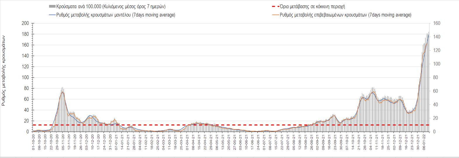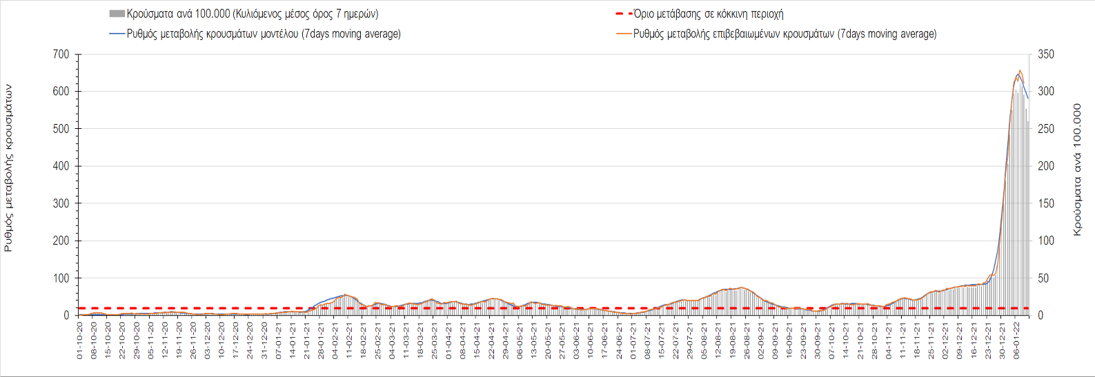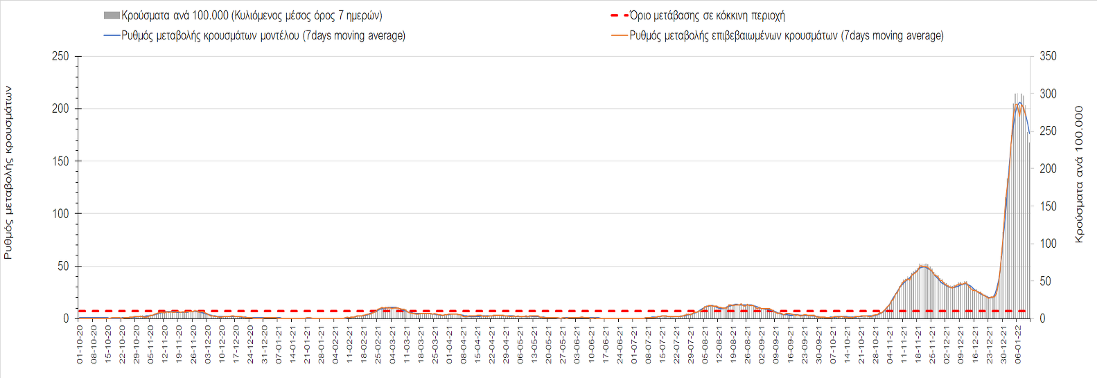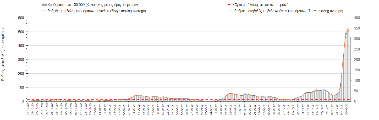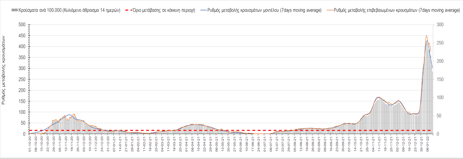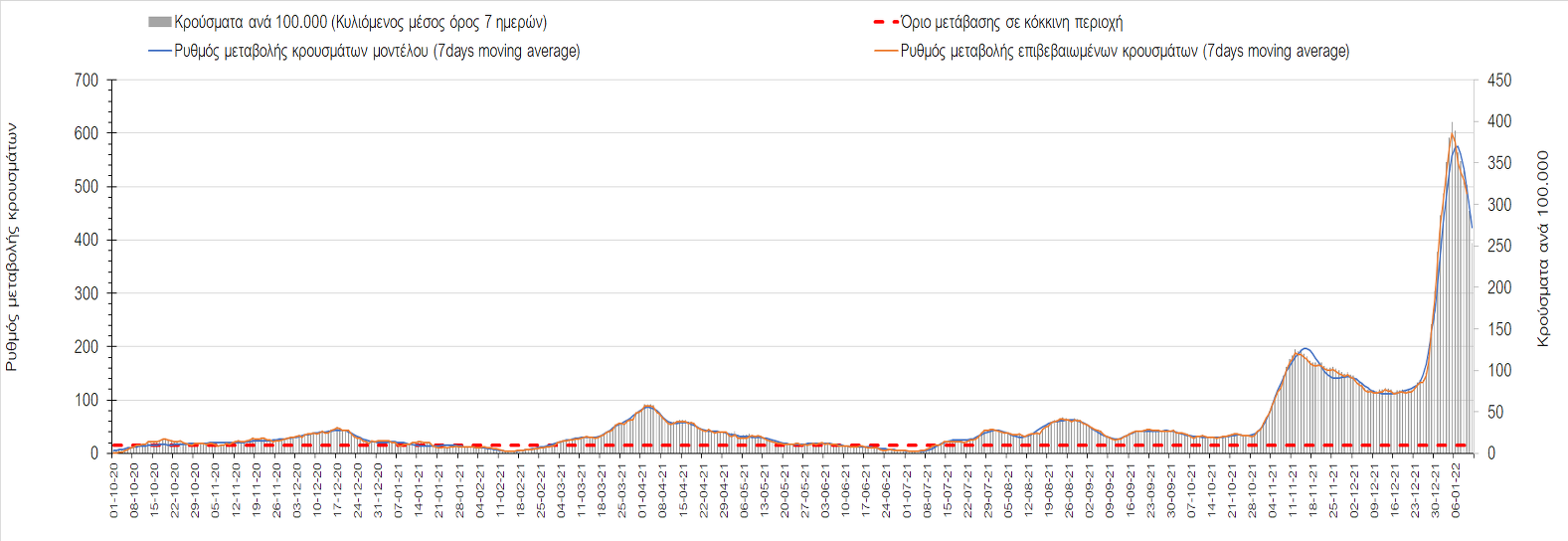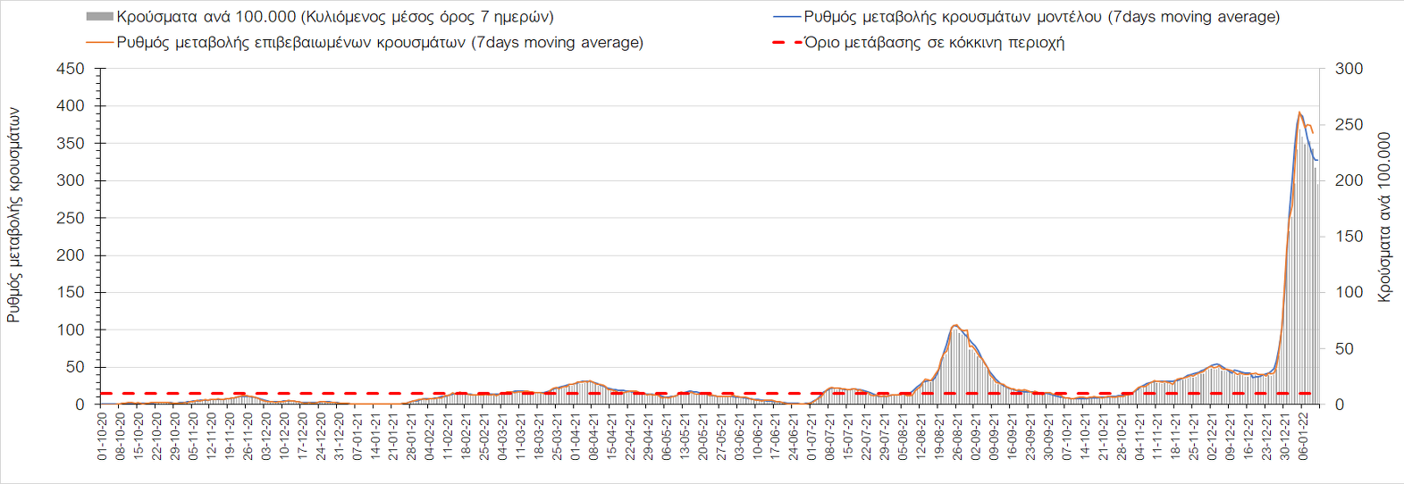 Αυτές τις ημέρες, παρατηρείται σημαντική επιβράδυνση του αριθμού των κρουσμάτων μετά από την πολύ έντονη άνοδο, η οποία πλέον είναι αποδεδειγμένο ότι οφείλεται στη διασπορά του στελέχους Ο στον πληθυσμό. Η εκτίμησή μας είναι ότι πάνω από το 95% των νέων κρουσμάτων στην ελληνική επικράτεια αφορά πια στο στέλεχος Ο. Δεδομένου ότι η αύξηση της διασποράς της παραλλαγής Ο στον ελληνικό πληθυσμό εξηγεί την παρατηρούμενη αύξηση της συνολικής διασποράς του ιού, πλέον το βάρος πέφτει στην εφαρμογή των μέτρων αντιμετώπισης της διασποράς του ιού, η οποία προβλέπεται να αναπτυχθεί περαιτέρω μέχρι τα μέσα Ιανουαρίου. Σήμερα παρατηρείται πτώση του αριθμού των κρουσμάτων (κυλιόμενος μέσος όρος 7 ημερών), και μένει να δούμε και τα αποτελέσματα των επομένων ημερών, για να διαπιστωθεί εάν όντως άρχισε νωρίτερα η κάμψη του 5ου κύματος ή αν θα υπάρξει ανάκαμψη της ανοδικής πορείας.