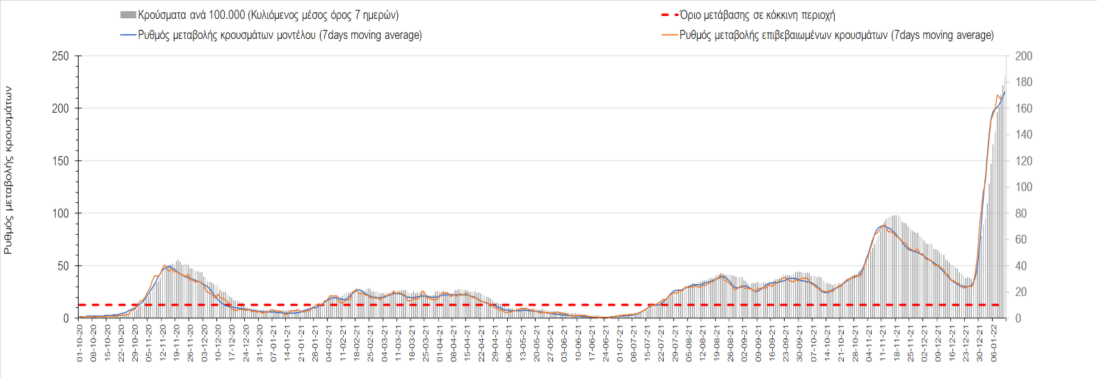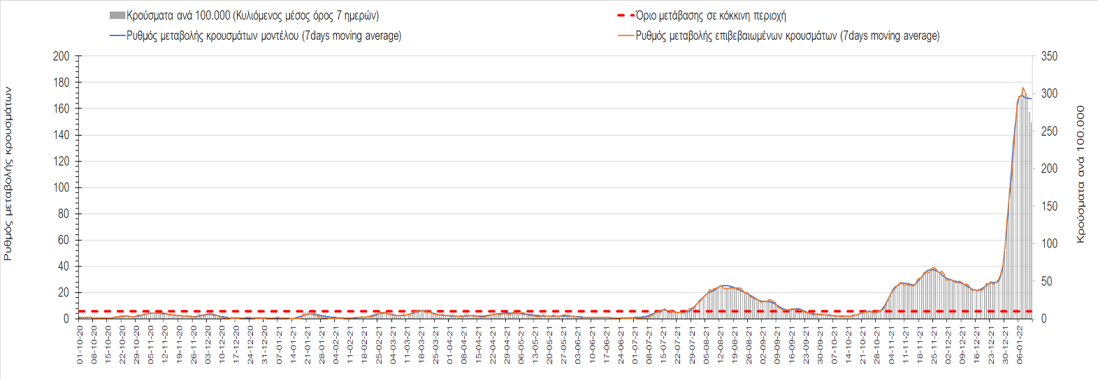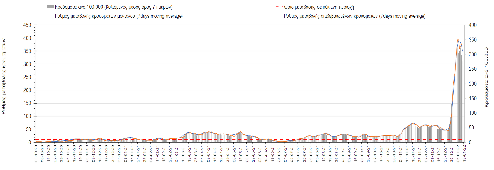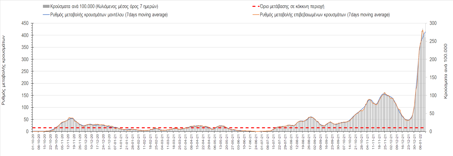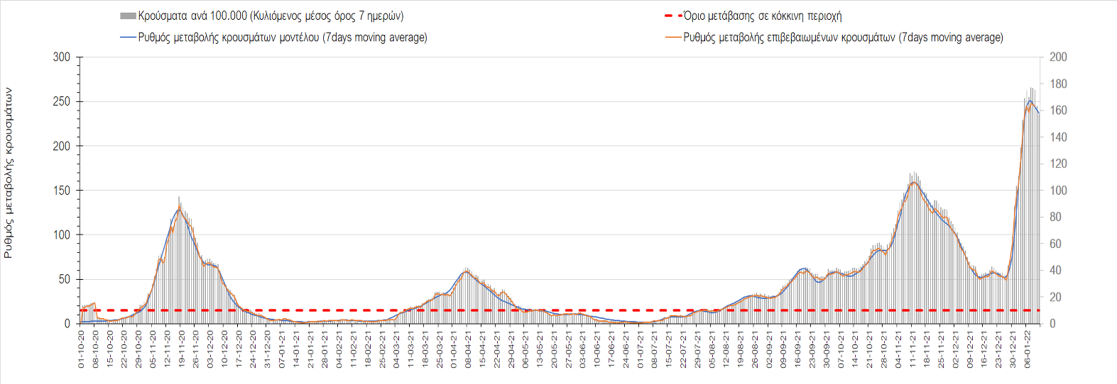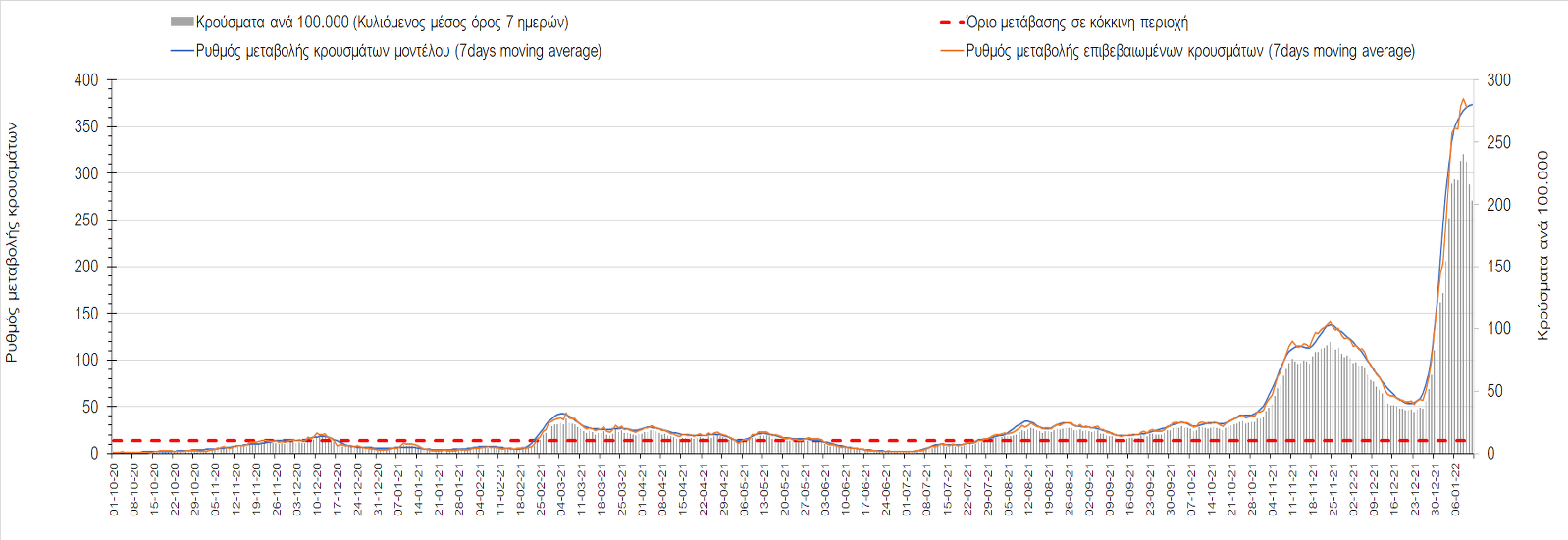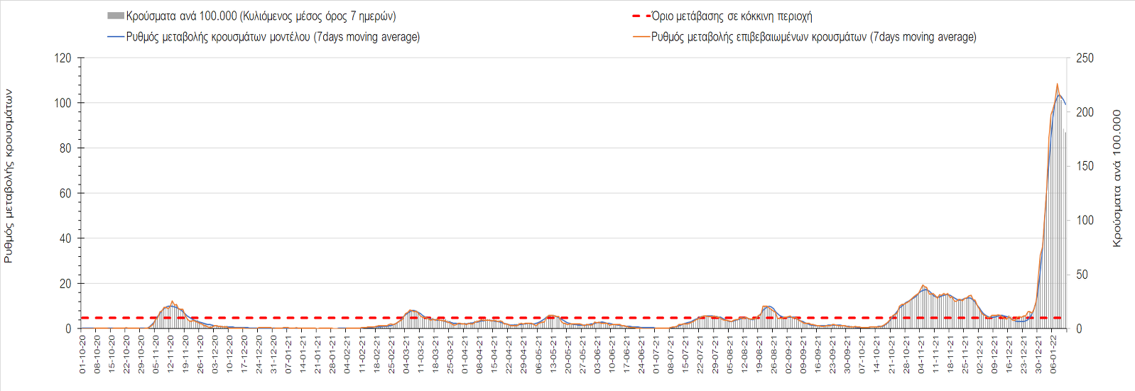 Αυτές τις ημέρες, παρατηρείται σημαντική επιβράδυνση του αριθμού των κρουσμάτων μετά από την πολύ έντονη άνοδο, η οποία πλέον είναι αποδεδειγμένο ότι οφείλεται στη διασπορά του στελέχους Ο στον πληθυσμό. Η εκτίμησή μας είναι ότι πάνω από το 95% των νέων κρουσμάτων στην ελληνική επικράτεια αφορά πια στο στέλεχος Ο. Δεδομένου ότι η αύξηση της διασποράς της παραλλαγής Ο στον ελληνικό πληθυσμό εξηγεί την παρατηρούμενη αύξηση της συνολικής διασποράς του ιού, πλέον το βάρος πέφτει στην εφαρμογή των μέτρων αντιμετώπισης της διασποράς του ιού, η οποία προβλέπεται να αναπτυχθεί περαιτέρω μέχρι τα μέσα Ιανουαρίου. Σήμερα παρατηρείται πτώση του αριθμού των κρουσμάτων (κυλιόμενος μέσος όρος 7 ημερών), και μένει να δούμε και τα αποτελέσματα των επομένων ημερών, για να διαπιστωθεί εάν όντως άρχισε νωρίτερα η κάμψη του 5ου κύματος ή αν θα υπάρξει ανάκαμψη της ανοδικής πορείας.