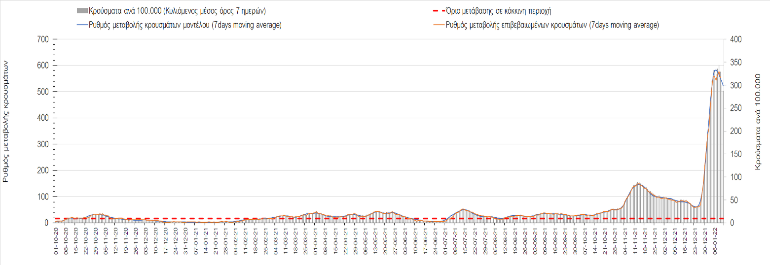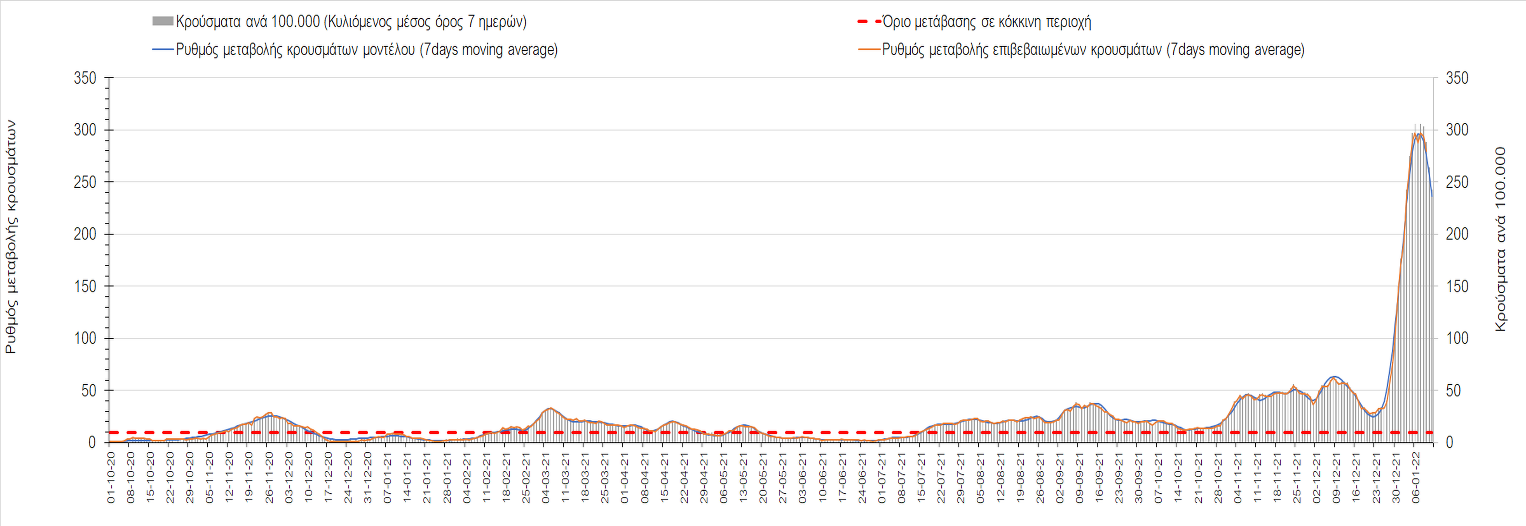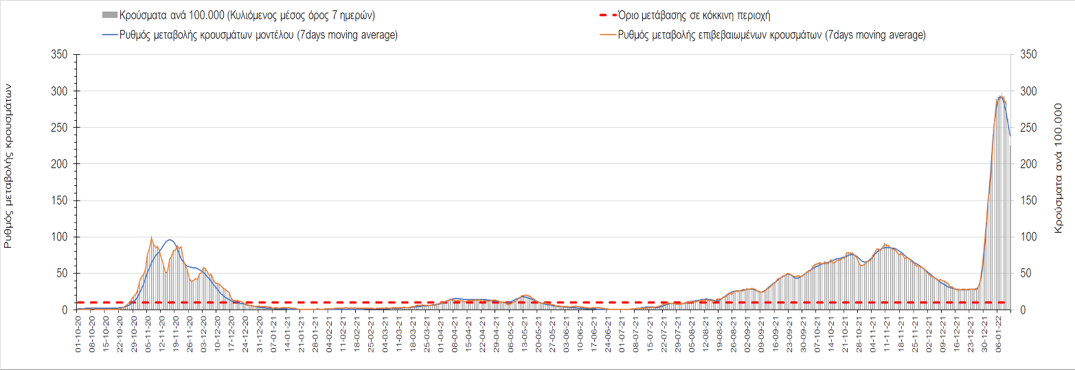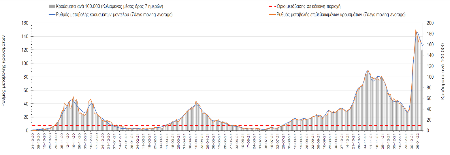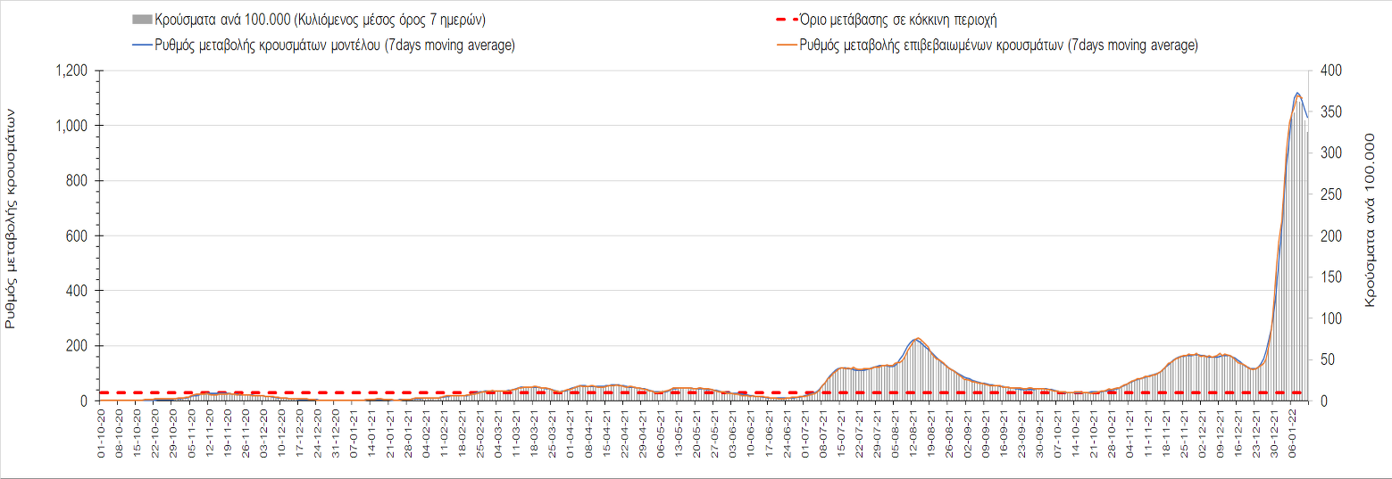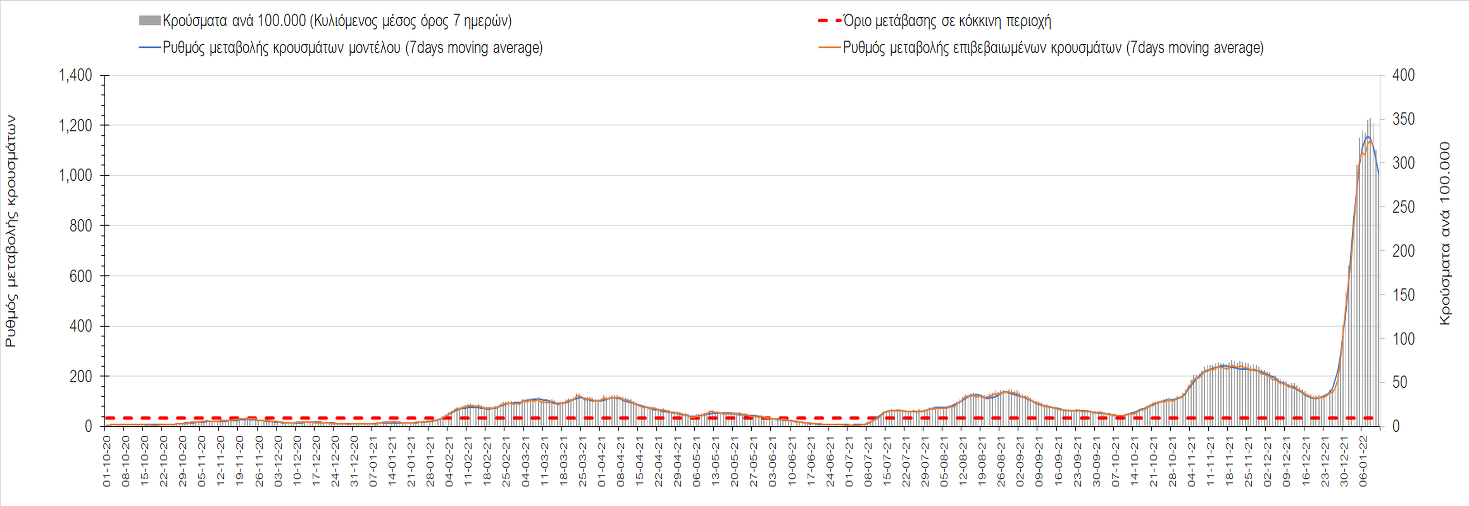 Η ανοδική τάση που είχε διαμορφωθεί από τις 23/12 και που οφείλεται στην μετάλλαξη Ο, δείχνει να περιέρχεται σε πτώση, και αντικατοπτρίζεται στον ημερήσιο αριθμό των κρουσμάτων (κυλιόμενος μέσος όρος 7 ημερών), ο οποίος βρίσκεται κάτω από τις 32.000 (31.811). Αυτή αποτυπώνεται πλέον στις περισσότερες περιοχές, πράγμα που σημαίνει ότι τα μέτρα που εφαρμοστήκαν στις 24 και 29/12, ενώ, πέρα από την εφαρμογή των μέτρων, και από το ποσοστό εμβολιασμού (και μάλιστα με 3η δόση), έχει αυξηθεί σημαντικότερα του αναμενόμενου το ποσοστό φυσικής ανοσίας, λόγω του μεγάλου αριθμού ασυμπτωματικών που νόσησαν από το στέλεχος Ο. Μένει να δούμε και στις επόμενες ημέρες, εάν η πτωτική πορεία όντως ξεκίνησε ή θα ακολουθήσει συνέχιση της ανοδικής πορείας. Πέρα από την εφαρμογή των μέτρων (σε συνδυασμό με την σημαντική συνειδητοποίηση εκ μέρους του πληθυσμού ότι χρειάζεται προσοχή και σύνεση για την αντιμετώπιση της διασποράς της παραλλαγής Ο), η συστηματική αποκλιμάκωση της πανδημίας (της οποίας η έναρξη όπως ήδη βλέπουμε να τοποθετείται σε διαφορετικό χρονικό σημείο ανά περιοχή) θα οφείλεται στο συνδυασμό των επιπέδων ανοσίας του πληθυσμού (επίκτητη και φυσική), αλλά και στον πολύ μεγάλο αριθμό των τεστ συνολικά (μοριακά, rapid και self-test) που πραγματοποιούνται καθημερινά, των οποίων ο αριθμός έχει φθάσει σε ημερήσια βάση τις 700.000.