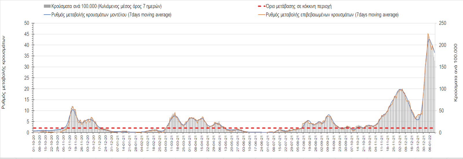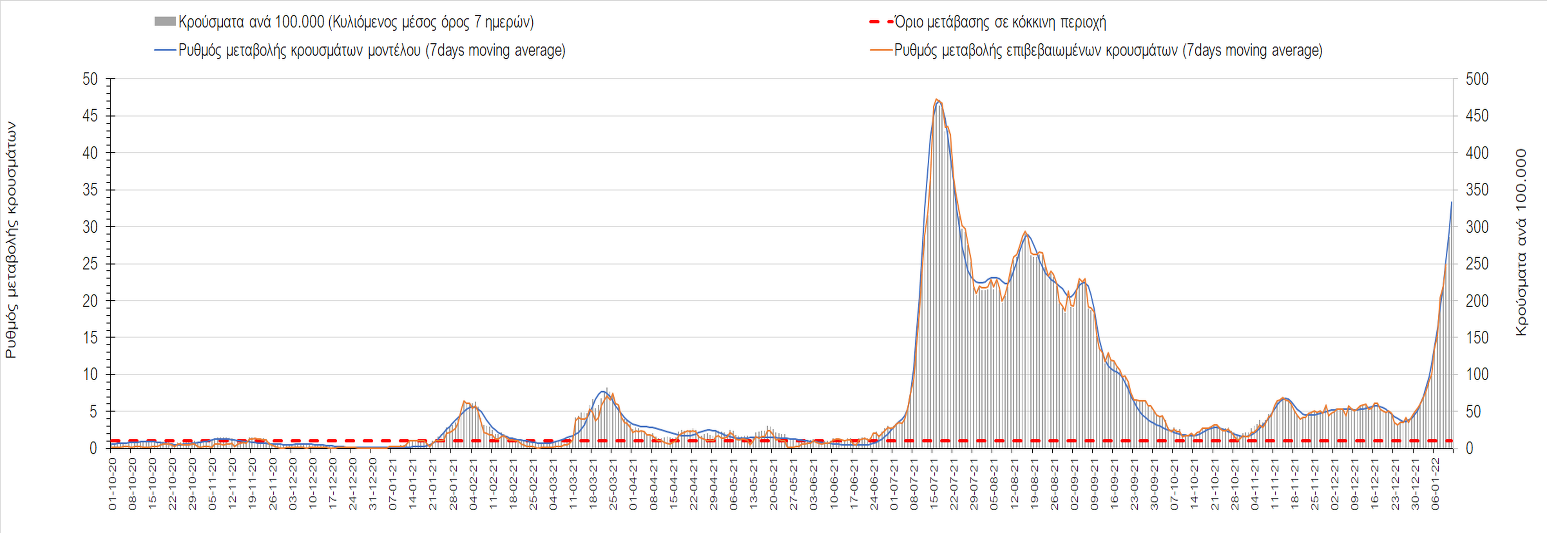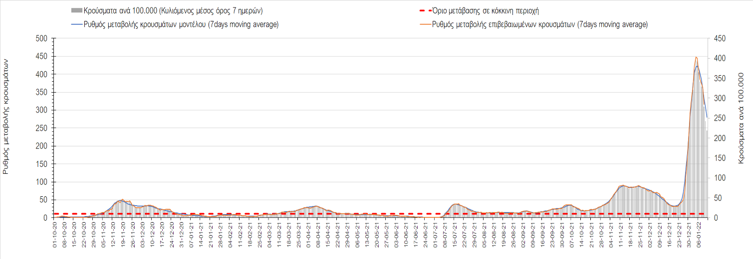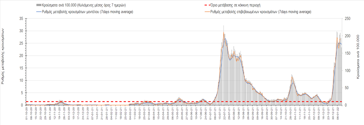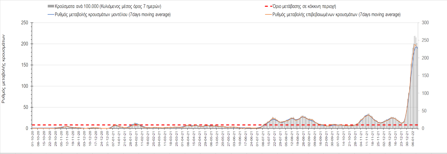 Η ανοδική τάση που είχε διαμορφωθεί από τις 23/12 και που οφείλεται στην μετάλλαξη Ο, δείχνει να περιέρχεται σε πτώση, και αντικατοπτρίζεται στον ημερήσιο αριθμό των κρουσμάτων (κυλιόμενος μέσος όρος 7 ημερών), ο οποίος βρίσκεται κάτω από τις 32.000 (31.811). Αυτή αποτυπώνεται πλέον στις περισσότερες περιοχές, πράγμα που σημαίνει ότι τα μέτρα που εφαρμοστήκαν στις 24 και 29/12, ενώ, πέρα από την εφαρμογή των μέτρων, και από το ποσοστό εμβολιασμού (και μάλιστα με 3η δόση), έχει αυξηθεί σημαντικότερα του αναμενόμενου το ποσοστό φυσικής ανοσίας, λόγω του μεγάλου αριθμού ασυμπτωματικών που νόσησαν από το στέλεχος Ο. Μένει να δούμε και στις επόμενες ημέρες, εάν η πτωτική πορεία όντως ξεκίνησε ή θα ακολουθήσει συνέχιση της ανοδικής πορείας. Πέρα από την εφαρμογή των μέτρων (σε συνδυασμό με την σημαντική συνειδητοποίηση εκ μέρους του πληθυσμού ότι χρειάζεται προσοχή και σύνεση για την αντιμετώπιση της διασποράς της παραλλαγής Ο), η συστηματική αποκλιμάκωση της πανδημίας (της οποίας η έναρξη όπως ήδη βλέπουμε να τοποθετείται σε διαφορετικό χρονικό σημείο ανά περιοχή) θα οφείλεται στο συνδυασμό των επιπέδων ανοσίας του πληθυσμού (επίκτητη και φυσική), αλλά και στον πολύ μεγάλο αριθμό των τεστ συνολικά (μοριακά, rapid και self-test) που πραγματοποιούνται καθημερινά, των οποίων ο αριθμός έχει φθάσει σε ημερήσια βάση τις 700.000.