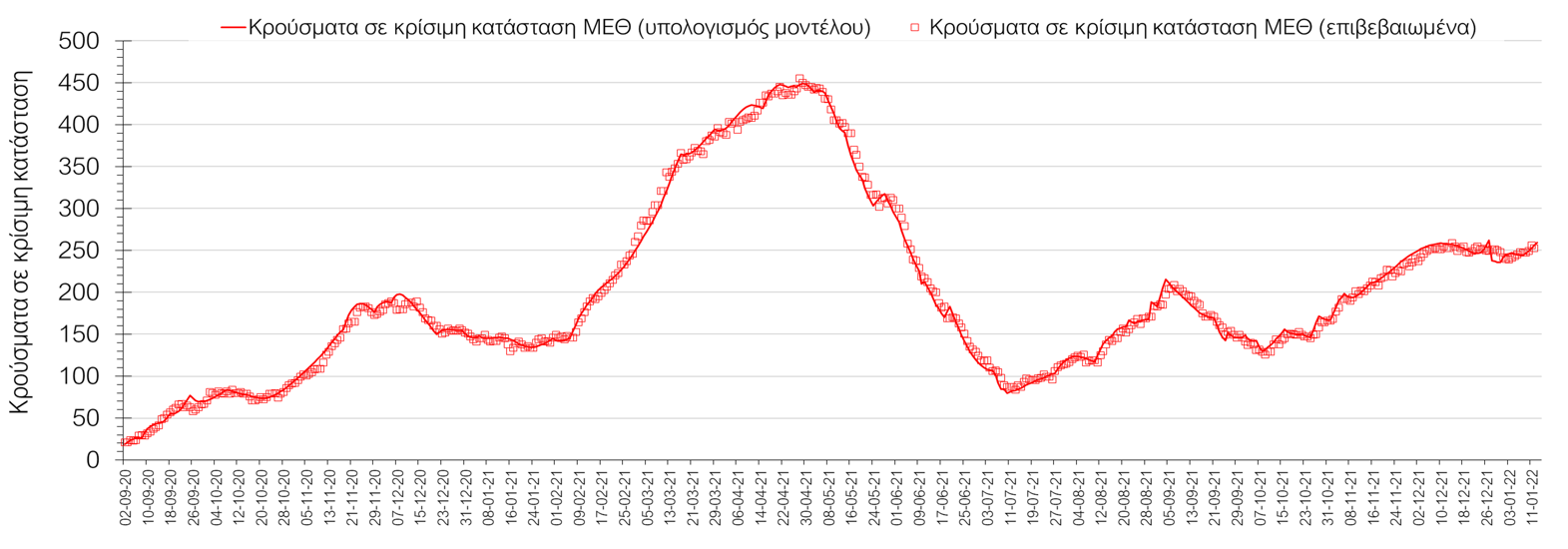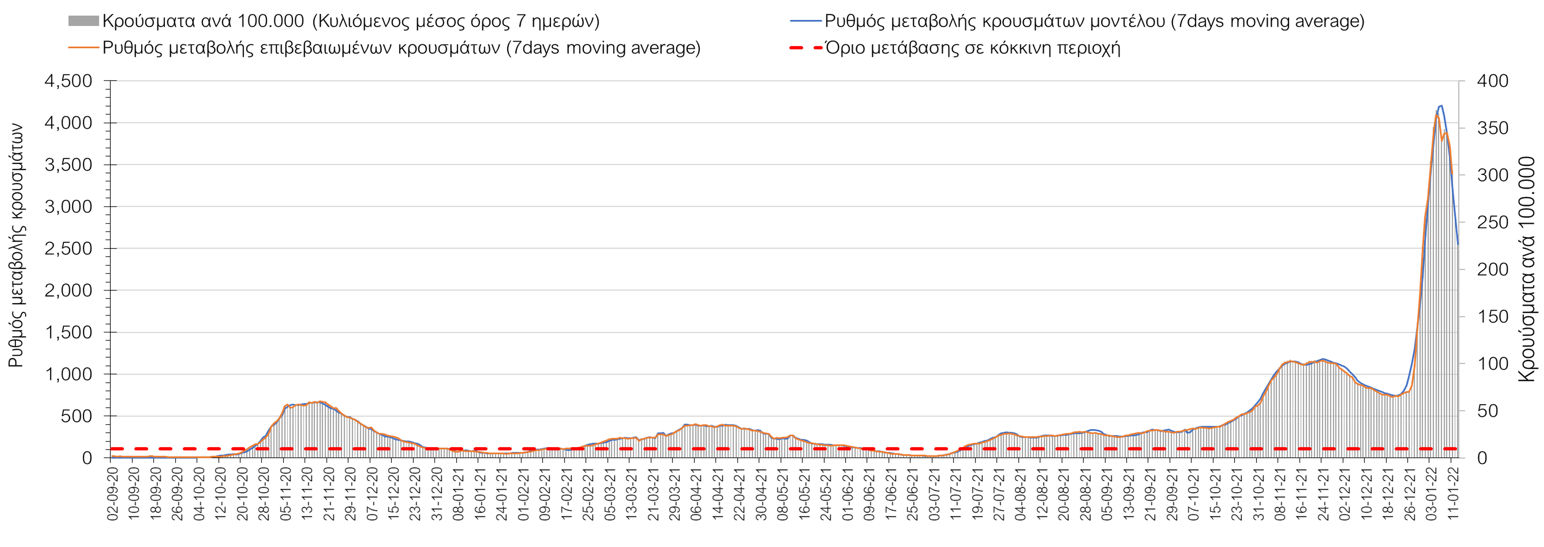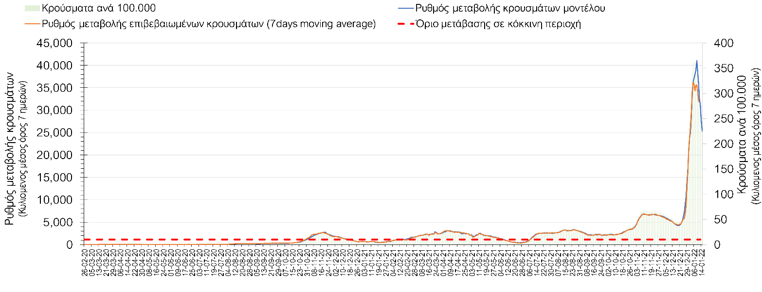 Η πορεία της μέσης εβδομαδιαίας τιμής των κρουσμάτων, καθώς και του κυλιόμενου μέσου όρου 7 ημερών του αριθμού των κρουσμάτων ανά 100.000 πληθυσμού, όπως έχουν καταγραφεί από τον ΕΟΔΥ και η αναμενόμενη πορεία τους όπως προδιαγράφεται από την υπολογιστική πλατφόρμα CORE για την Ελληνική επικράτεια μέχρι τις 15 Ιανουαρίου, αποτυπώνονται στο Σχήμα 4. Αυτή η προβλεπόμενη πορεία, που αφορά τα κρούσματα, τους νοσηλευόμενους σε απλές κλίνες, όσο και σε ΜΕΘ, καθώς επίσης και τους θανάτους, βασίζεται στις ακόλουθες παραδοχές: