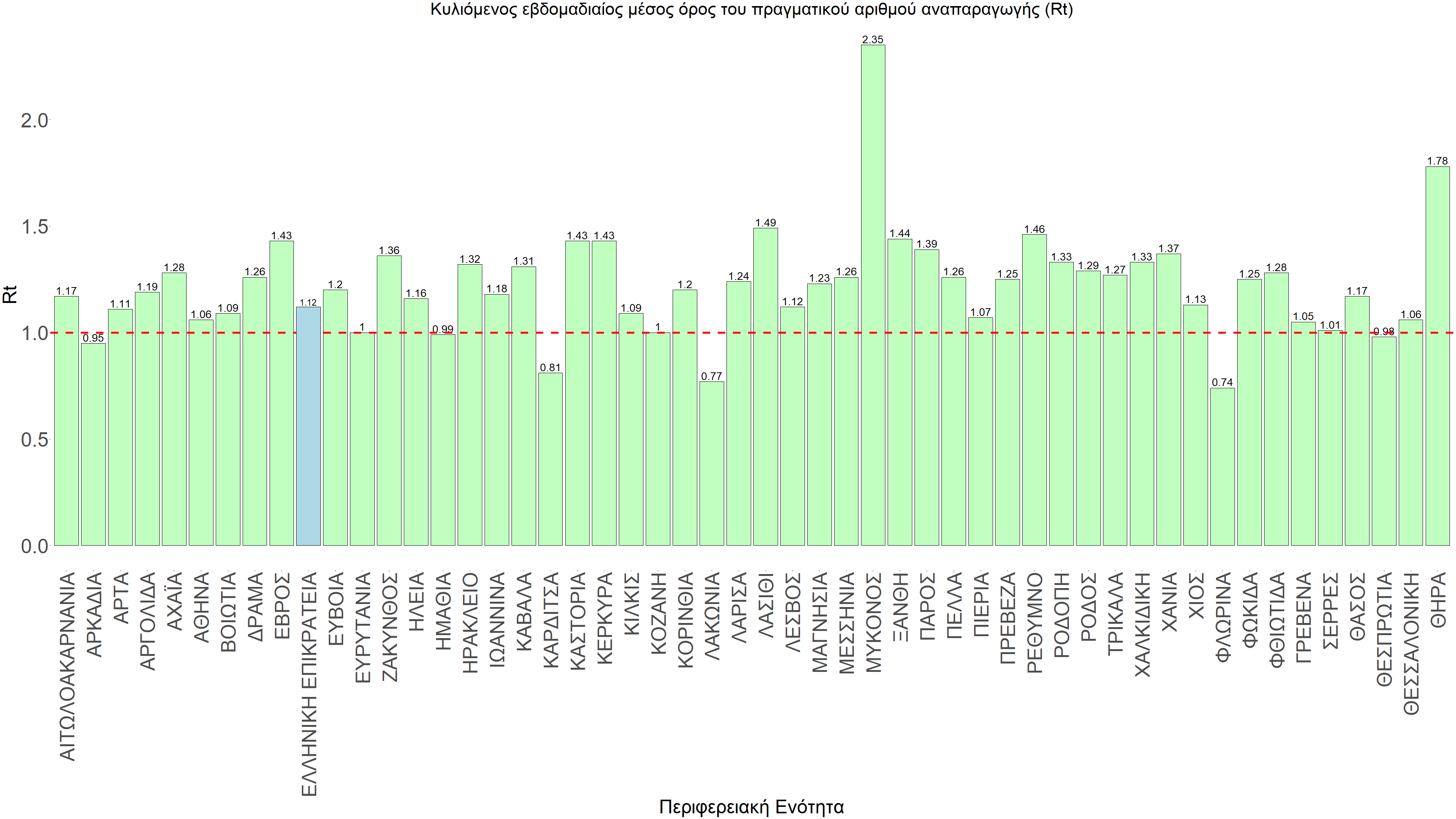 O πραγματικός αριθμός αναπαραγωγής Rt ανά περιφερειακή ενότητα της χώρας παρουσιάζεται στο Σχήμα 58.