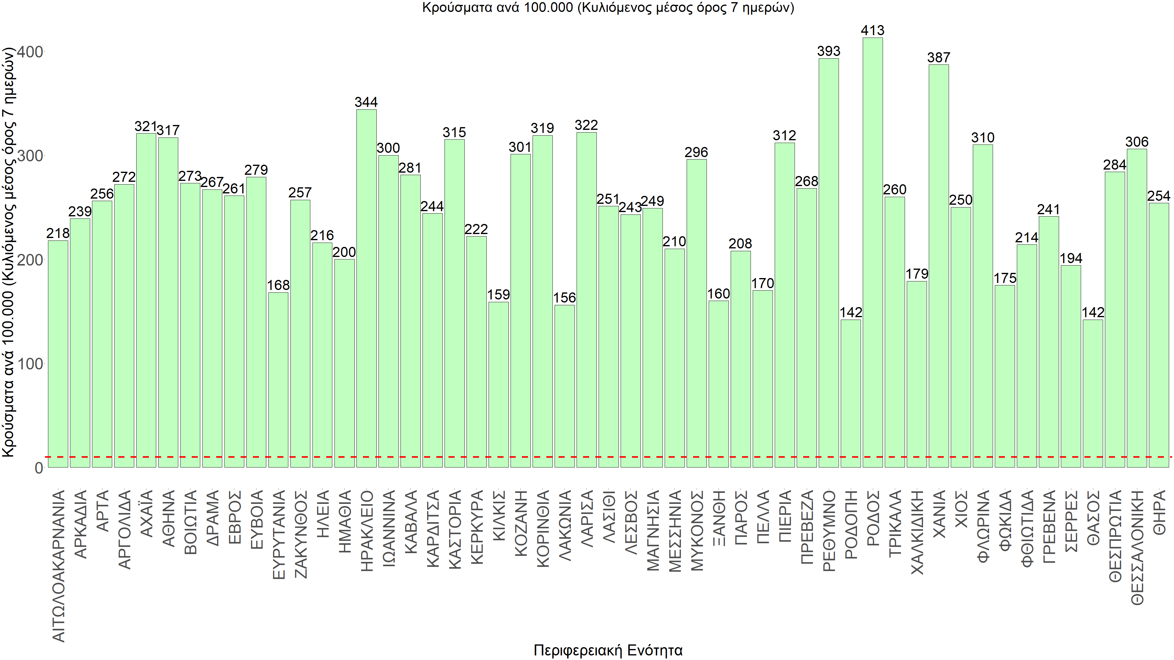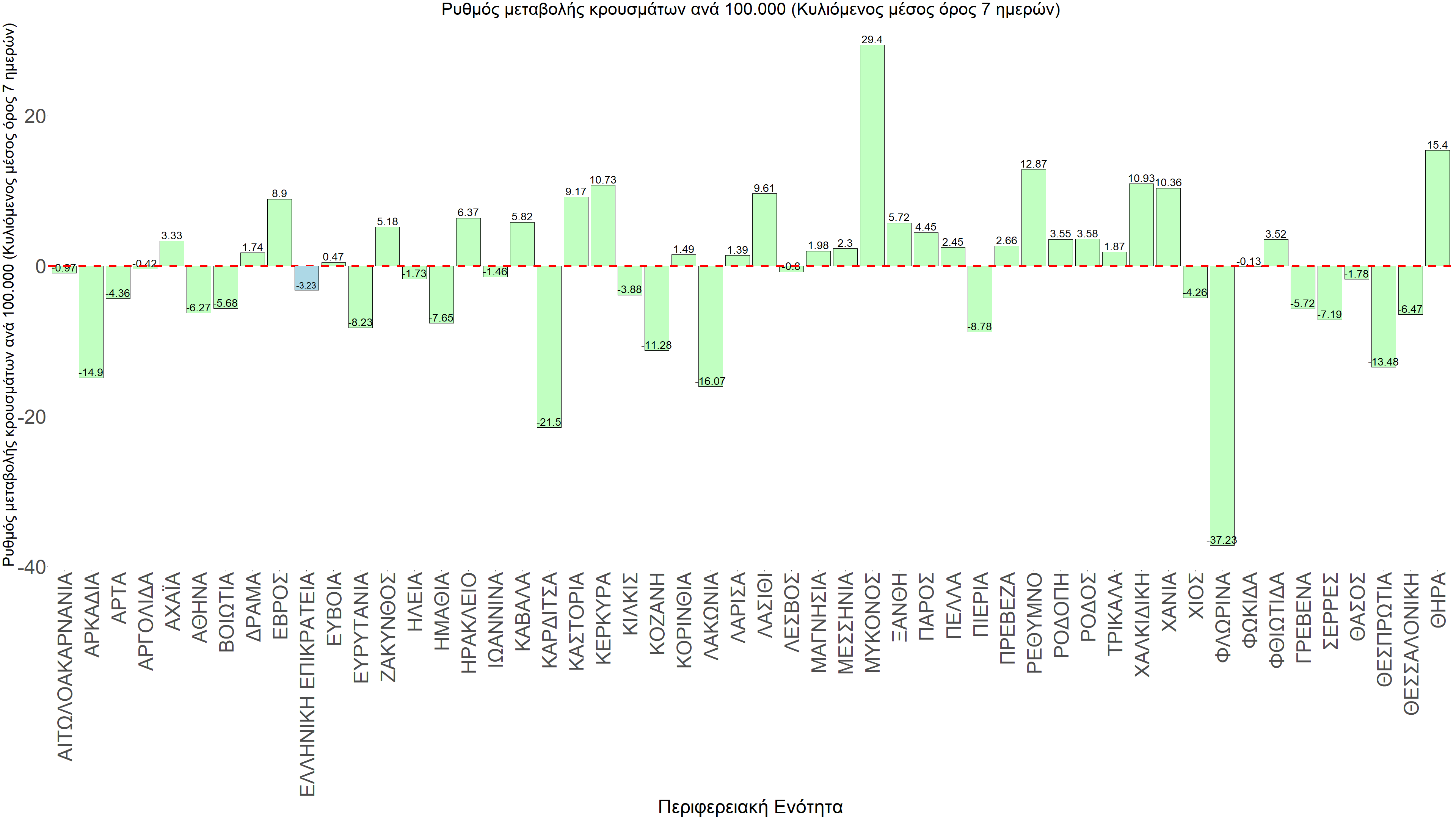 Η αποτύπωση των τάσεων στις επιμέρους περιοχές, παρουσιάζεται στο Σχήμα 61, όπου παρουσιάζεται ο ρυθμός μεταβολής των νέων κρουσμάτων ανά 100.000 κατοίκους (κυλιόμενος μέσος όρος 7 ημερών) των επιμέρους περιοχών. Θετικές τιμές του ρυθμού μεταβολής υποδηλώνουν άνοδο, ενώ αρνητικές τιμές υποδηλώνουν πτωτική πορεία. Το σχήμα αυτό είναι ιδιαίτερα κατατοπιστικό, γιατί οι τιμές που παρουσιάζονται είναι κανονικοποιημένες ως προς τον πληθυσμό, και η σύγκριση των τάσεων ανάμεσα στις επιμέρους περιοχές είναι άμεση.