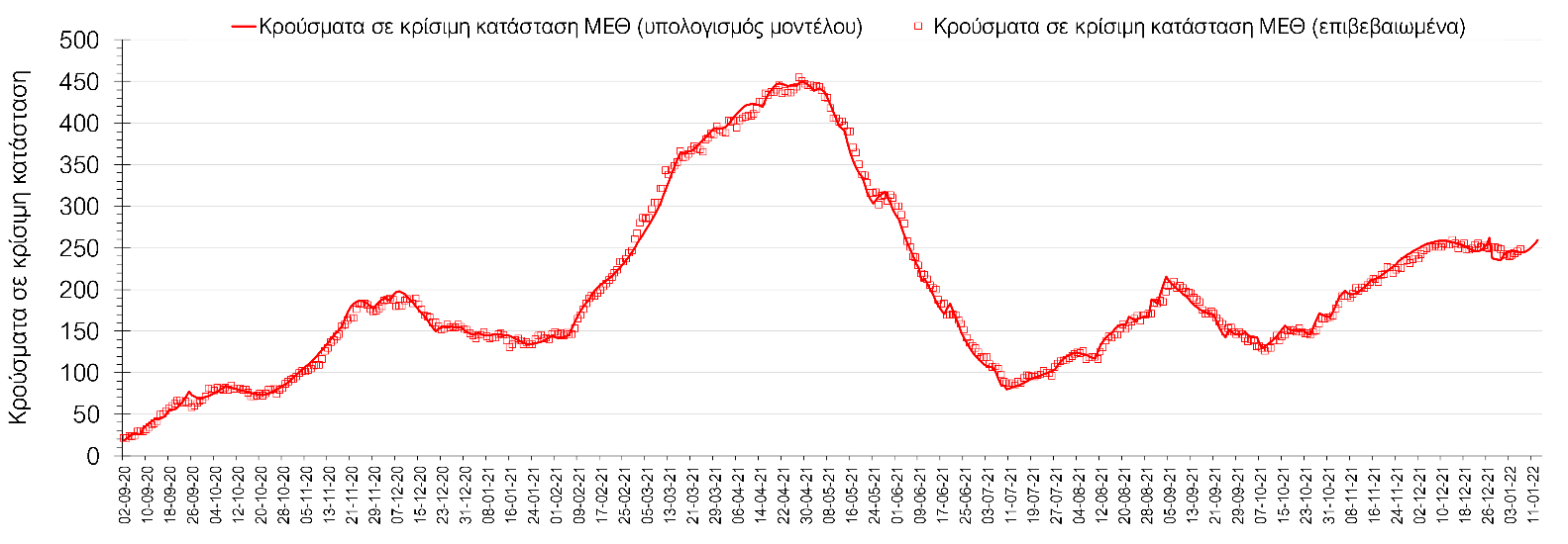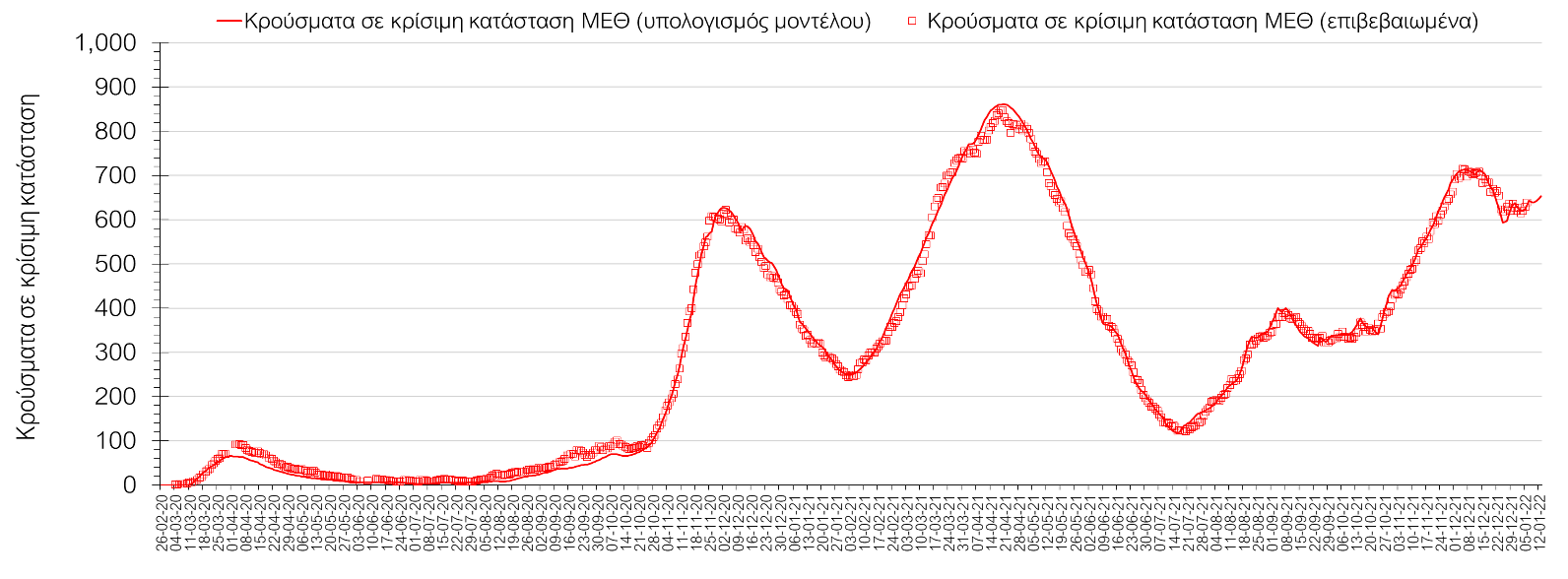 Όσον αφορά στους ασθενείς σε κρίσιμη κατάσταση (διασωληνωμένοι σε ΜΕΘ), την Πέμπτη ο αριθμός είναι αυξημένος  σε σχέση με προχθές (639 από 628). Η καμπύλη εξέλιξης του αριθμού των ασθενών που νοσηλεύονται σε κλίνες ΜΕΘ με βάση τις προσομοιώσεις της πλατφόρμας CORE, παρουσιάζεται στο Σχήμα 1, των ασθενών που νοσηλεύονται σε απλές κλίνες στο Σχήμα 2 (όπου διαφαίνεται πλέον η αναμενόμενη αύξηση στις νοσηλείες τις τελευταίες ημέρες), ενώ η εκτίμησή μας για την πορεία των θανάτων ανά ημέρα παρουσιάζεται στο Σχήμα 3.