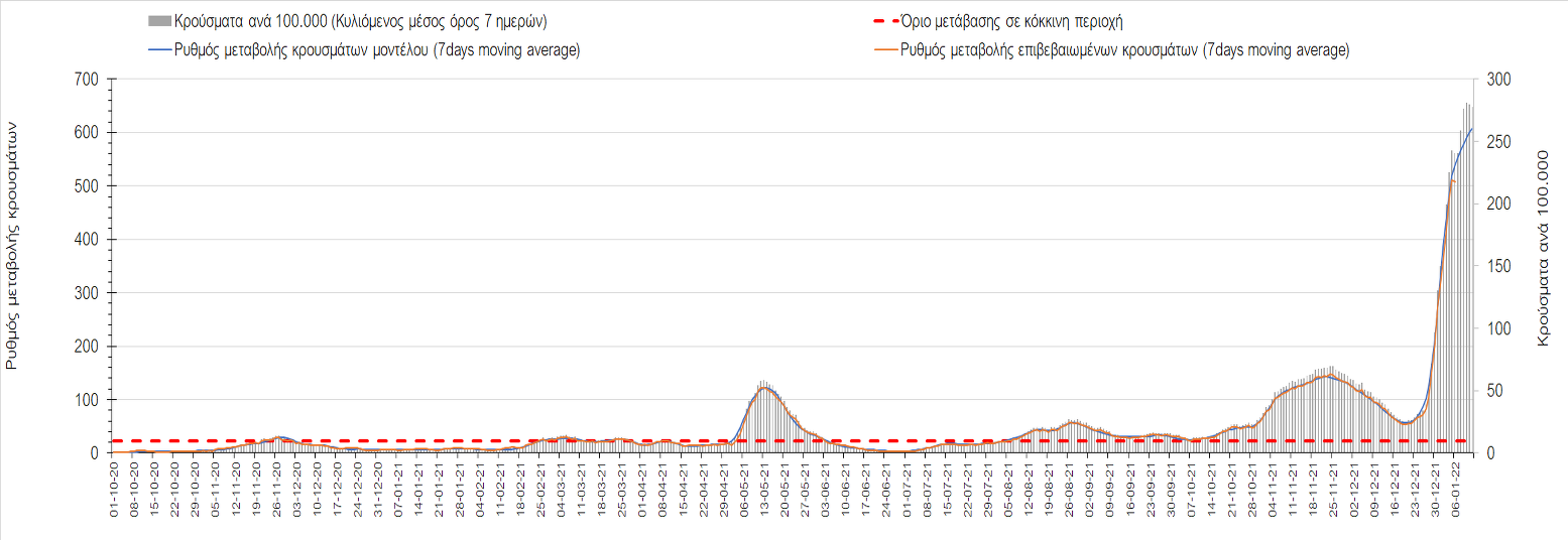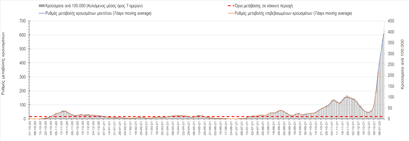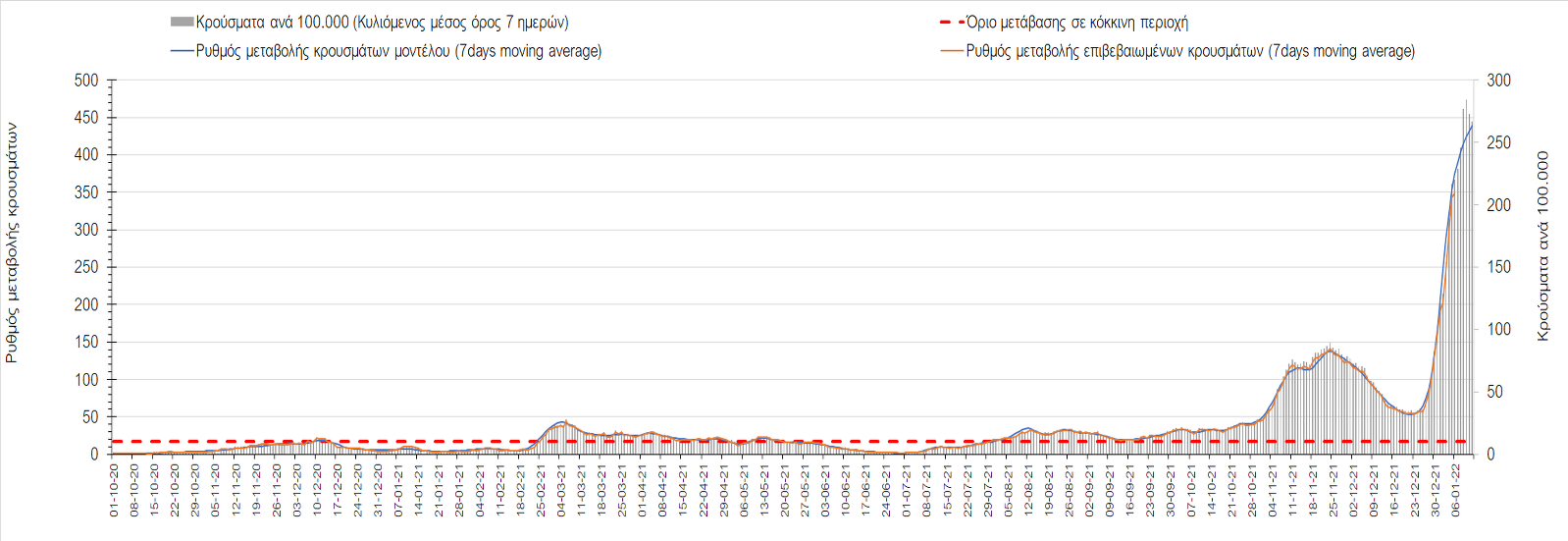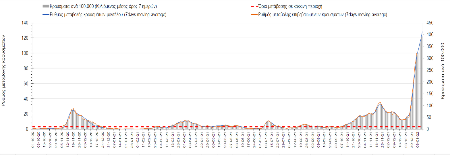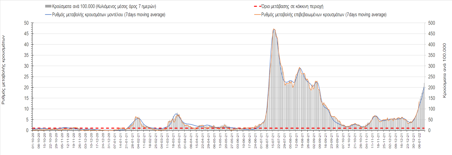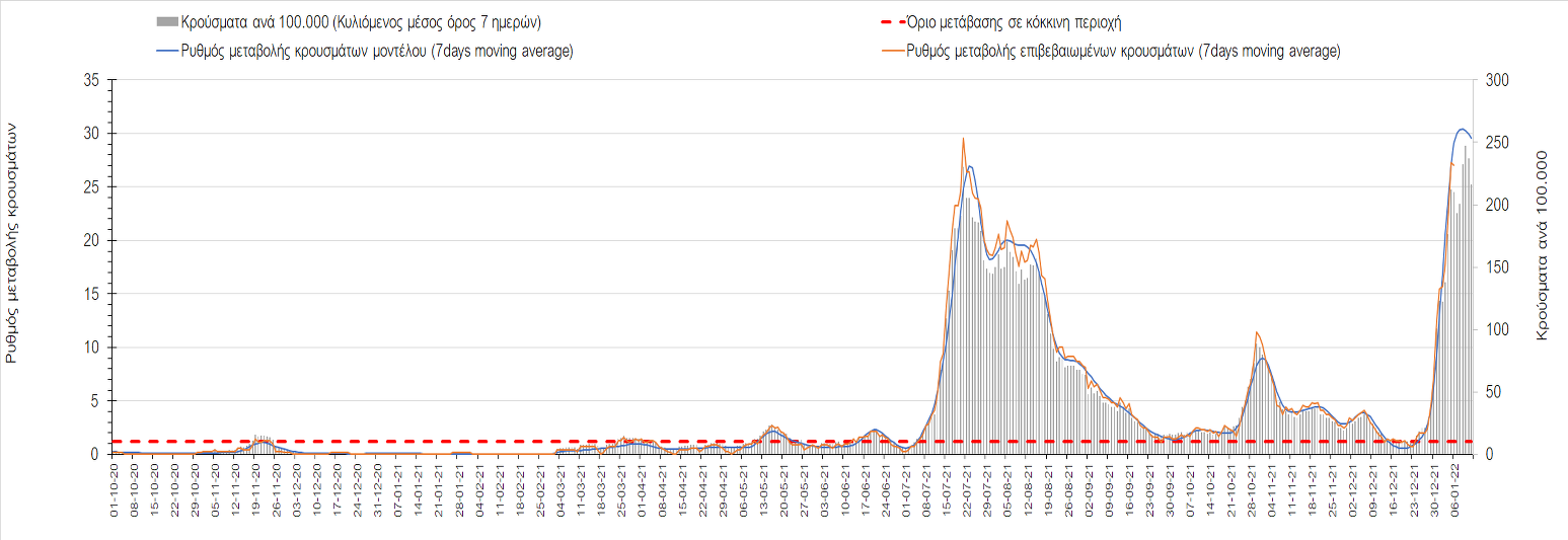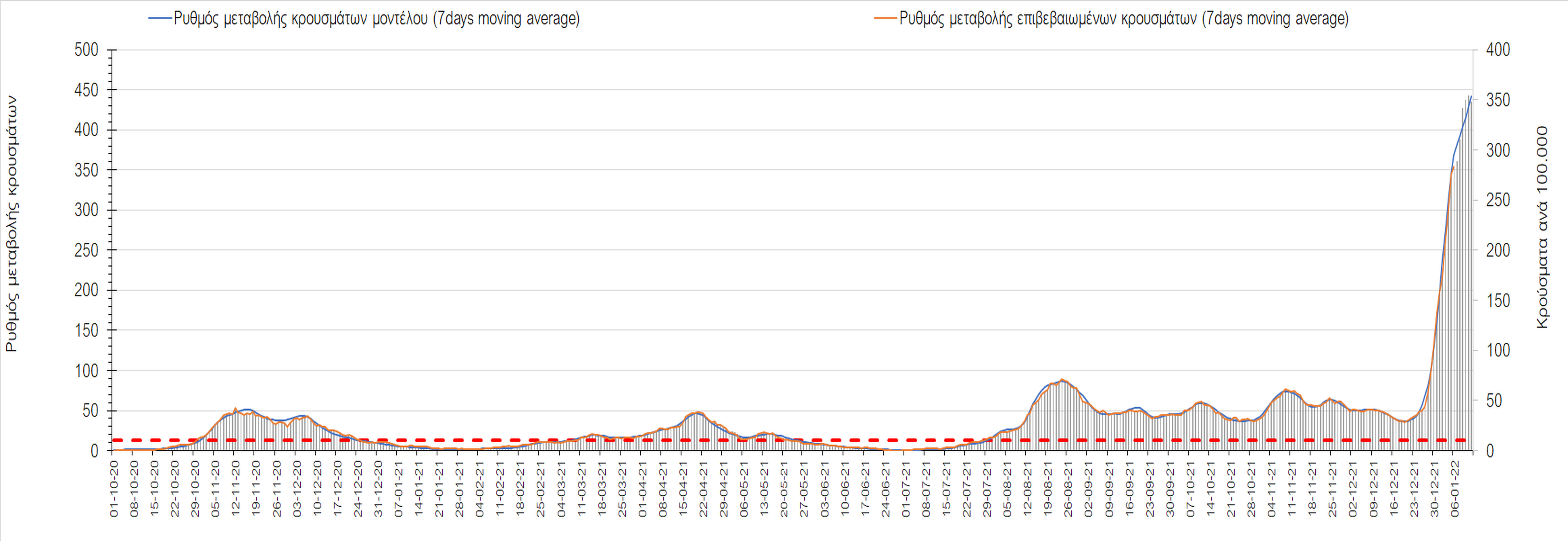 Αυτές τις ημέρες, παρατηρείται σημαντική επιβράδυνση του αριθμού των κρουσμάτων, η οποία ακολούθησε την πολύ έντονη άνοδο, η οποία πλέον είναι αποδεδειγμένο ότι οφείλεται στη διασπορά του στελέχους Ο στον πληθυσμό. Η εκτίμησή μας είναι ότι πάνω από το 95% των νέων κρουσμάτων στην ελληνική επικράτεια αφορά πια στο στέλεχος Ο. Δεδομένου ότι η αύξηση της διασποράς της παραλλαγής Ο στον ελληνικό πληθυσμό εξηγεί την παρατηρούμενη αύξηση της συνολικής διασποράς του ιού, πλέον το βάρος πέφτει στην εφαρμογή των μέτρων αντιμετώπισης της διασποράς του ιού, η οποία προβλέπεται να αναπτυχθεί περαιτέρω σε ακόμη υψηλότερα επίπεδα μέχρι τα μέσα Ιανουαρίου. Σήμερα, μετά από 18 ημέρες, παρατηρείται πτώση του αριθμού των κρουσμάτων (κυλιόμενος μέσος όρος 7 ημερών), και μένει να δούμε στις επόμενες ημέρες, εάν αυτή η μείωση είναι αποτέλεσμα της μη πλήρους καταγραφής των κρουσμάτων λόγω των συνεχόμενων εορταστικών αργιών και συνέχιση της ανοδικής πορείας, ή εάν άρχισε νωρίτερα η κάμψη του 5ου κύματος.