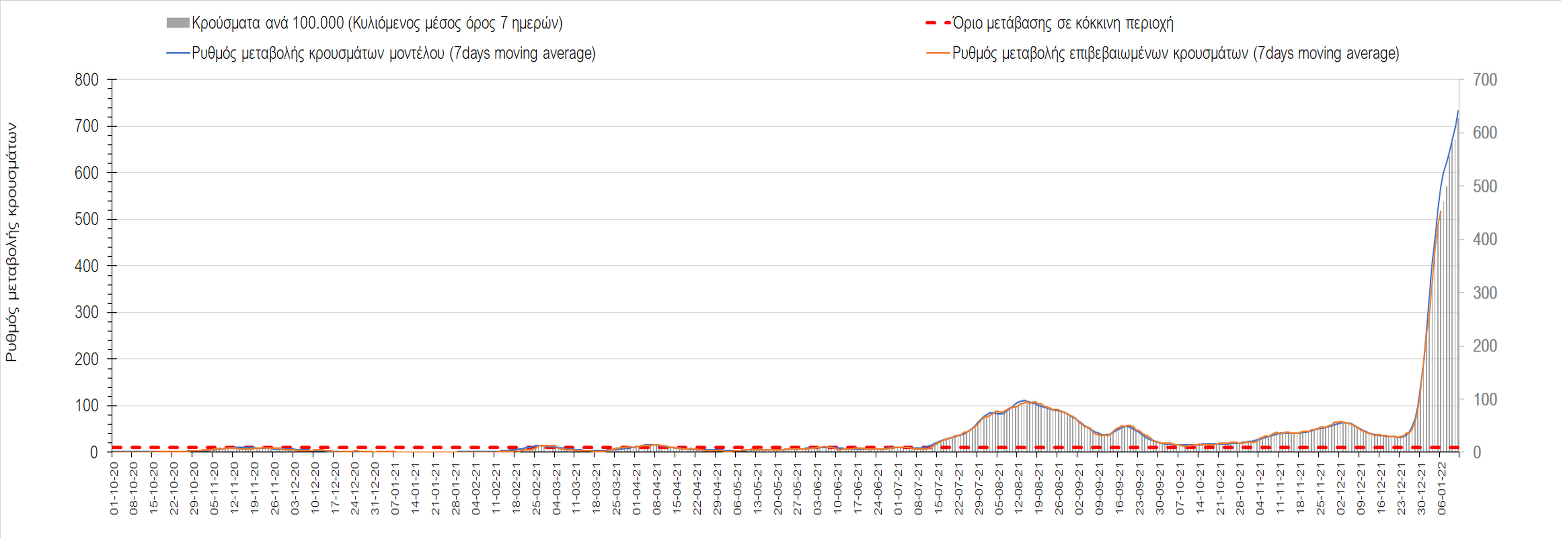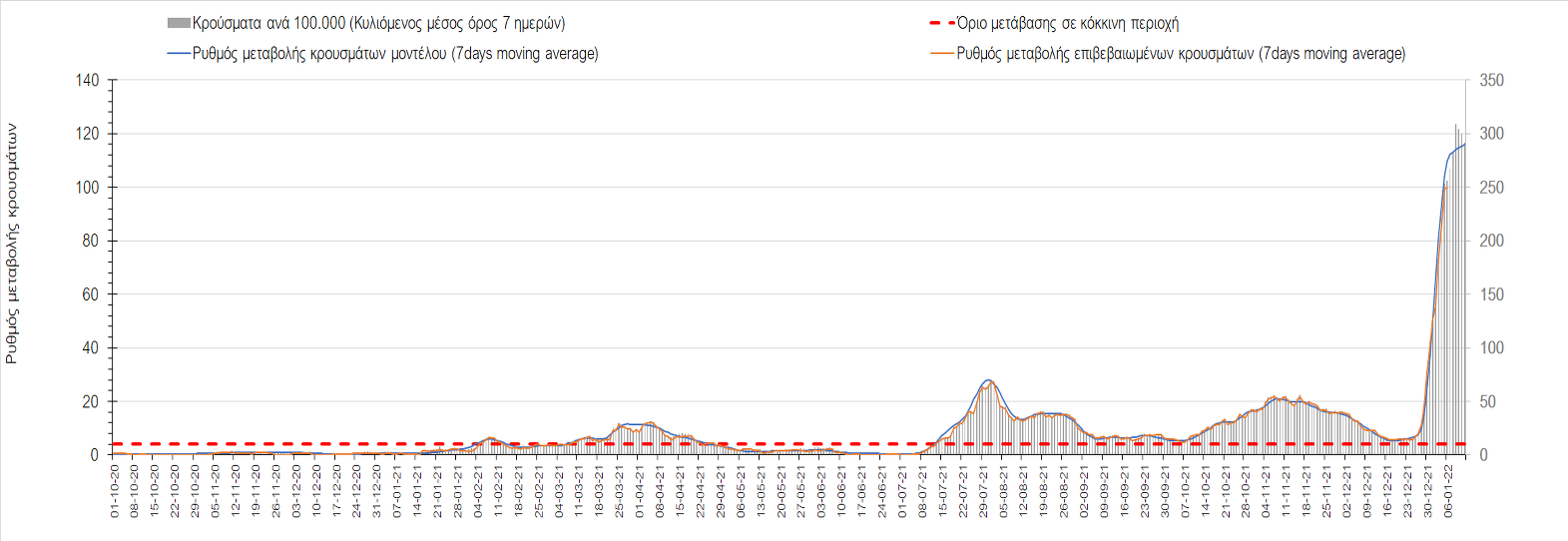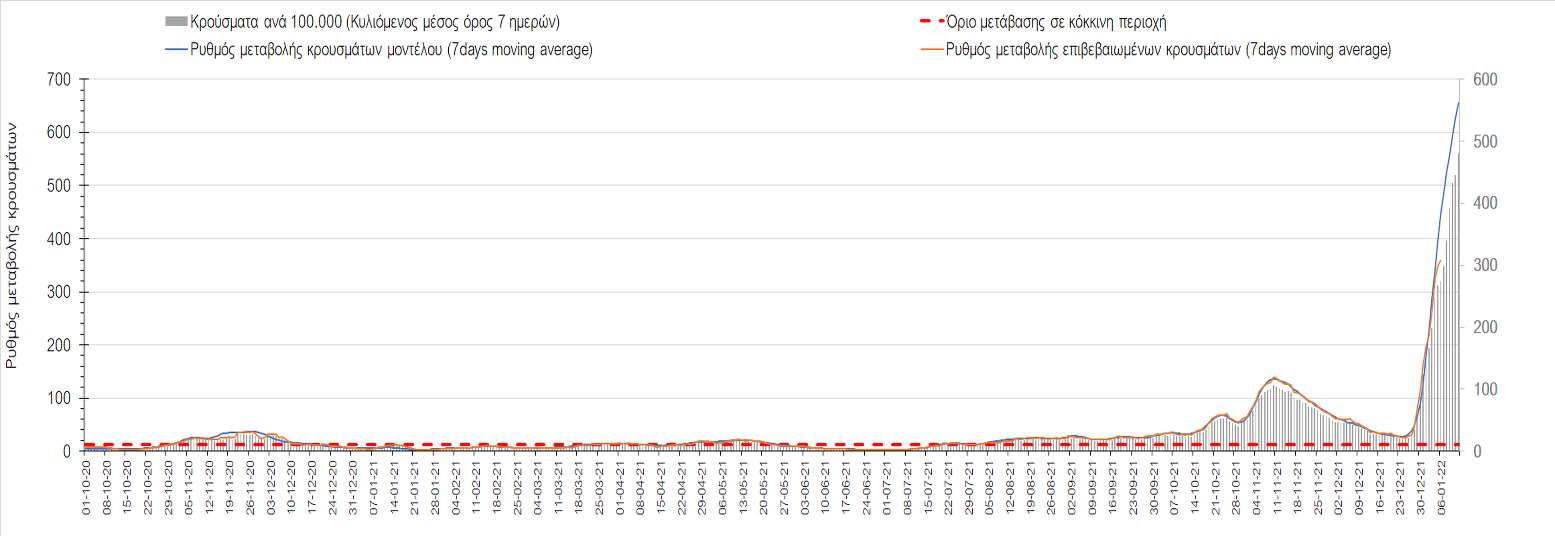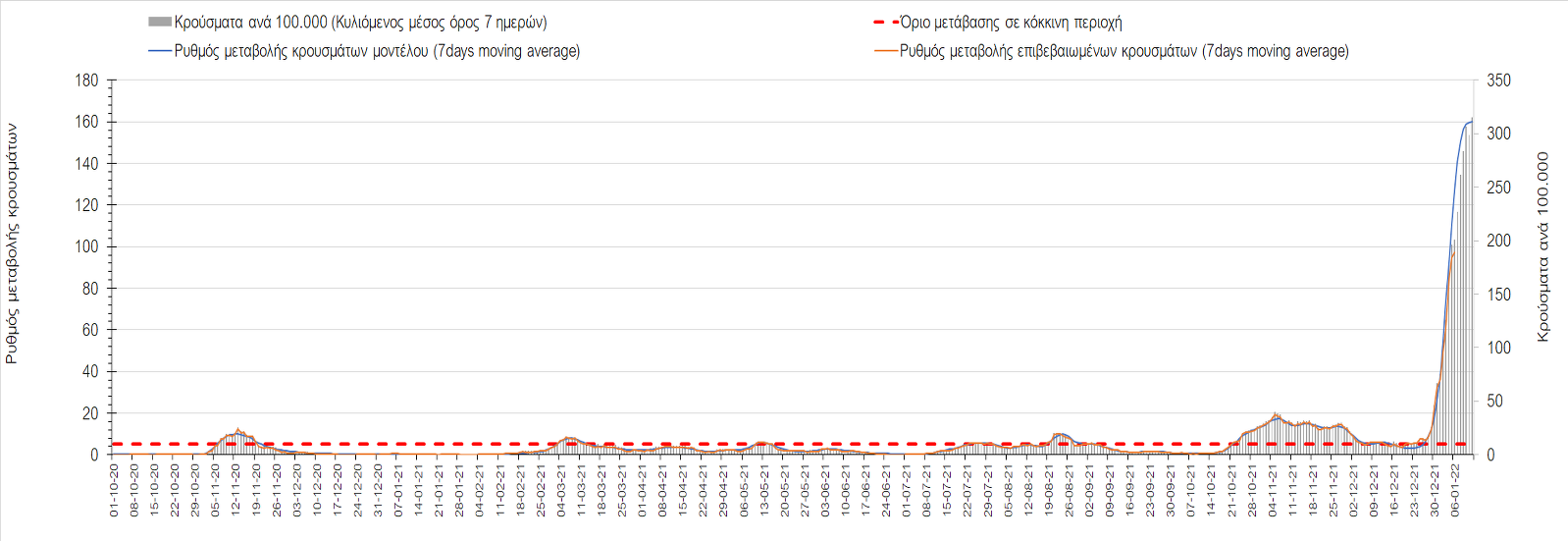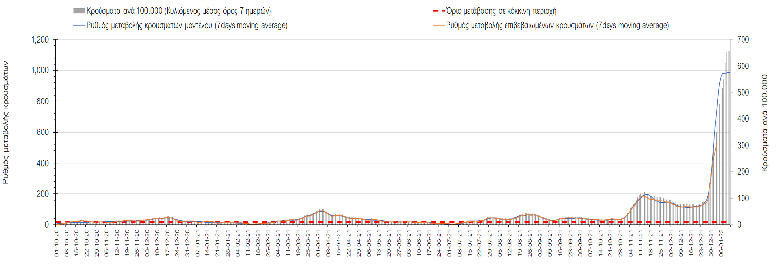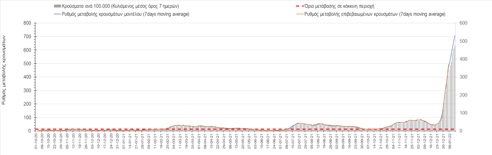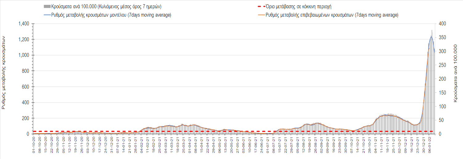 Αυτές τις ημέρες, παρατηρείται σημαντική επιβράδυνση του αριθμού των κρουσμάτων, η οποία ακολούθησε την πολύ έντονη άνοδο, η οποία πλέον είναι αποδεδειγμένο ότι οφείλεται στη διασπορά του στελέχους Ο στον πληθυσμό. Η εκτίμησή μας είναι ότι πάνω από το 95% των νέων κρουσμάτων στην ελληνική επικράτεια αφορά πια στο στέλεχος Ο. Δεδομένου ότι η αύξηση της διασποράς της παραλλαγής Ο στον ελληνικό πληθυσμό εξηγεί την παρατηρούμενη αύξηση της συνολικής διασποράς του ιού, πλέον το βάρος πέφτει στην εφαρμογή των μέτρων αντιμετώπισης της διασποράς του ιού, η οποία προβλέπεται να αναπτυχθεί περαιτέρω σε ακόμη υψηλότερα επίπεδα μέχρι τα μέσα Ιανουαρίου. Σήμερα, μετά από 18 ημέρες, παρατηρείται πτώση του αριθμού των κρουσμάτων (κυλιόμενος μέσος όρος 7 ημερών), και μένει να δούμε στις επόμενες ημέρες, εάν αυτή η μείωση είναι αποτέλεσμα της μη πλήρους καταγραφής των κρουσμάτων λόγω των συνεχόμενων εορταστικών αργιών και συνέχιση της ανοδικής πορείας, ή εάν άρχισε νωρίτερα η κάμψη του 5ου κύματος.