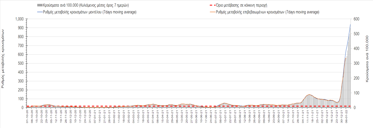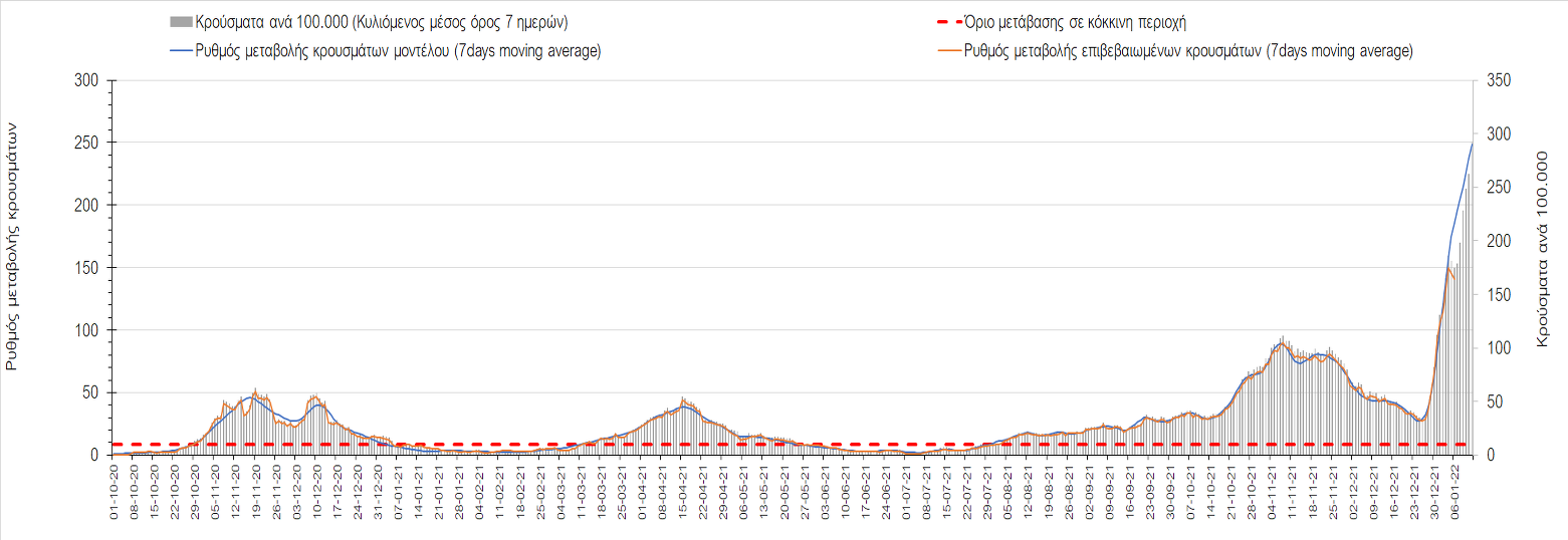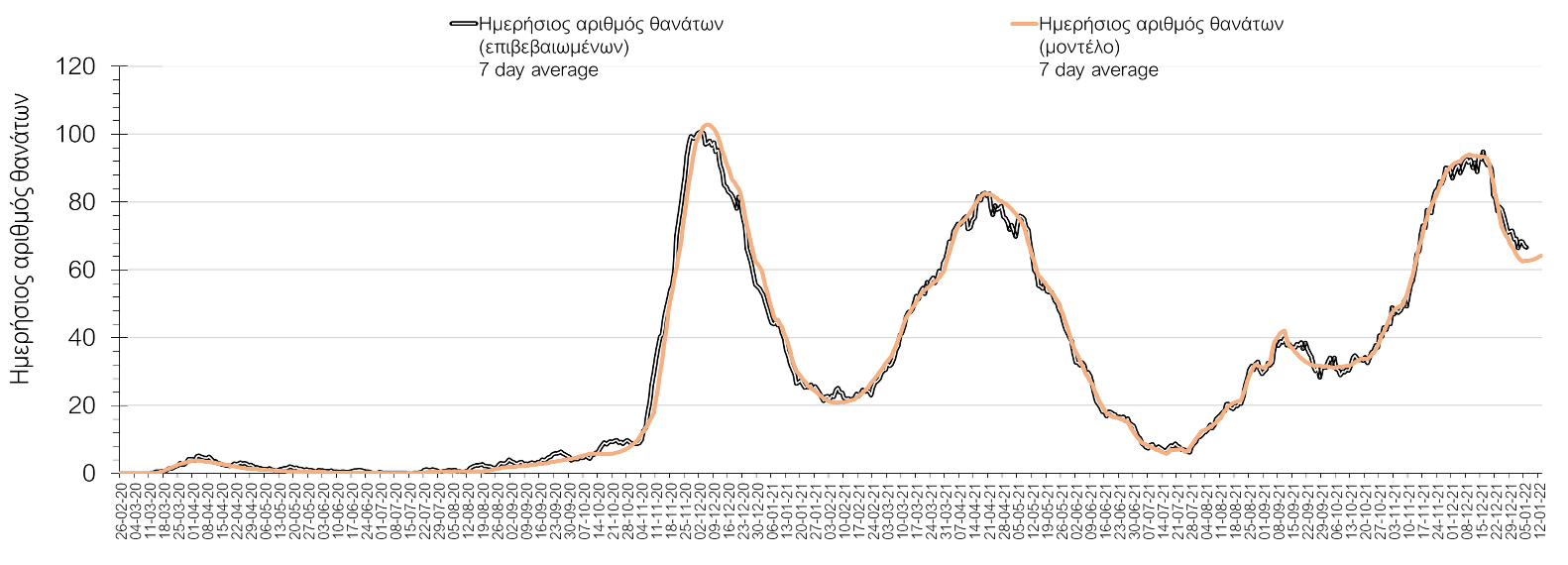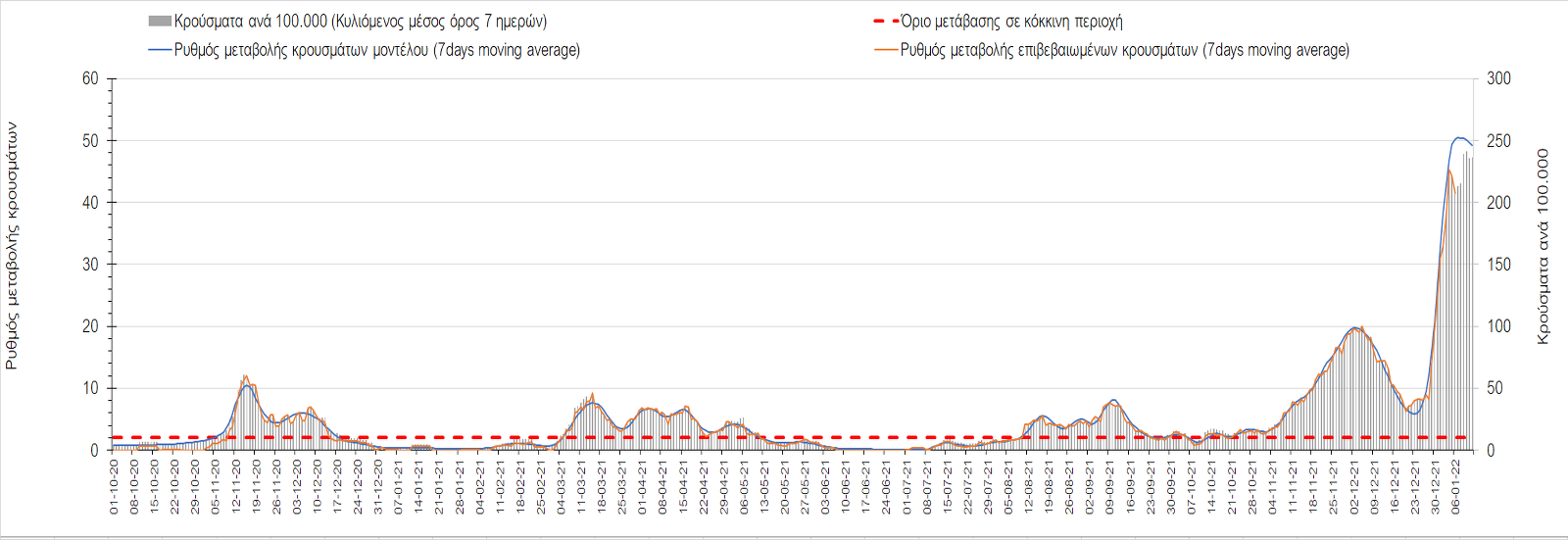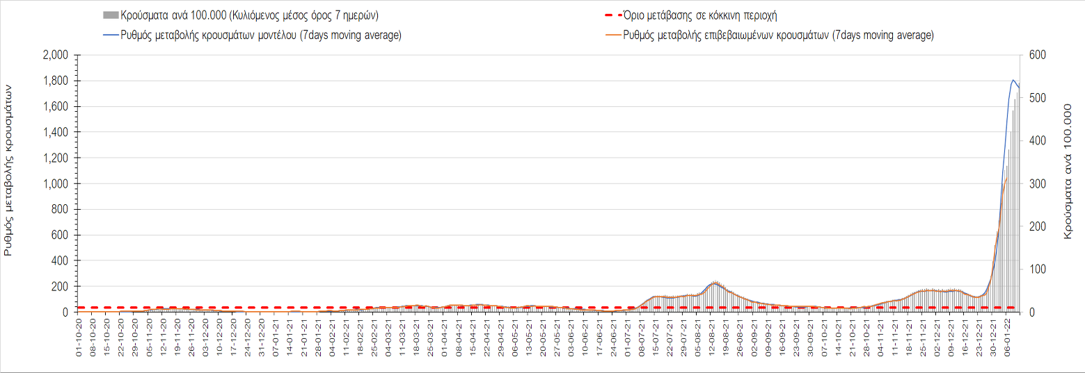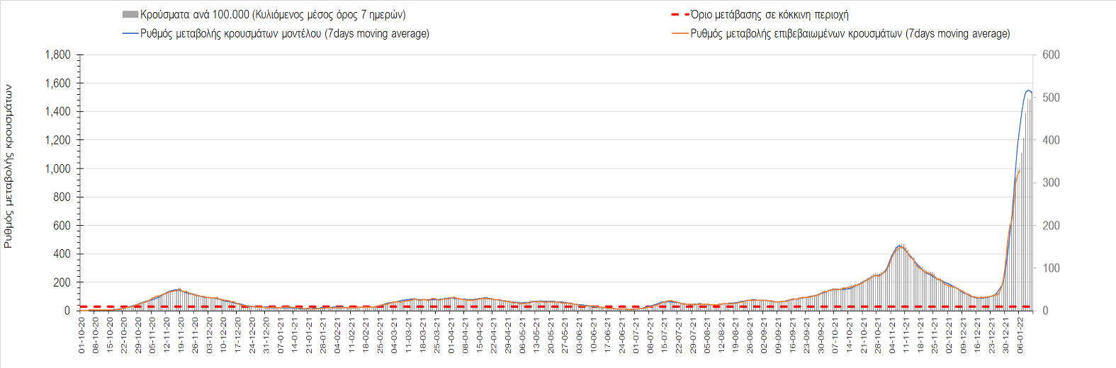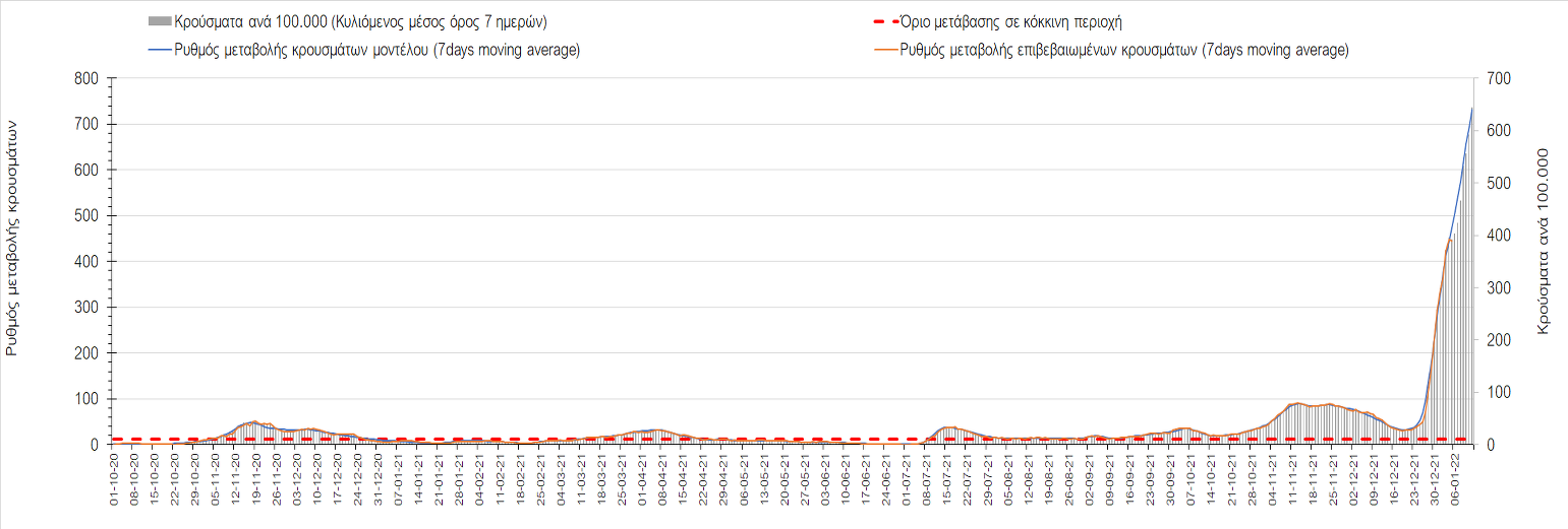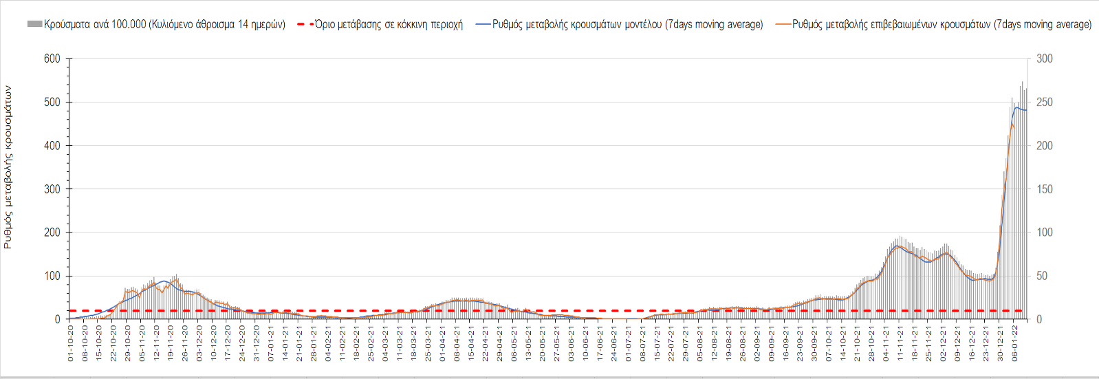 Αυτές τις ημέρες, παρατηρείται σημαντική επιβράδυνση του αριθμού των κρουσμάτων, η οποία ακολούθησε την πολύ έντονη άνοδο, η οποία πλέον είναι αποδεδειγμένο ότι οφείλεται στη διασπορά του στελέχους Ο στον πληθυσμό. Η εκτίμησή μας είναι ότι πάνω από το 95% των νέων κρουσμάτων στην ελληνική επικράτεια αφορά πια στο στέλεχος Ο. Δεδομένου ότι η αύξηση της διασποράς της παραλλαγής Ο στον ελληνικό πληθυσμό εξηγεί την παρατηρούμενη αύξηση της συνολικής διασποράς του ιού, πλέον το βάρος πέφτει στην εφαρμογή των μέτρων αντιμετώπισης της διασποράς του ιού, η οποία προβλέπεται να αναπτυχθεί περαιτέρω σε ακόμη υψηλότερα επίπεδα μέχρι τα μέσα Ιανουαρίου. Σήμερα, μετά από 18 ημέρες, παρατηρείται πτώση του αριθμού των κρουσμάτων (κυλιόμενος μέσος όρος 7 ημερών), και μένει να δούμε στις επόμενες ημέρες, εάν αυτή η μείωση είναι αποτέλεσμα της μη πλήρους καταγραφής των κρουσμάτων λόγω των συνεχόμενων εορταστικών αργιών και συνέχιση της ανοδικής πορείας, ή εάν άρχισε νωρίτερα η κάμψη του 5ου κύματος.