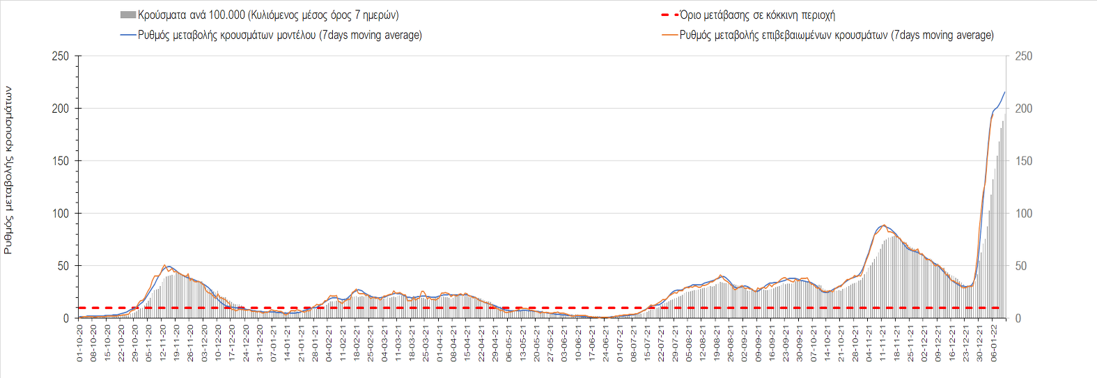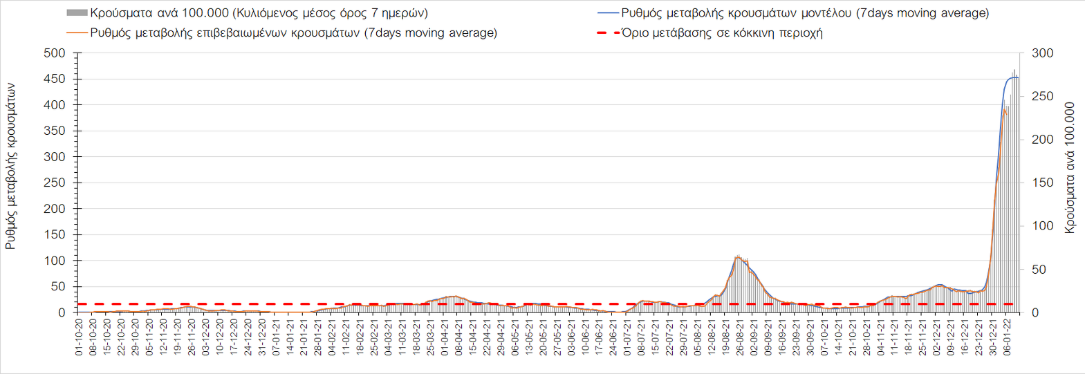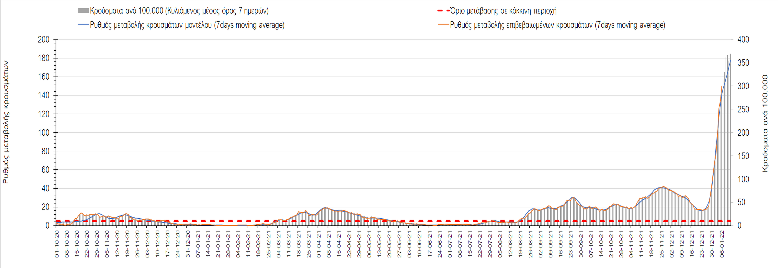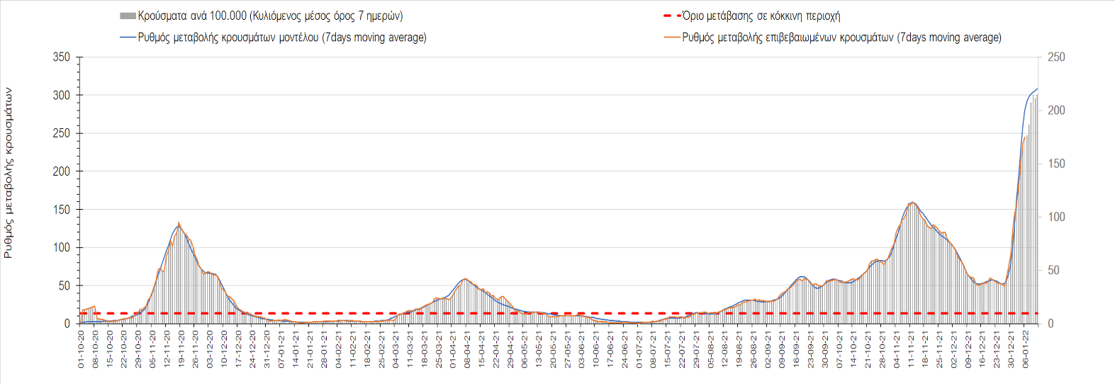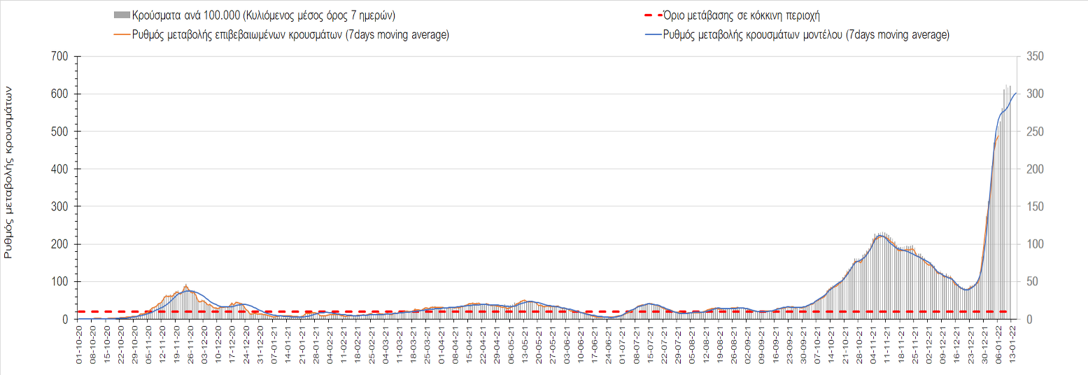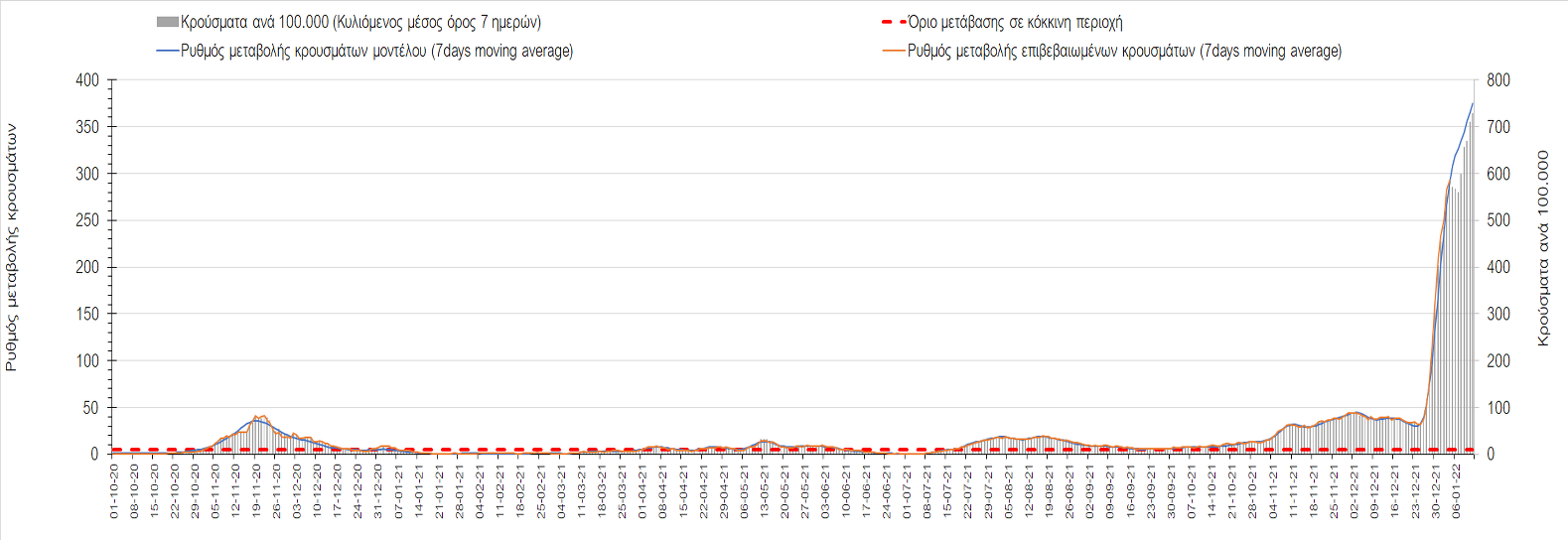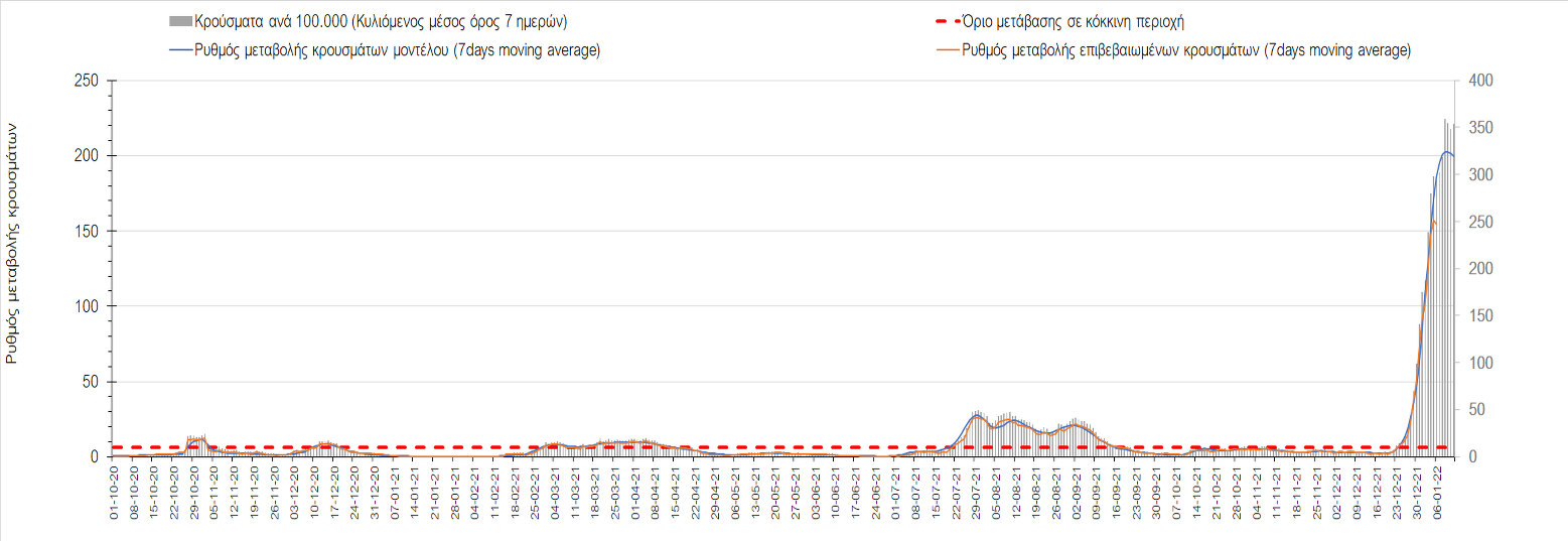 Αυτές τις ημέρες, παρατηρείται σημαντική επιβράδυνση του αριθμού των κρουσμάτων, η οποία ακολούθησε την πολύ έντονη άνοδο, η οποία πλέον είναι αποδεδειγμένο ότι οφείλεται στη διασπορά του στελέχους Ο στον πληθυσμό. Η εκτίμησή μας είναι ότι πάνω από το 95% των νέων κρουσμάτων στην ελληνική επικράτεια αφορά πια στο στέλεχος Ο. Δεδομένου ότι η αύξηση της διασποράς της παραλλαγής Ο στον ελληνικό πληθυσμό εξηγεί την παρατηρούμενη αύξηση της συνολικής διασποράς του ιού, πλέον το βάρος πέφτει στην εφαρμογή των μέτρων αντιμετώπισης της διασποράς του ιού, η οποία προβλέπεται να αναπτυχθεί περαιτέρω σε ακόμη υψηλότερα επίπεδα μέχρι τα μέσα Ιανουαρίου. Σήμερα, μετά από 18 ημέρες, παρατηρείται πτώση του αριθμού των κρουσμάτων (κυλιόμενος μέσος όρος 7 ημερών), και μένει να δούμε στις επόμενες ημέρες, εάν αυτή η μείωση είναι αποτέλεσμα της μη πλήρους καταγραφής των κρουσμάτων λόγω των συνεχόμενων εορταστικών αργιών και συνέχιση της ανοδικής πορείας, ή εάν άρχισε νωρίτερα η κάμψη του 5ου κύματος.