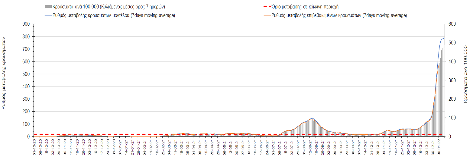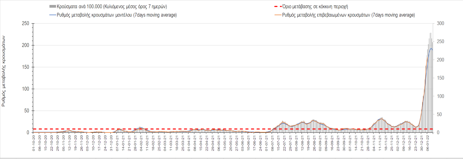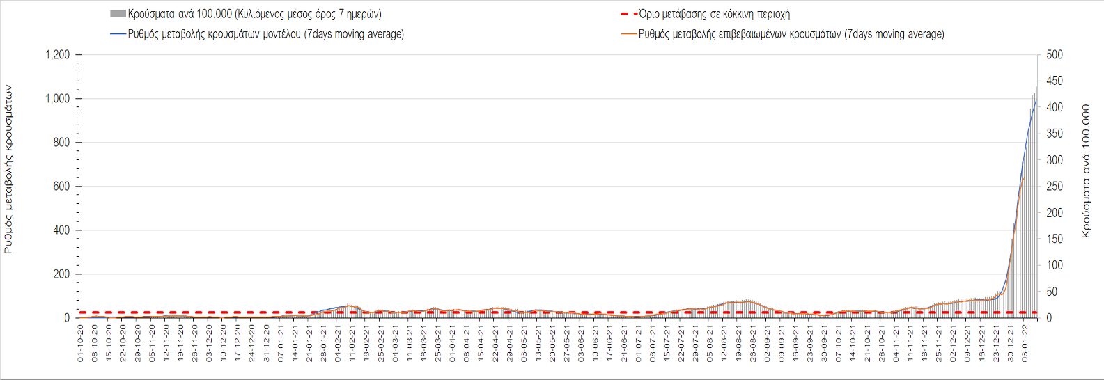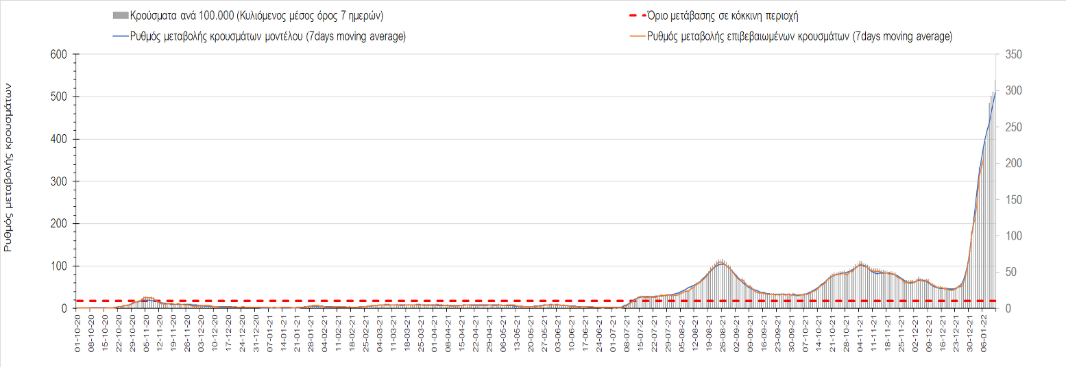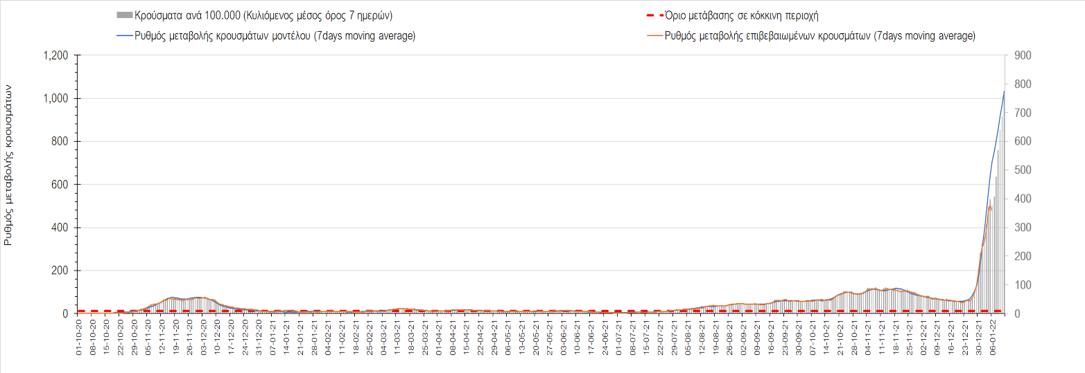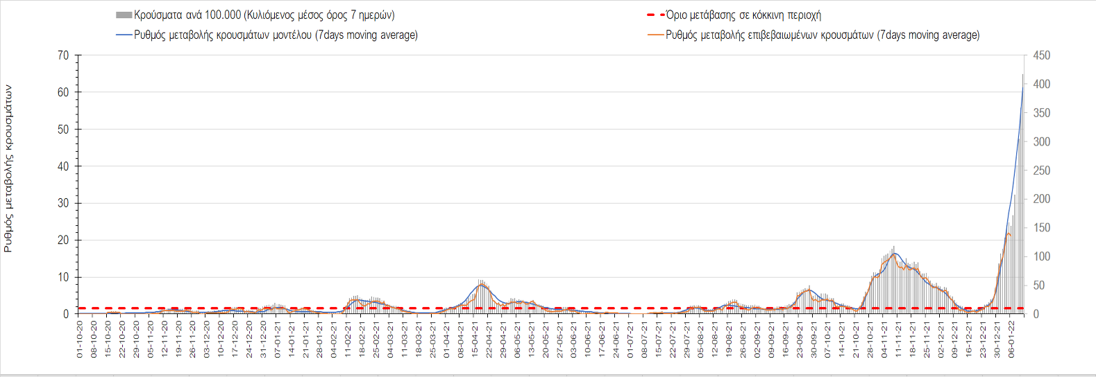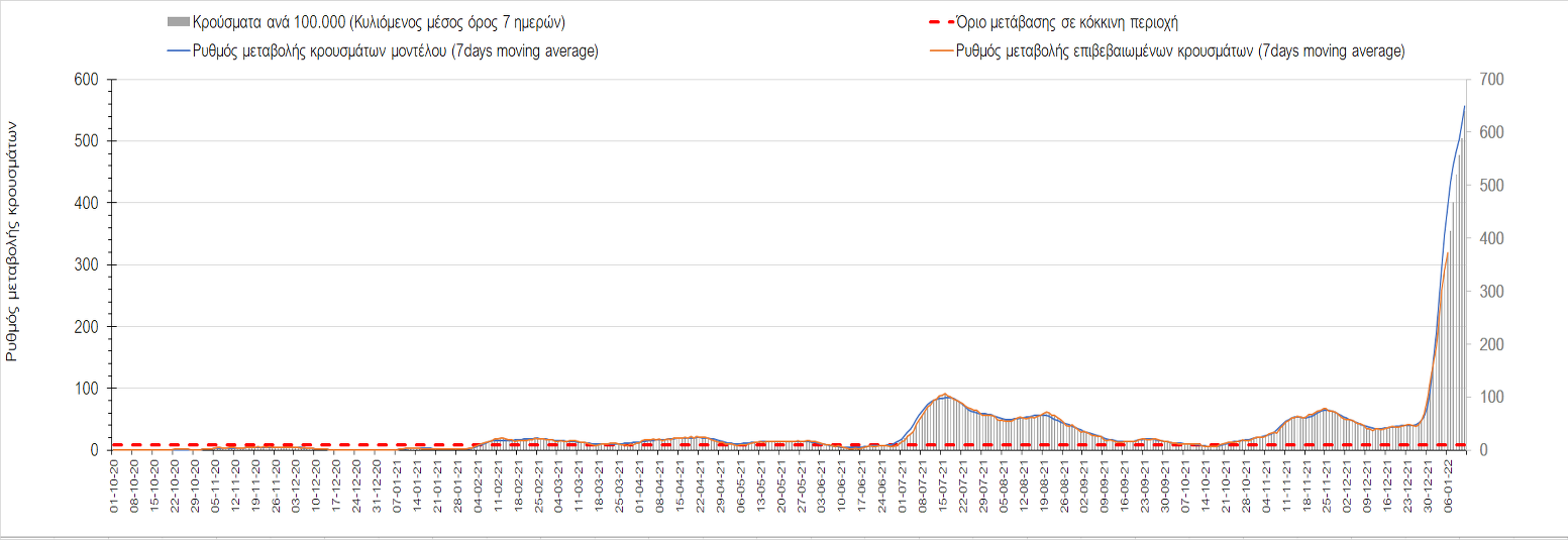 Αυτές τις ημέρες, παρατηρείται σημαντική επιβράδυνση του αριθμού των κρουσμάτων, η οποία ακολούθησε την πολύ έντονη άνοδο, η οποία πλέον είναι αποδεδειγμένο ότι οφείλεται στη διασπορά του στελέχους Ο στον πληθυσμό. Η εκτίμησή μας είναι ότι πάνω από το 95% των νέων κρουσμάτων στην ελληνική επικράτεια αφορά πια στο στέλεχος Ο. Δεδομένου ότι η αύξηση της διασποράς της παραλλαγής Ο στον ελληνικό πληθυσμό εξηγεί την παρατηρούμενη αύξηση της συνολικής διασποράς του ιού, πλέον το βάρος πέφτει στην εφαρμογή των μέτρων αντιμετώπισης της διασποράς του ιού, η οποία προβλέπεται να αναπτυχθεί περαιτέρω σε ακόμη υψηλότερα επίπεδα μέχρι τα μέσα Ιανουαρίου. Σήμερα, μετά από 18 ημέρες, παρατηρείται πτώση του αριθμού των κρουσμάτων (κυλιόμενος μέσος όρος 7 ημερών), και μένει να δούμε στις επόμενες ημέρες, εάν αυτή η μείωση είναι αποτέλεσμα της μη πλήρους καταγραφής των κρουσμάτων λόγω των συνεχόμενων εορταστικών αργιών και συνέχιση της ανοδικής πορείας, ή εάν άρχισε νωρίτερα η κάμψη του 5ου κύματος.
