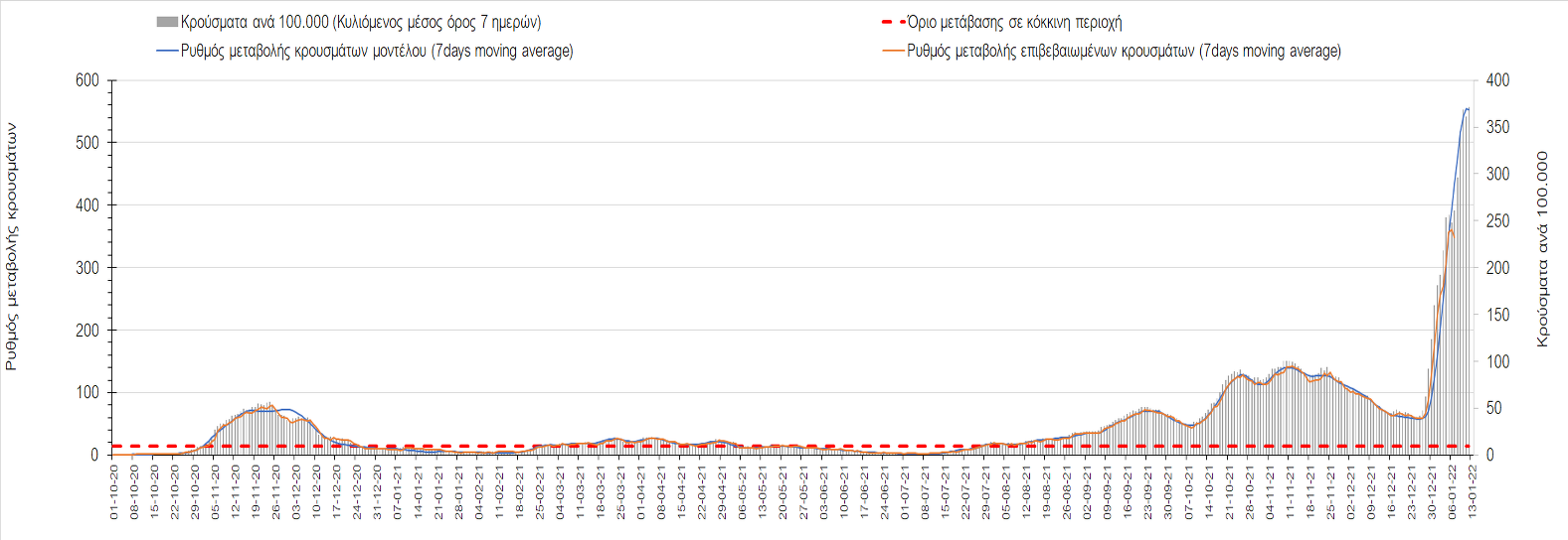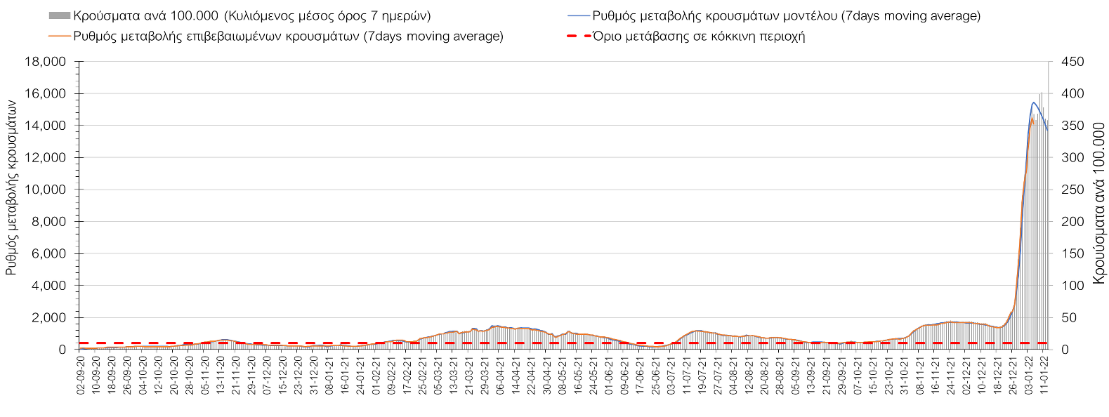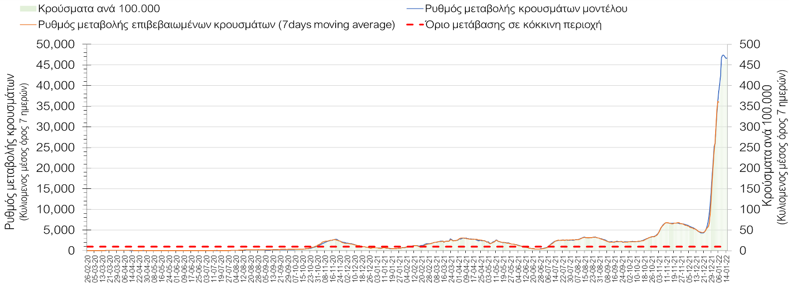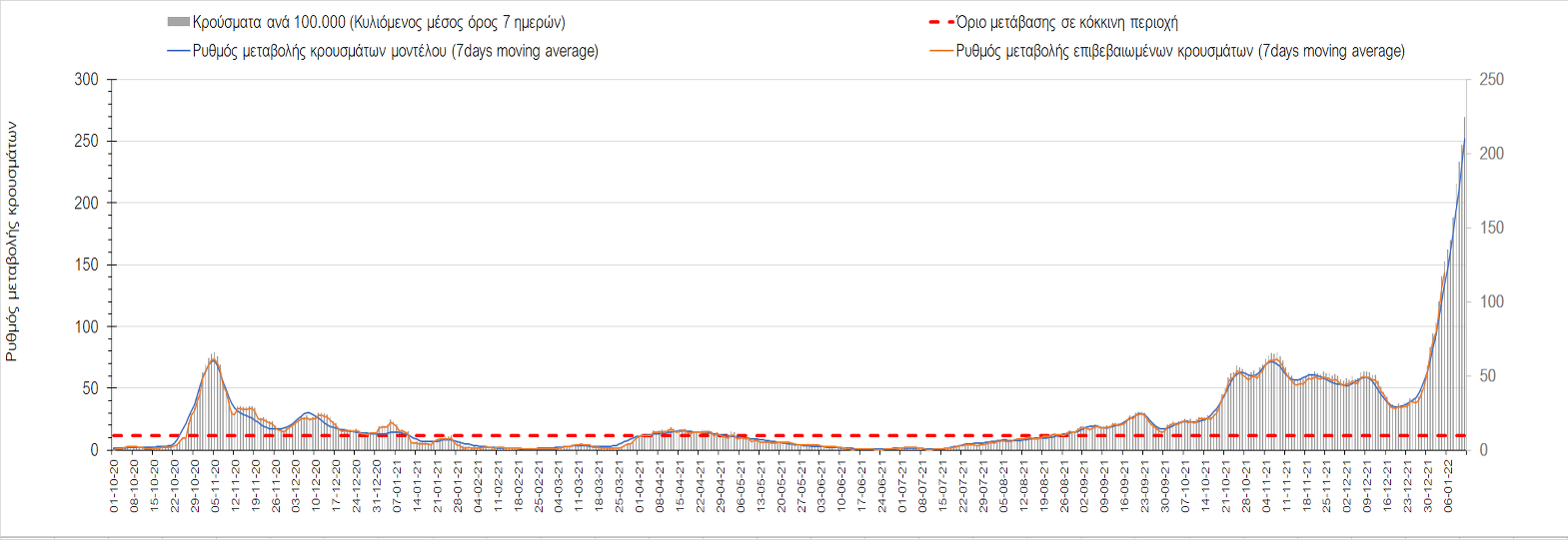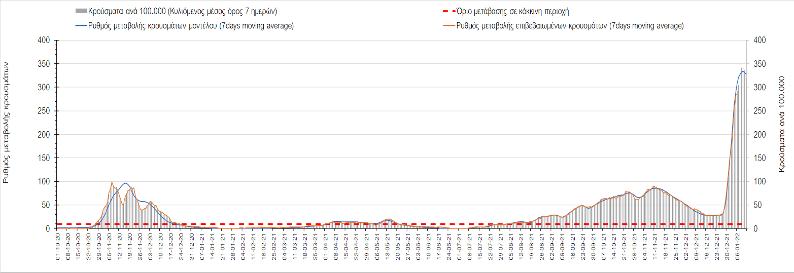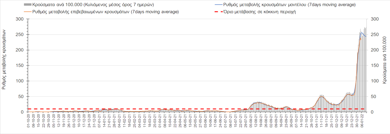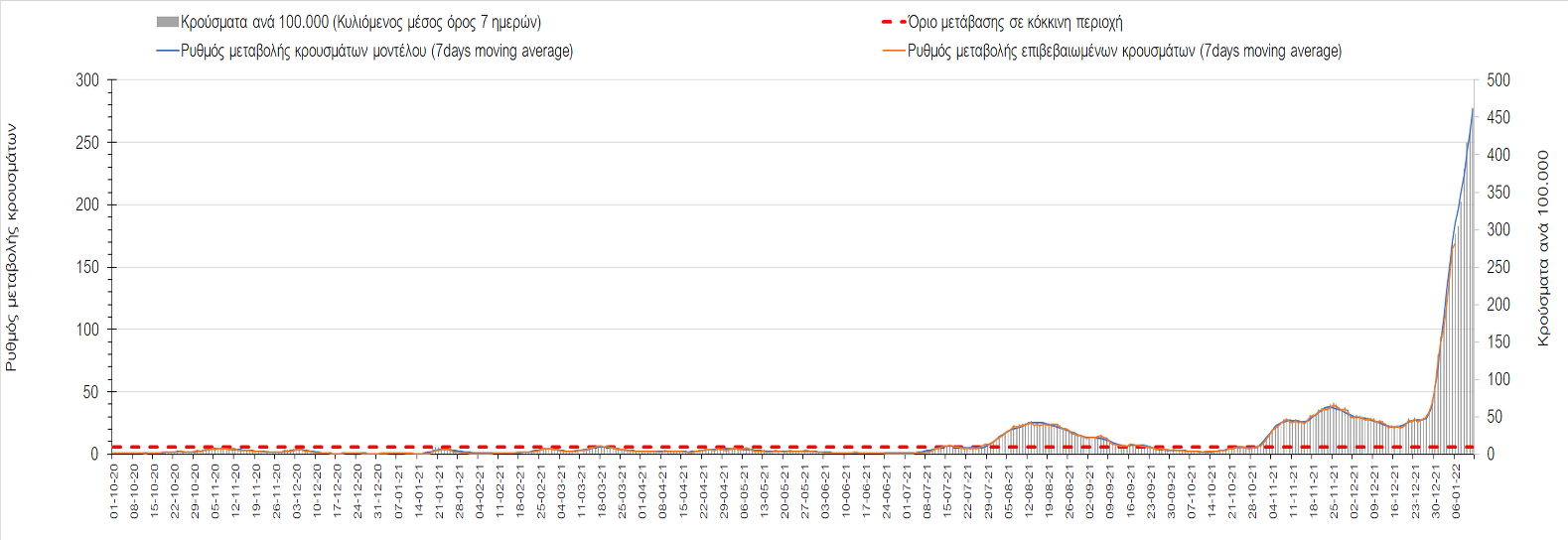 Αυτές τις ημέρες, παρατηρείται σημαντική επιβράδυνση του αριθμού των κρουσμάτων, η οποία ακολούθησε την πολύ έντονη άνοδο, η οποία πλέον είναι αποδεδειγμένο ότι οφείλεται στη διασπορά του στελέχους Ο στον πληθυσμό. Η εκτίμησή μας είναι ότι πάνω από το 95% των νέων κρουσμάτων στην ελληνική επικράτεια αφορά πια στο στέλεχος Ο. Δεδομένου ότι η αύξηση της διασποράς της παραλλαγής Ο στον ελληνικό πληθυσμό εξηγεί την παρατηρούμενη αύξηση της συνολικής διασποράς του ιού, πλέον το βάρος πέφτει στην εφαρμογή των μέτρων αντιμετώπισης της διασποράς του ιού, η οποία προβλέπεται να αναπτυχθεί περαιτέρω σε ακόμη υψηλότερα επίπεδα μέχρι τα μέσα Ιανουαρίου. Σήμερα, μετά από 18 ημέρες, παρατηρείται πτώση του αριθμού των κρουσμάτων (κυλιόμενος μέσος όρος 7 ημερών), και μένει να δούμε στις επόμενες ημέρες, εάν αυτή η μείωση είναι αποτέλεσμα της μη πλήρους καταγραφής των κρουσμάτων λόγω των συνεχόμενων εορταστικών αργιών και συνέχιση της ανοδικής πορείας, ή εάν άρχισε νωρίτερα η κάμψη του 5ου κύματος.