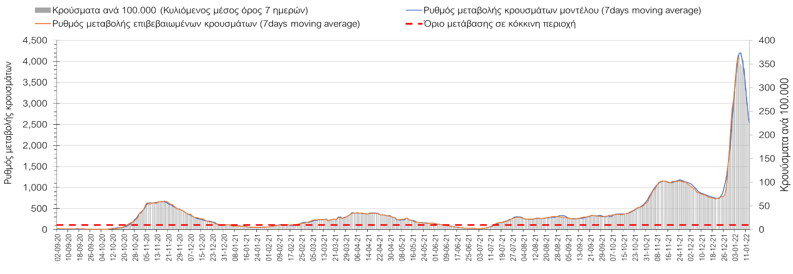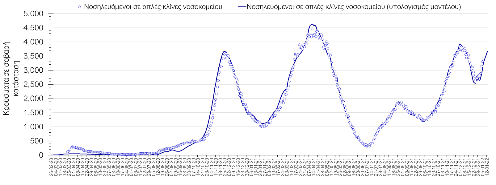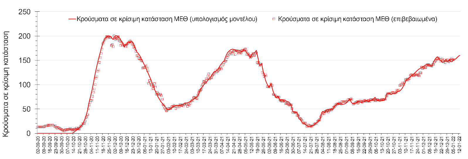Η πορεία της μέσης εβδομαδιαίας τιμής των κρουσμάτων, καθώς και του κυλιόμενου μέσου όρου 7 ημερών του αριθμού των κρουσμάτων ανά 100.000 πληθυσμού, όπως έχουν καταγραφεί από τον ΕΟΔΥ και η αναμενόμενη πορεία τους όπως προδιαγράφεται από την υπολογιστική πλατφόρμα CORE για την Ελληνική επικράτεια μέχρι τις 15  Ιανουαρίου, αποτυπώνονται στο Σχήμα 4. Αυτή η προβλεπόμενη πορεία, που αφορά τα κρούσματα, τους νοσηλευόμενους σε απλές κλίνες, όσο και σε ΜΕΘ, καθώς επίσης και τους θανάτους, βασίζεται στις ακόλουθες παραδοχές: