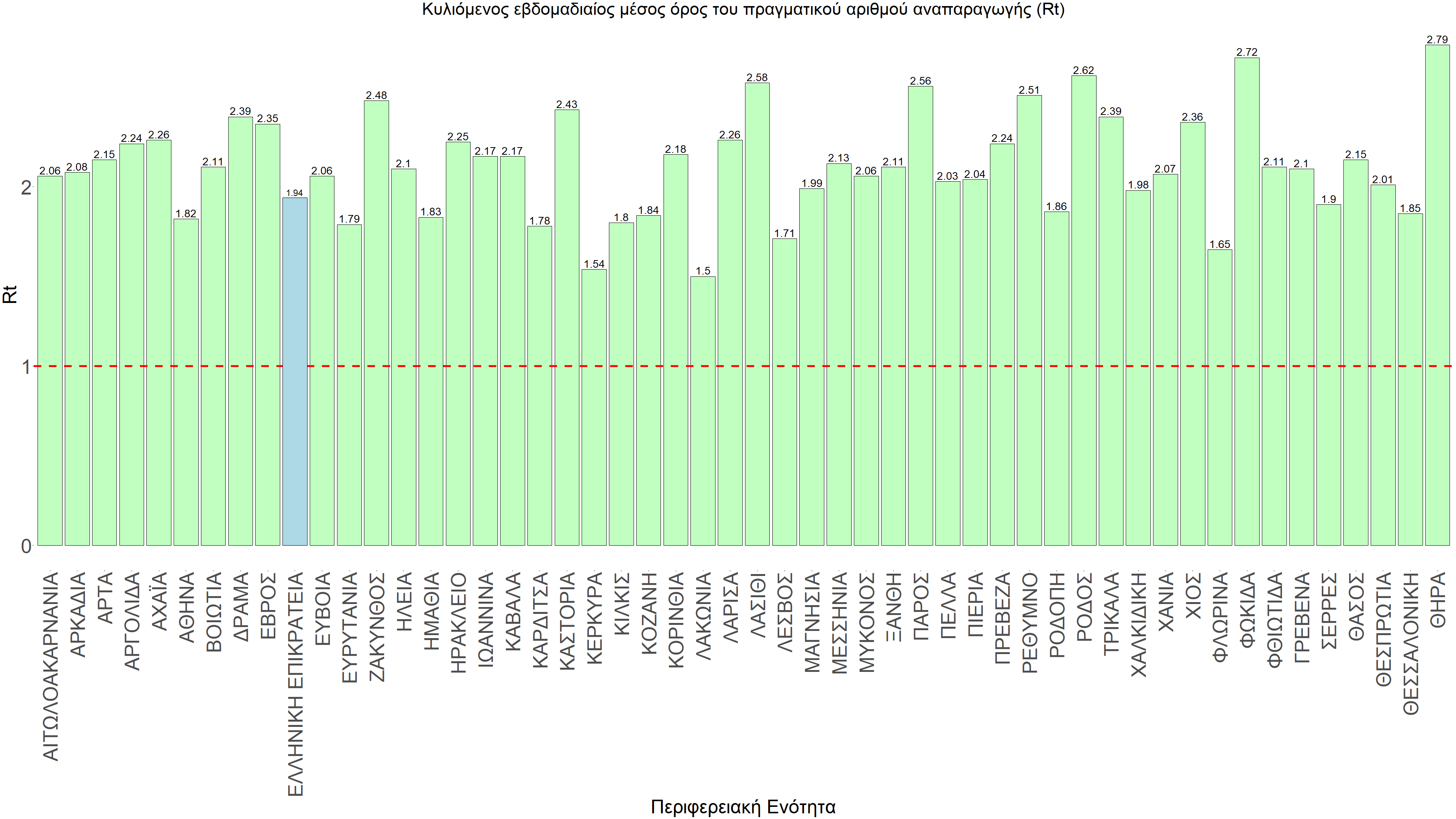 O πραγματικός αριθμός αναπαραγωγής Rt ανά περιφερειακή ενότητα της χώρας παρουσιάζεται στο Σχήμα 58.