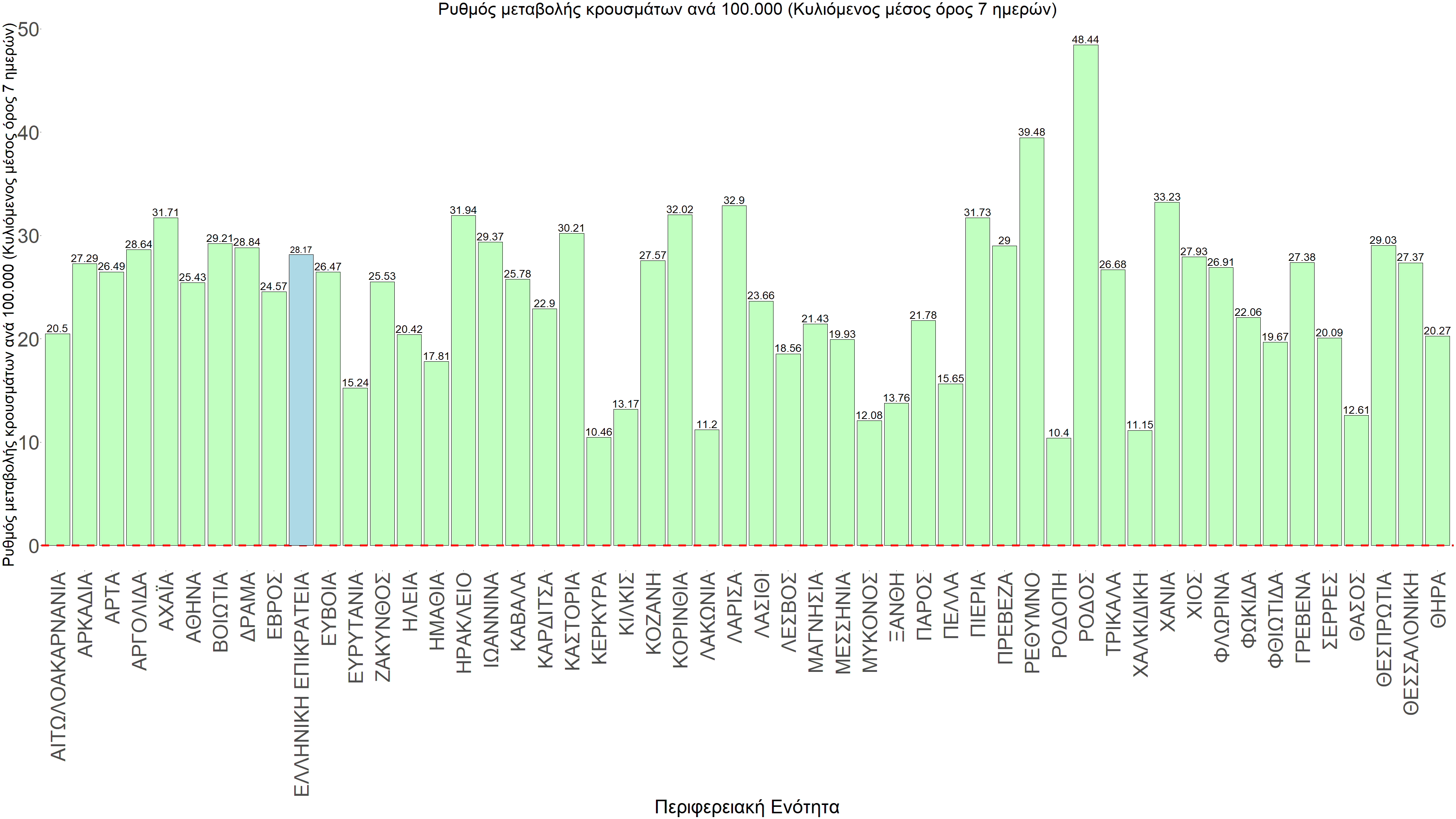Η αποτύπωση των τάσεων στις επιμέρους περιοχές, παρουσιάζεται στο Σχήμα 61, όπου παρουσιάζεται ο ρυθμός μεταβολής των νέων κρουσμάτων ανά 100.000 κατοίκους (κυλιόμενος μέσος όρος 7 ημερών) των επιμέρους περιοχών. Θετικές τιμές του ρυθμού μεταβολής υποδηλώνουν άνοδο, ενώ αρνητικές τιμές υποδηλώνουν πτωτική πορεία. Το σχήμα αυτό είναι ιδιαίτερα κατατοπιστικό, γιατί οι τιμές που παρουσιάζονται είναι κανονικοποιημένες ως προς τον πληθυσμό, και η σύγκριση των τάσεων ανάμεσα στις επιμέρους περιοχές είναι άμεση.