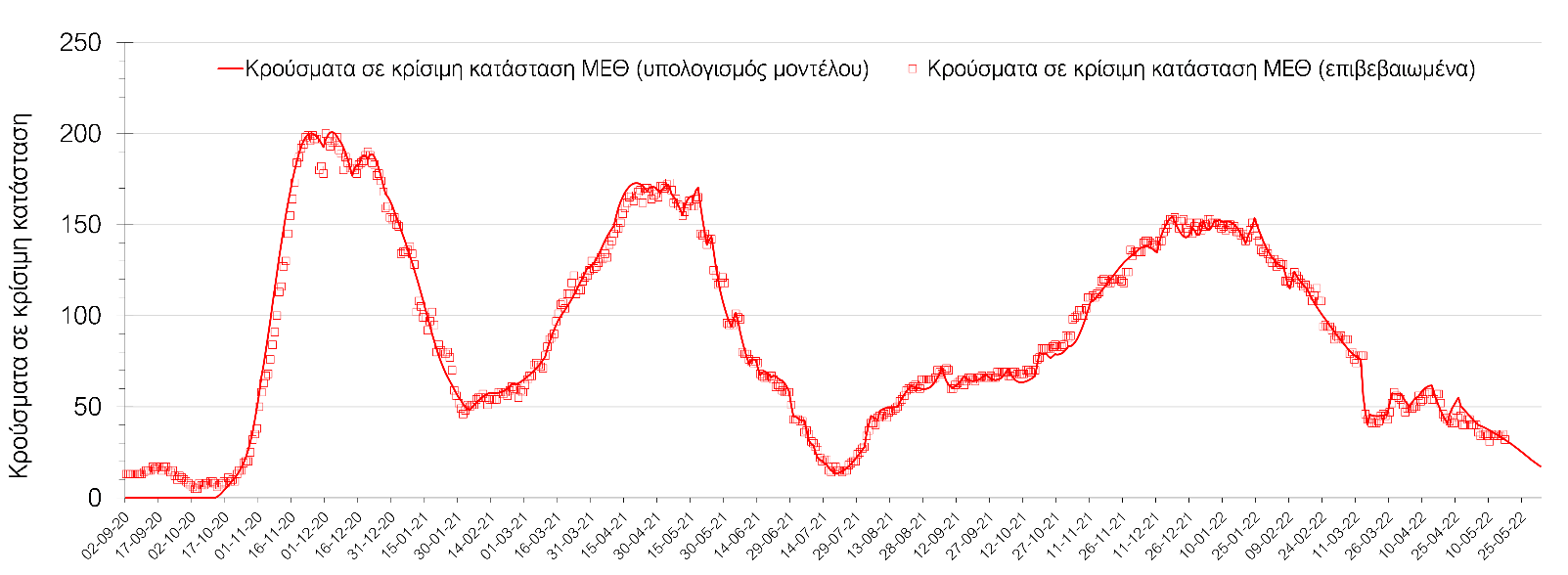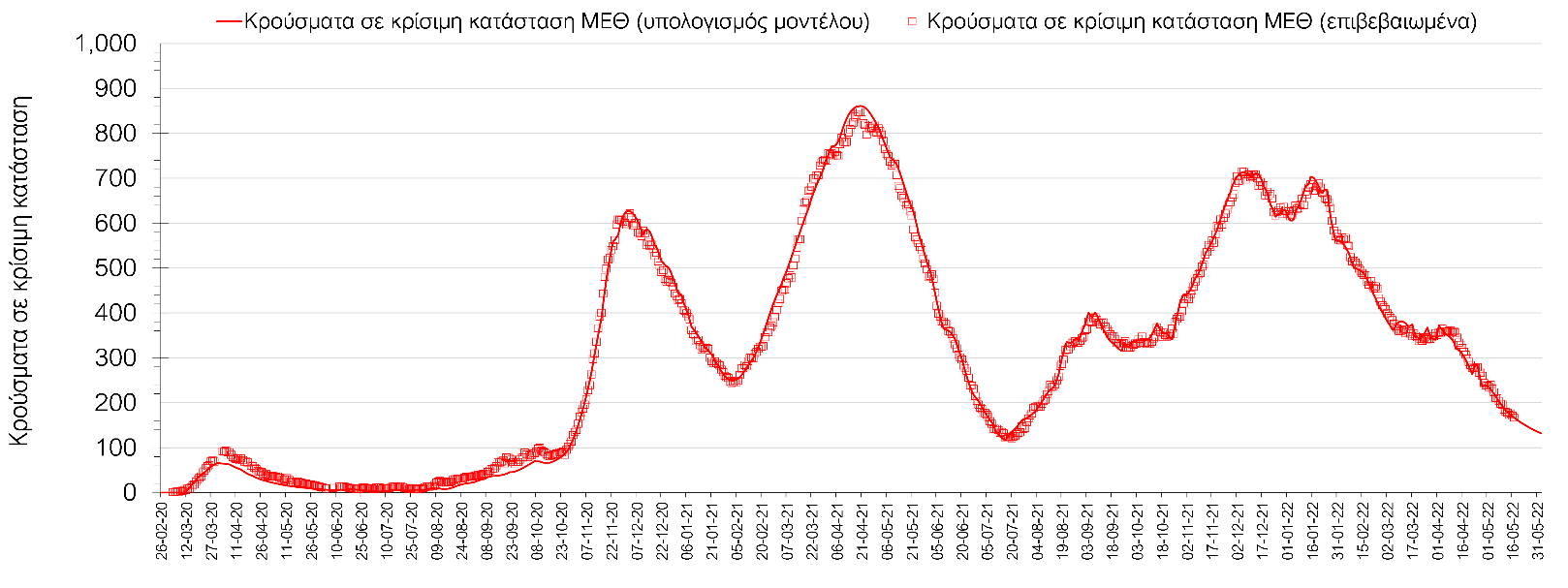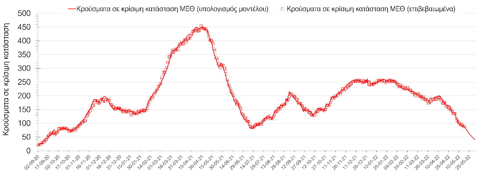 Όσον αφορά στους ασθενείς σε κρίσιμη κατάσταση (διασωληνωμένοι σε ΜΕΘ), ο αριθμός είναι μειωμένος σε σχέση με τη Δευτέρα (167 από 171). Η καμπύλη εξέλιξης του αριθμού των ασθενών που νοσηλεύονται σε κλίνες ΜΕΘ με βάση τις προσομοιώσεις της πλατφόρμας CORE, παρουσιάζεται στο Σχήμα 1, των ασθενών που νοσηλεύονται σε απλές κλίνες στο Σχήμα 2, ενώ η εκτίμησή μας για την πορεία των θανάτων ανά ημέρα παρουσιάζεται στο Σχήμα 3.